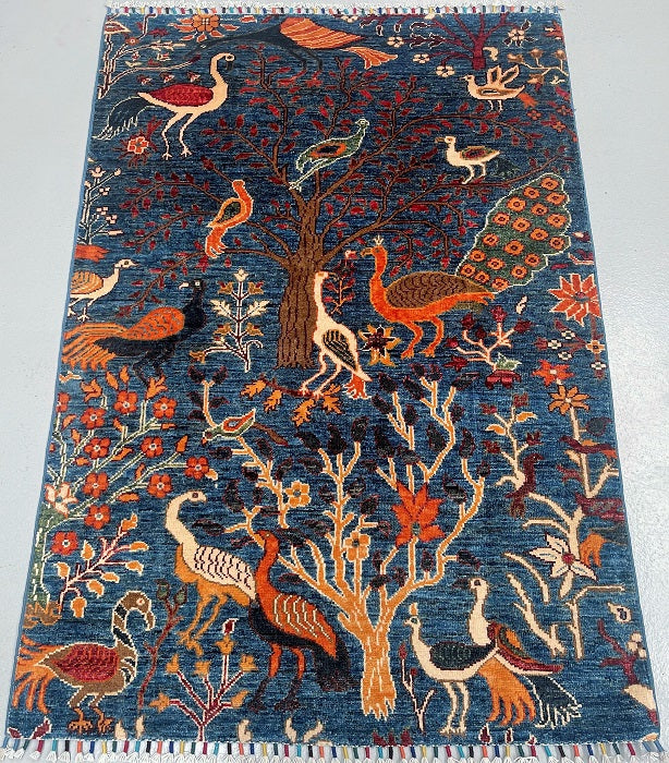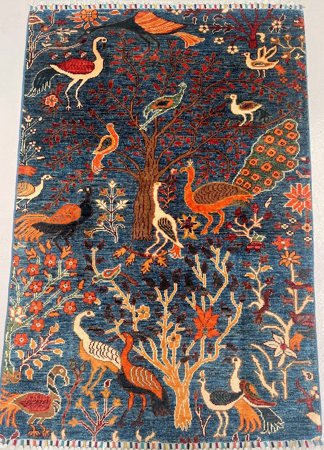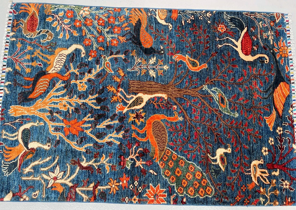 Decorative Coffee Table Size Genuine Hand Knotted Afghan Chobi Rug. Above All It Has A Pure Hand Spun Wool Pile On Cotton Base. Blue Background Dyed Using Traditional Methods (Vegetable Dyes). Last Of True Woven Nomadic Art.