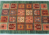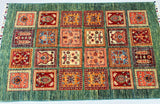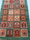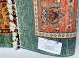 Coffee Table Size Authentic Handmade Afghan Super Kazak Rug. Above All It Is Pure Hand Spun Wool Pile On Cotton Base. Green Tone Dyed Using Traditional Methods (Vegetable Dyes). Last Of True Woven Nomadic Art.