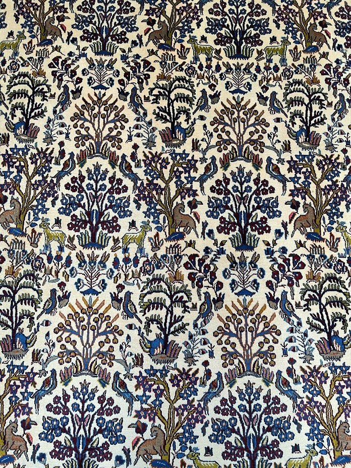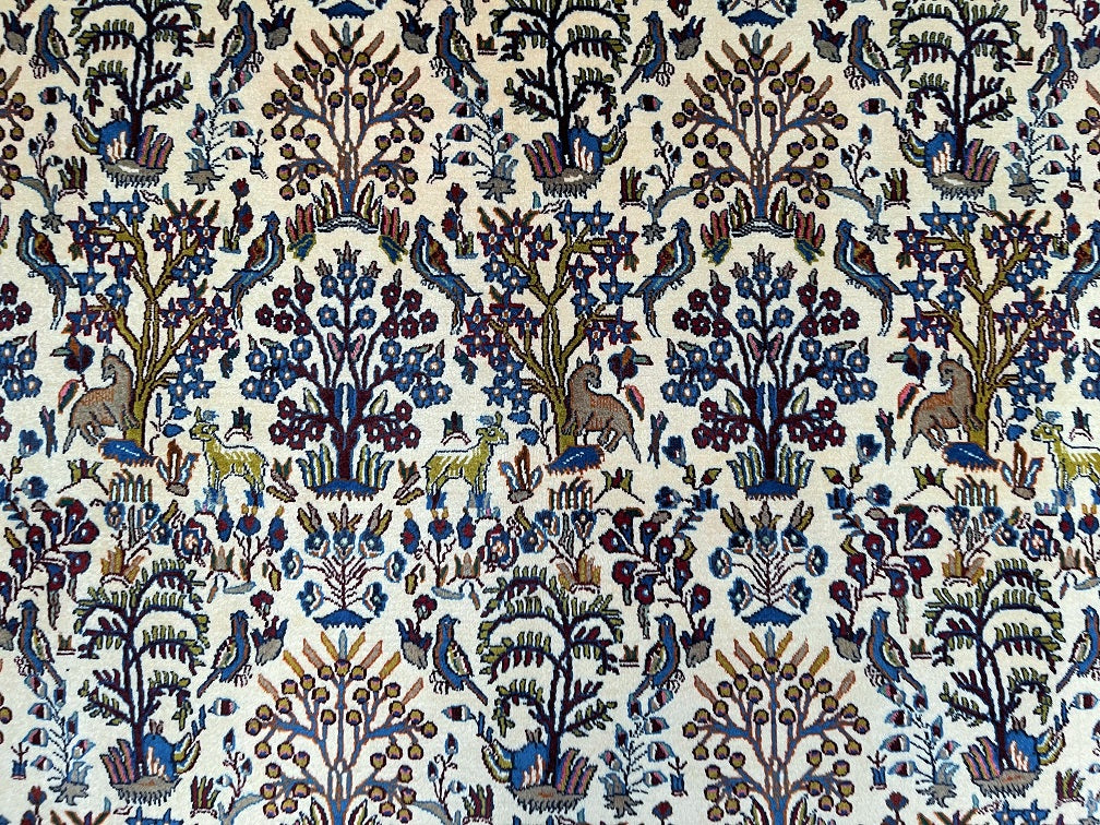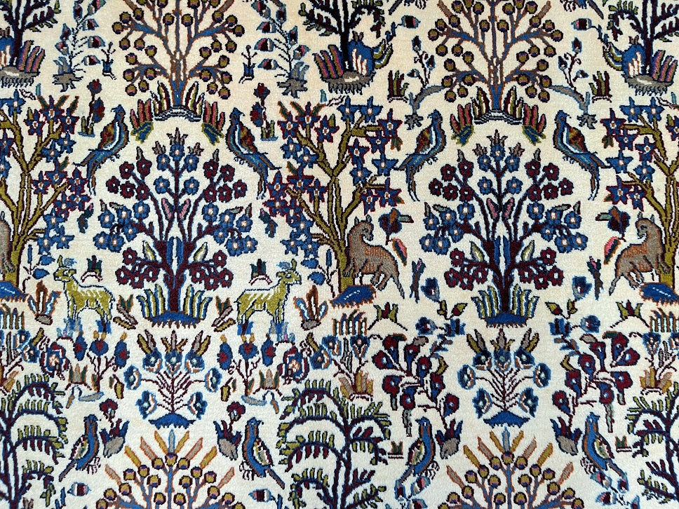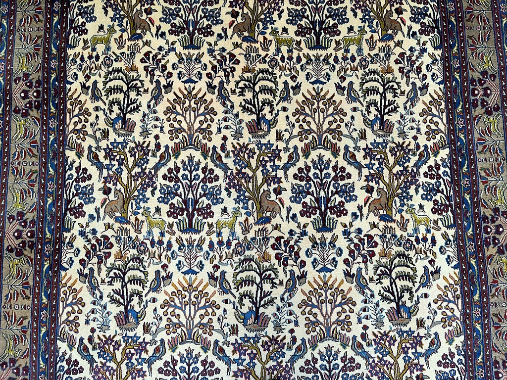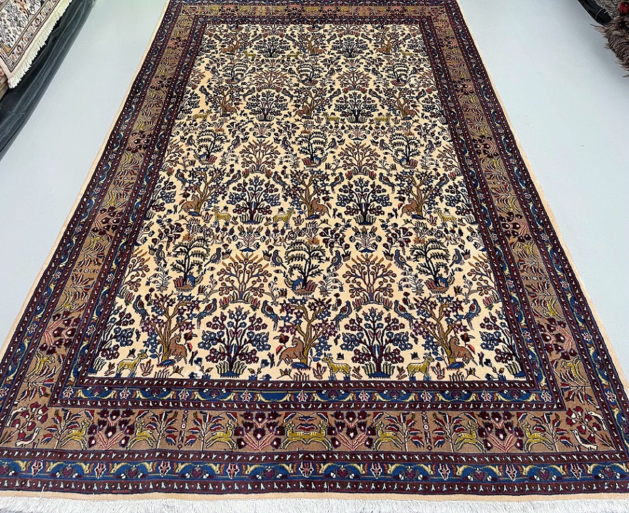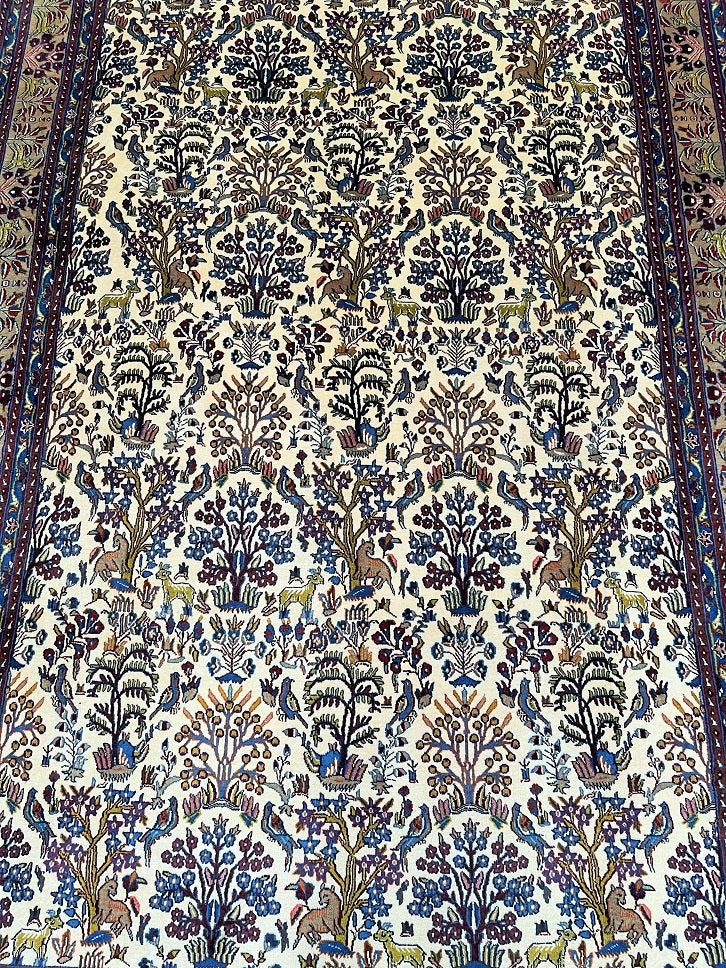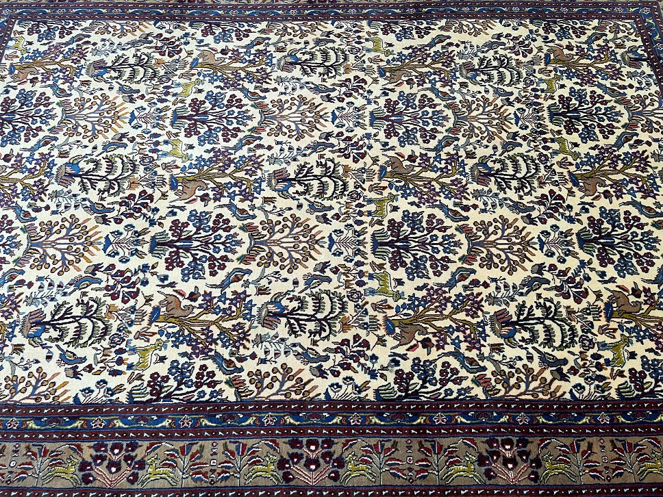 Full Room Size Garden Of Paradise Hand Knotted Vintage Persian Birjand Rug. It Has A Lamb’s Wool Pile On Fine Cotton. It Also Has Beige, Brown And Blue Tone Dyed Using Traditional Methods. Super Soft Wool, It Feels Amazing Under the Feet.