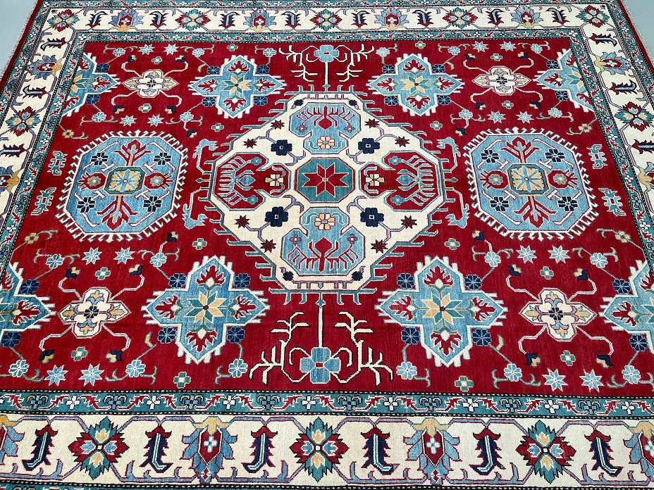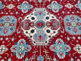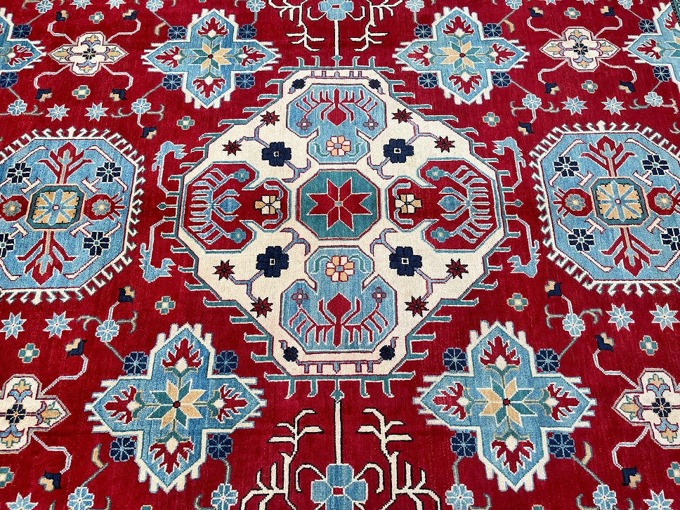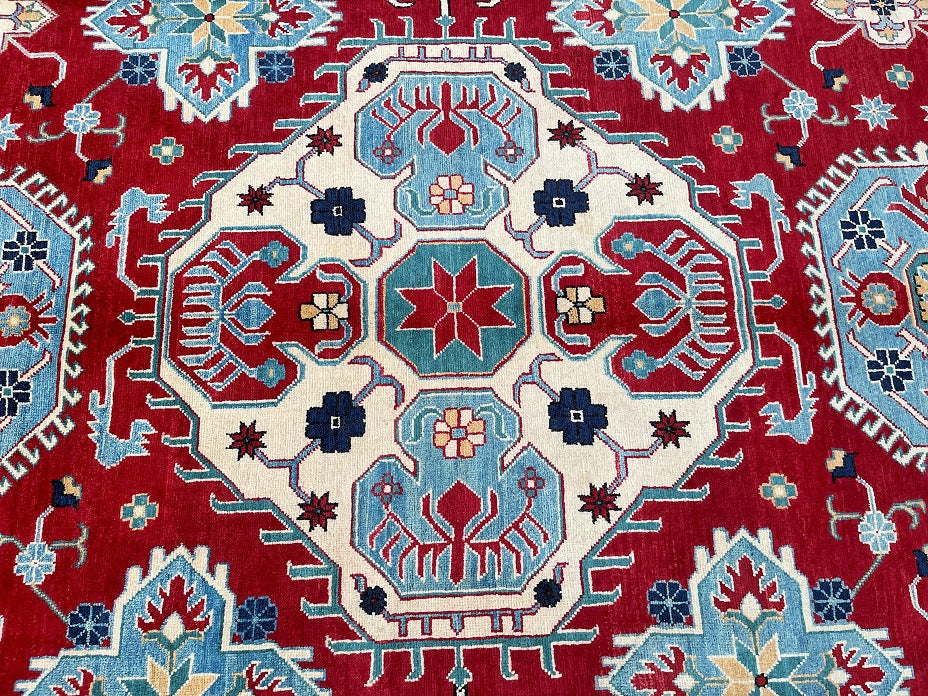 Large Room Size Authentic Hand Knotted Afghan Kazak rug. Above All It Has A Pure Hand Spun Wool Pile On Cotton Base. Red, Beige, Blue And Yellow Tones Dyed Using Traditional Methods (Vegetable Dyes). Last Of True Woven Tribal Art.