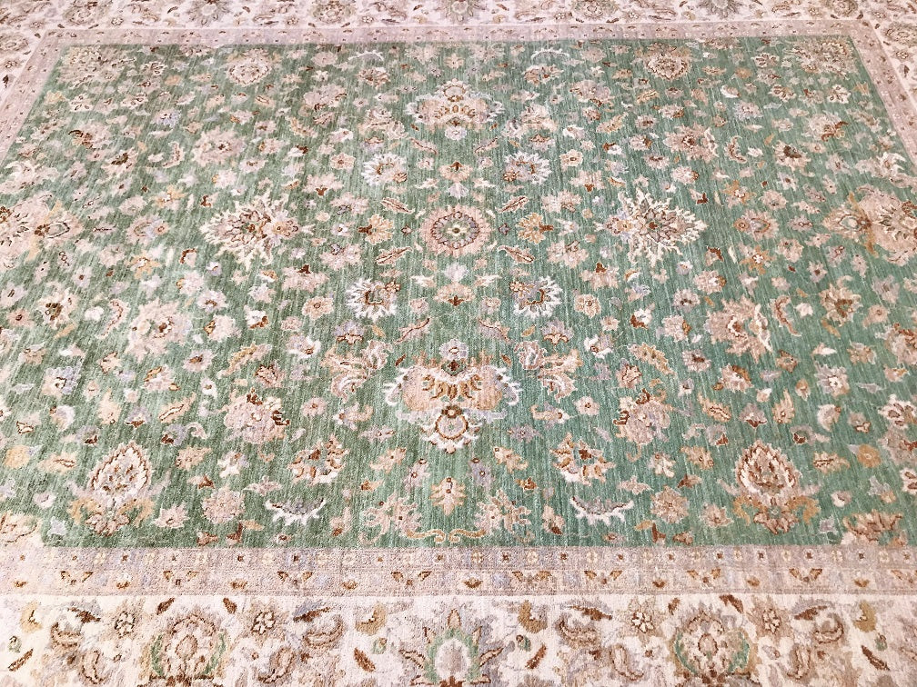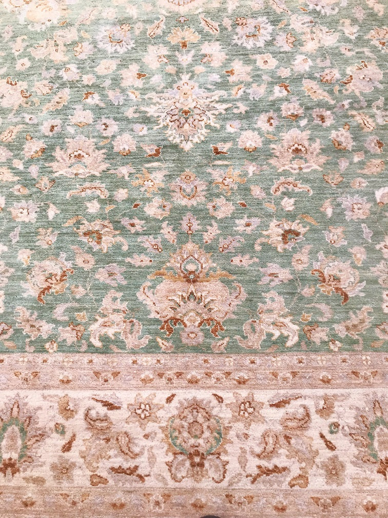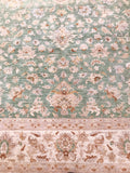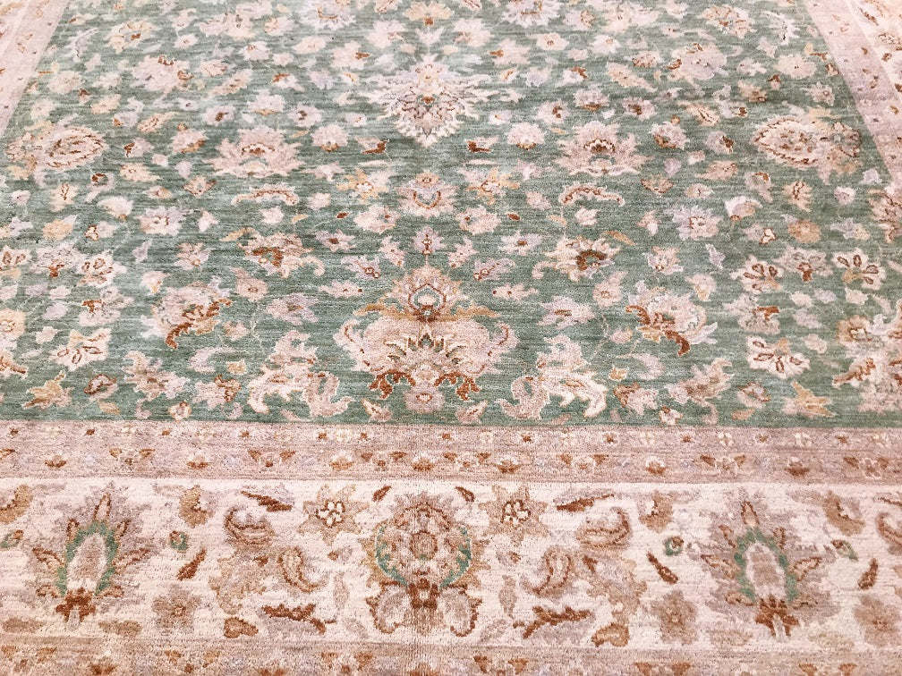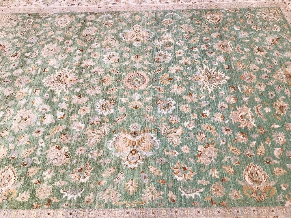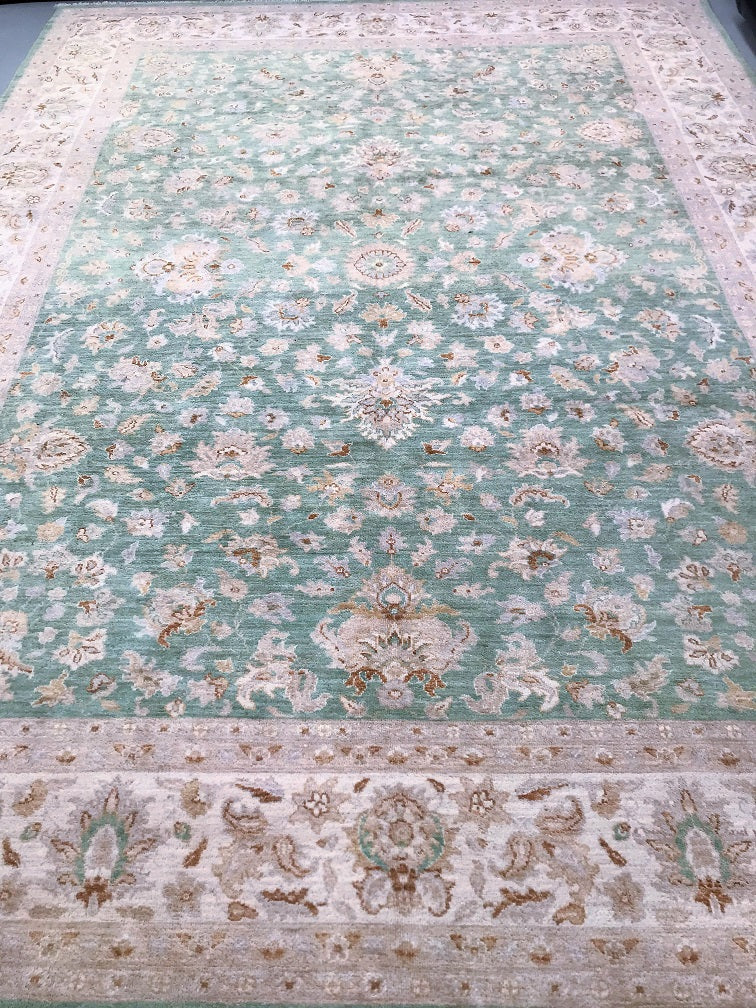 Rare Large Room Size Handmade Afghan Chobi Rug. Above All It Is Pure Hand Spun Wool Pile On Cotton Base. Rare Soft Green and Beige Tone Dyed Using Traditional Methods (Vegetable Dyes). Last of True Woven Nomadic Art.
