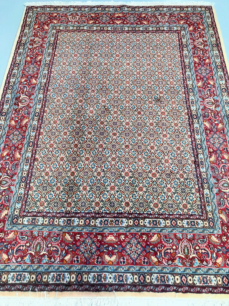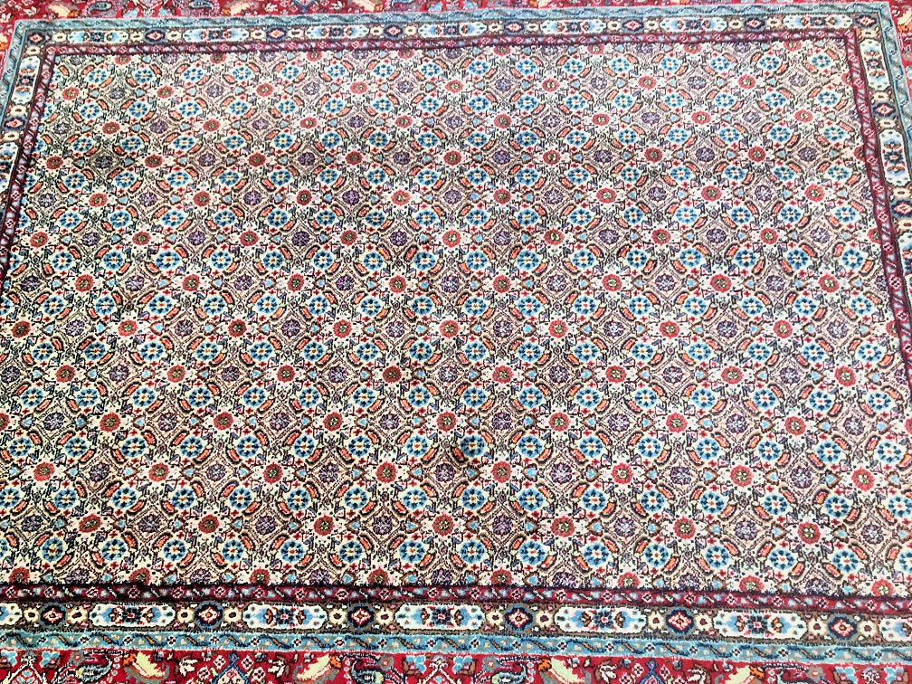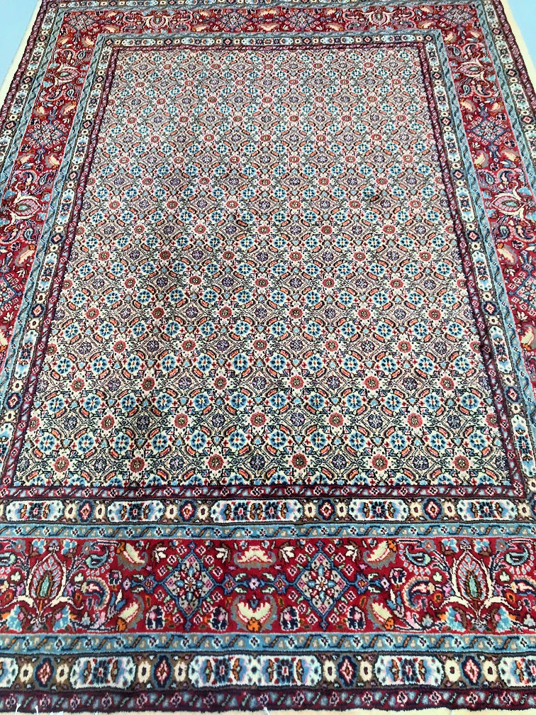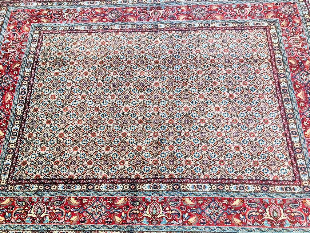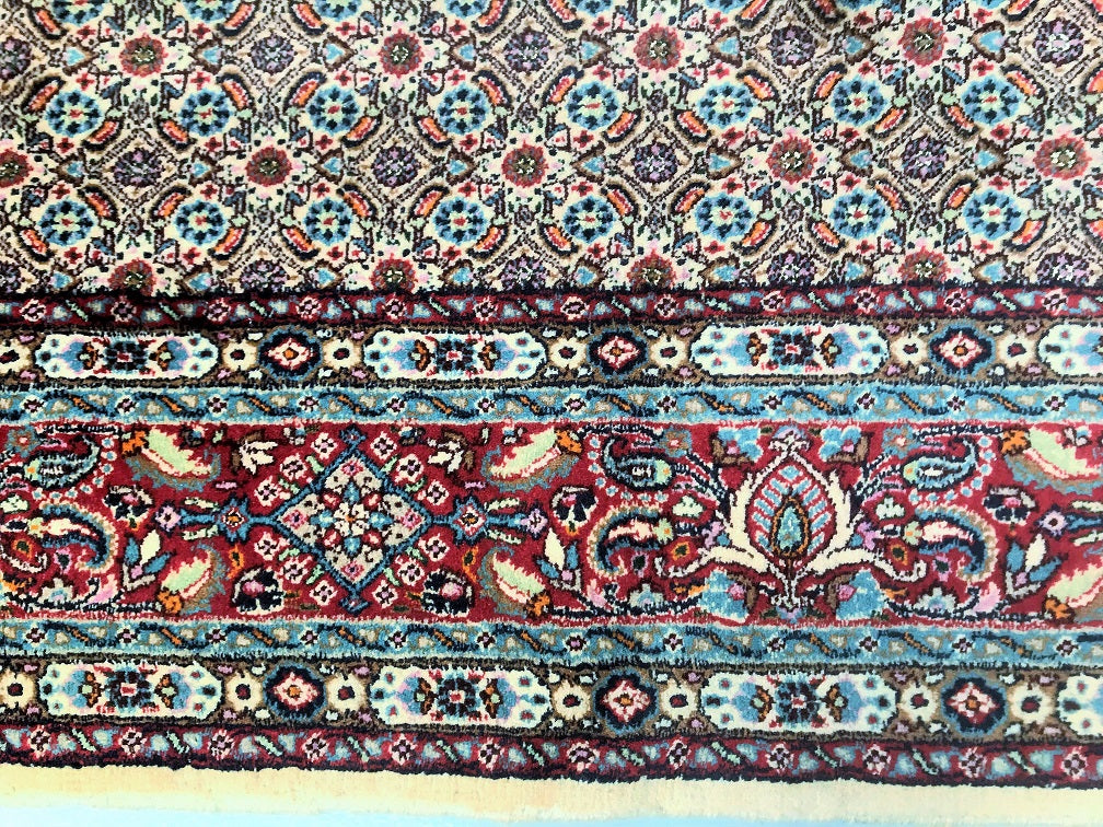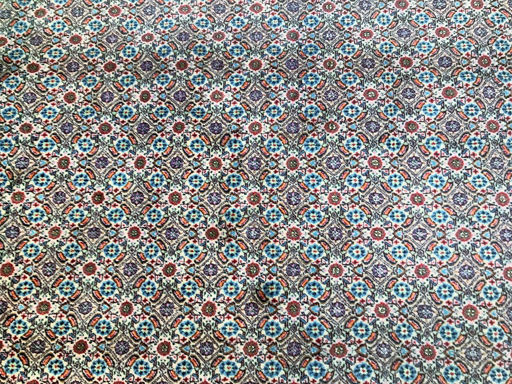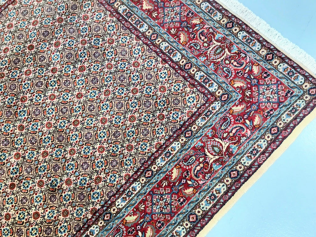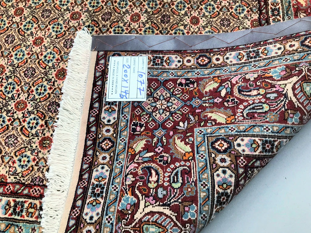Superb Quality Silk inlay Coffee Table Size Birjand Rug. Lamb’s Wool with Touch of Silk Pile on Fine Cotton. It Also Has A Beige Background Dyed Using Traditional Methods.