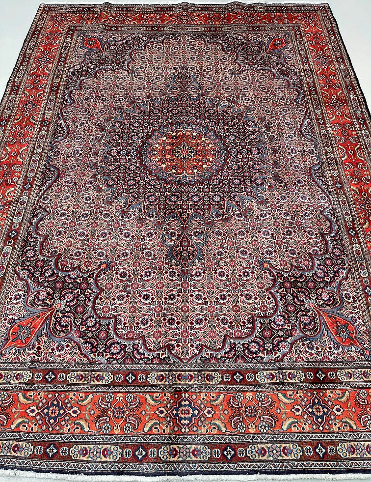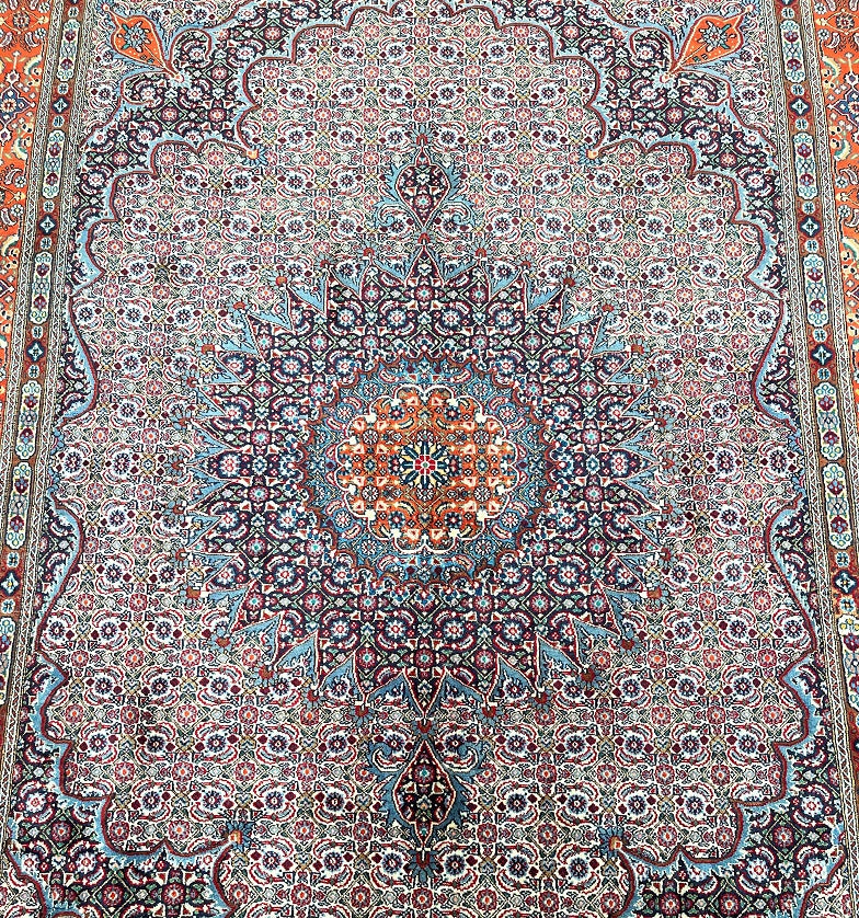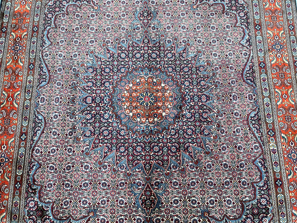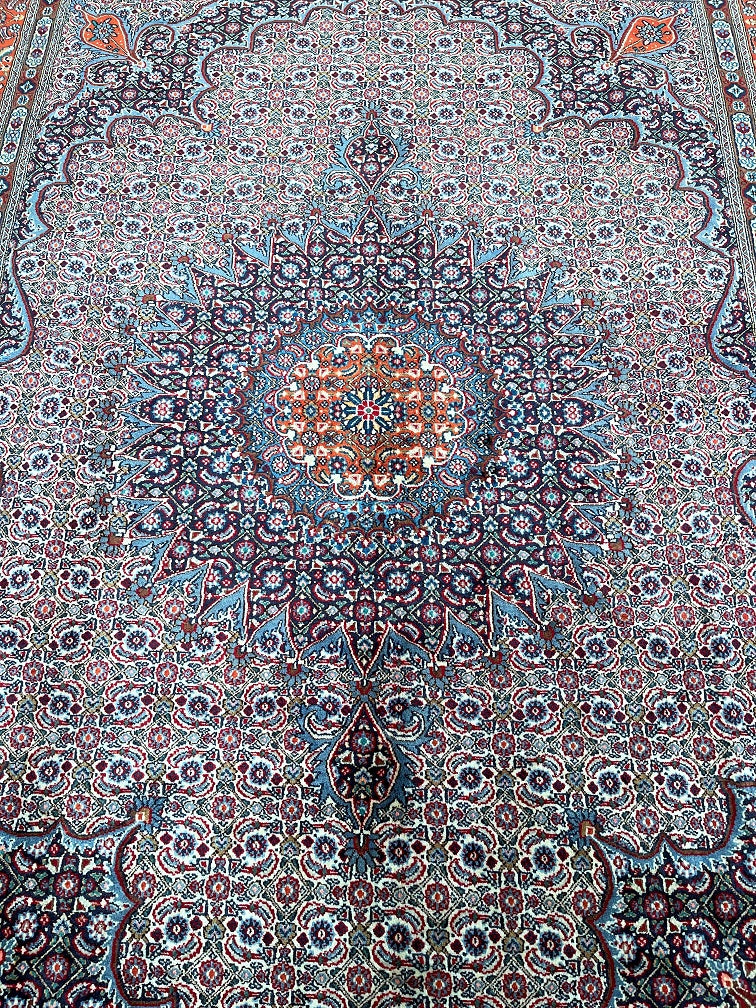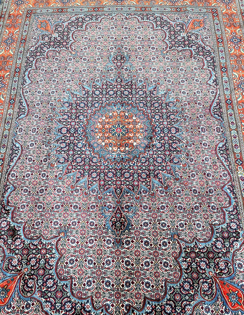 Full Room Size Hand Knotted Persian Birjand Rug. Above All It Is Hard To Find This Quality Handmade In Larger Sizes. Pure Lamb’s Wool Pile On Fine Cotton Base, Beige, Blues, Brown And Orange Tones Dyed Using Traditional Methods.