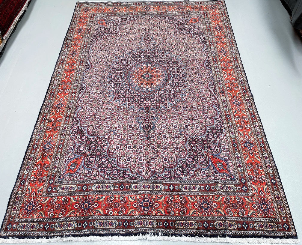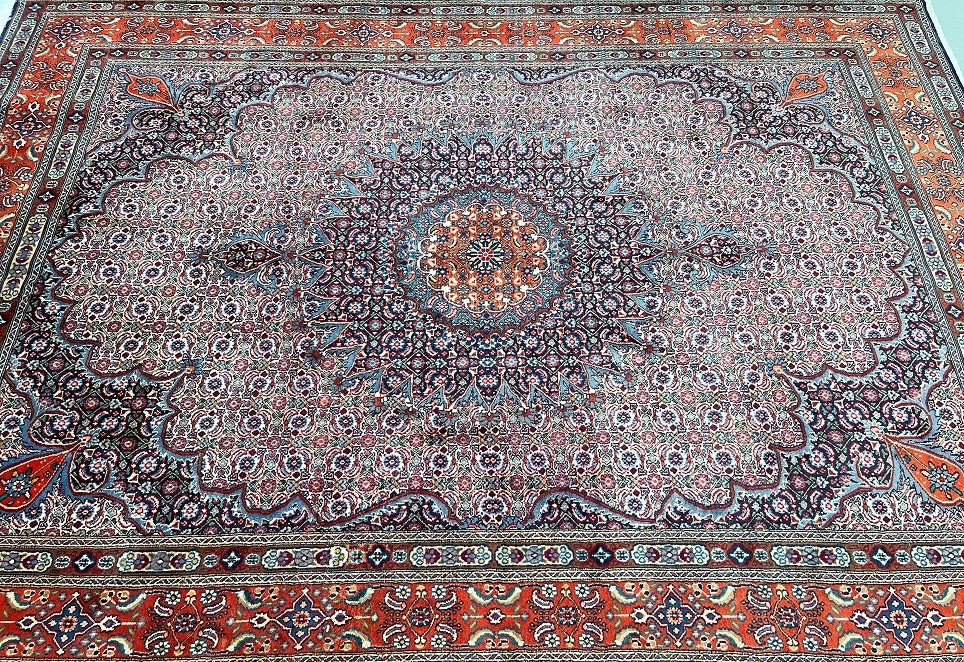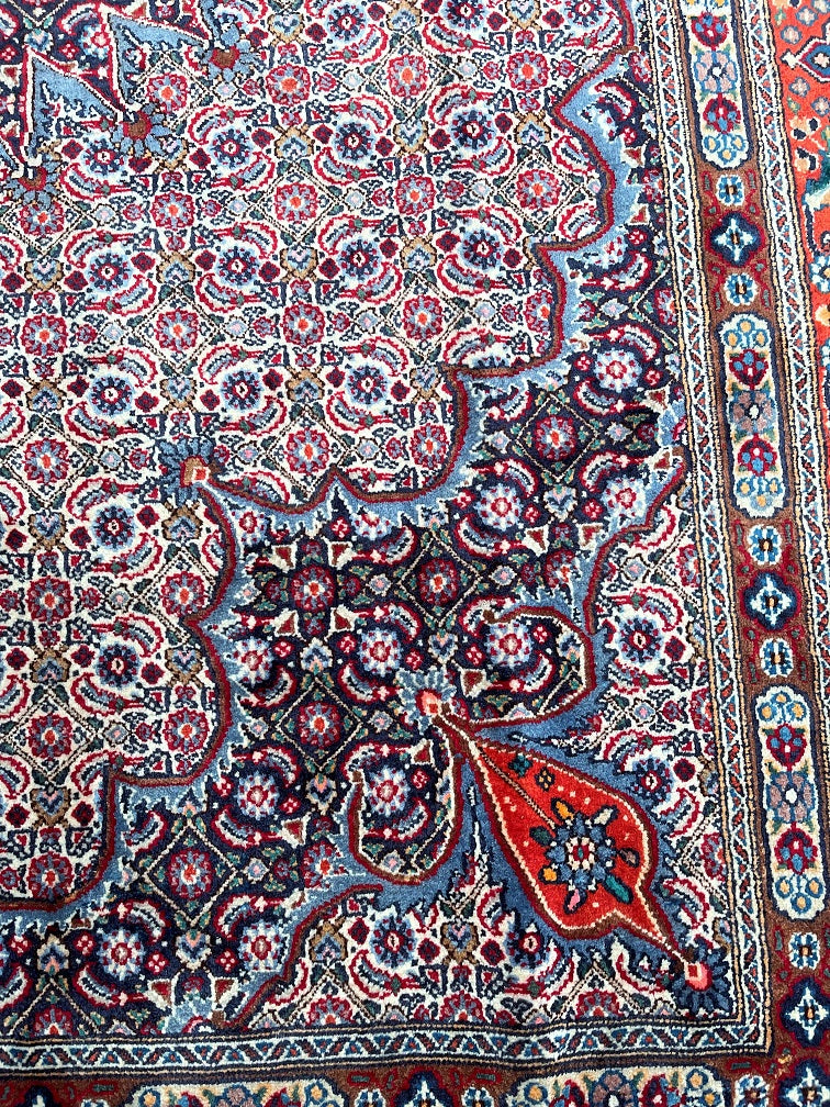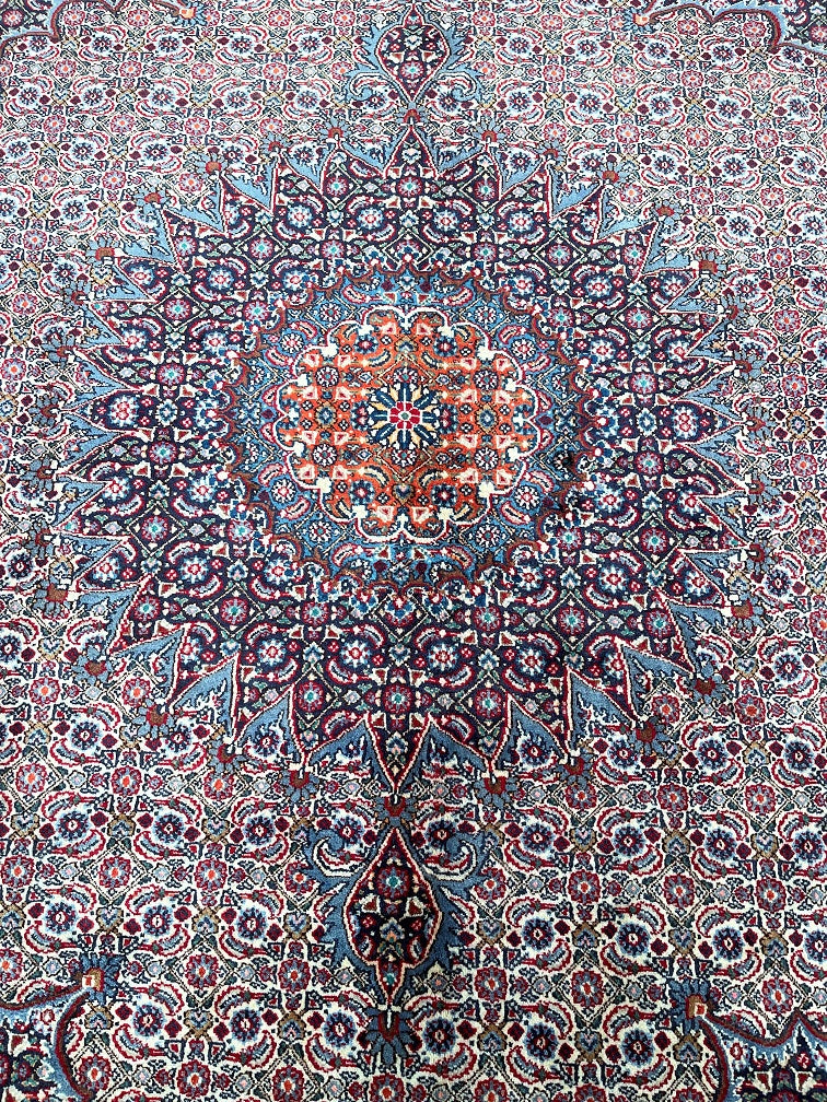 Full Room Size Hand Knotted Persian Birjand Rug. Above All It Is Hard To Find This Quality Handmade In Larger Sizes. Pure Lamb’s Wool Pile On Fine Cotton Base, Beige, Blues, Brown And Orange Tones Dyed Using Traditional Methods.