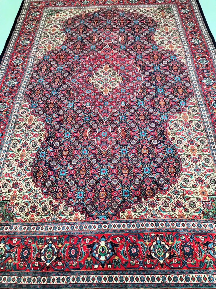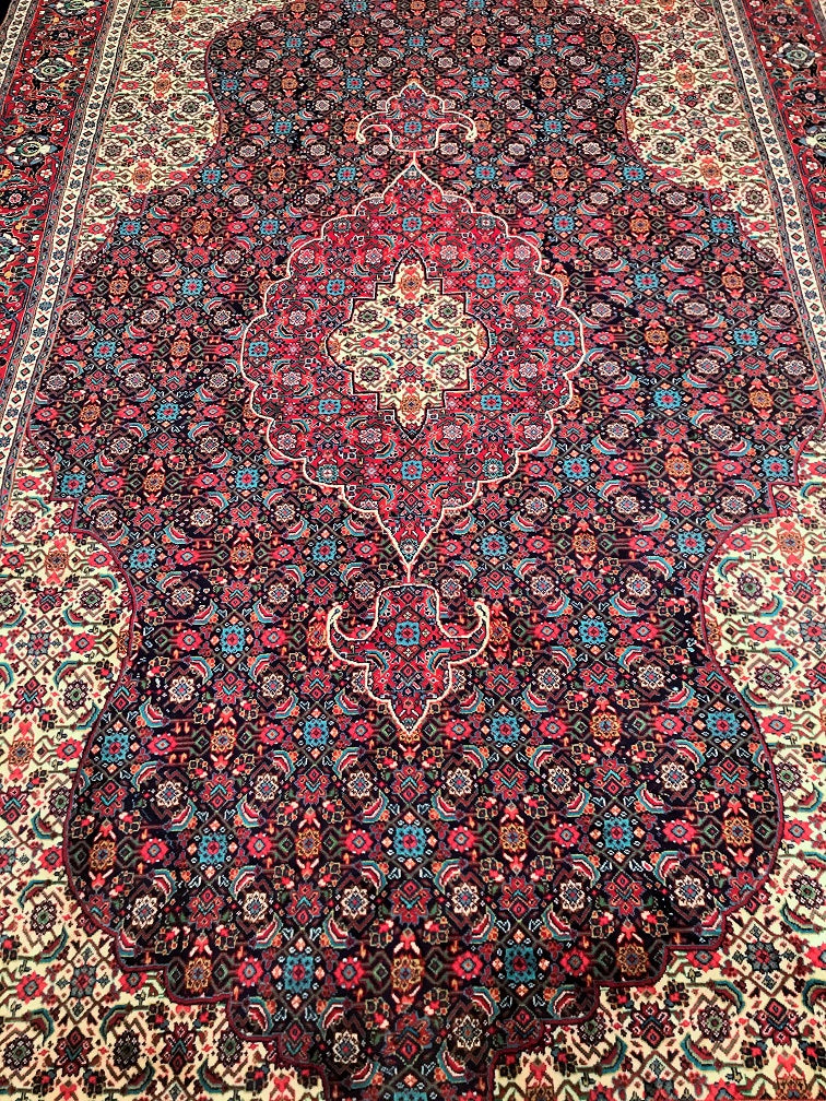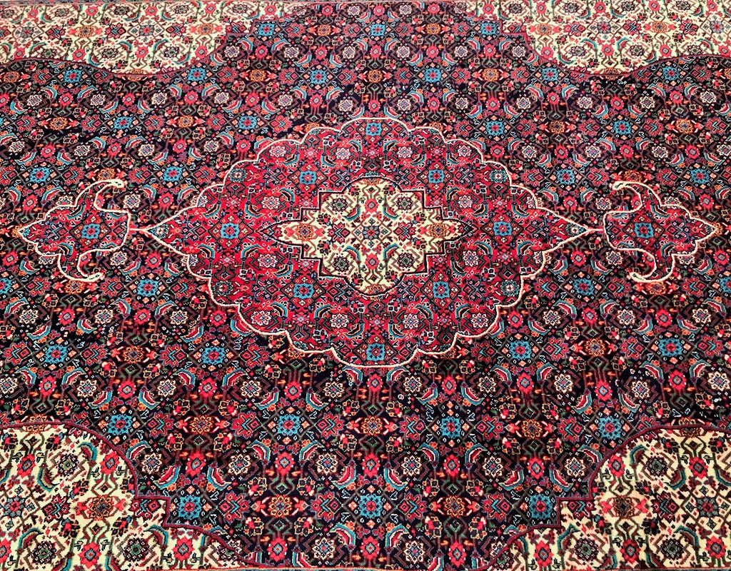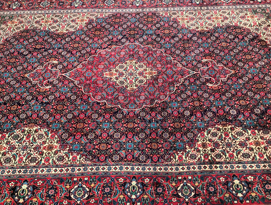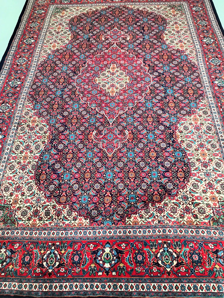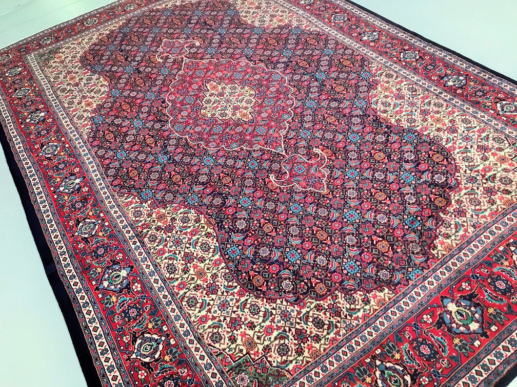 Superb Full Room Size Authentic Persian Saough Carpet. Above All It Is Hard To Get This Quality Original Handmade Rug In Larger Sizes. It Also Has Pure Lamb’s Wool Pile on Cotton Base. Indigo Blue Tones Dyed Using Traditional Methods. Fine Quality Piece from City Of Arak (Sarough).