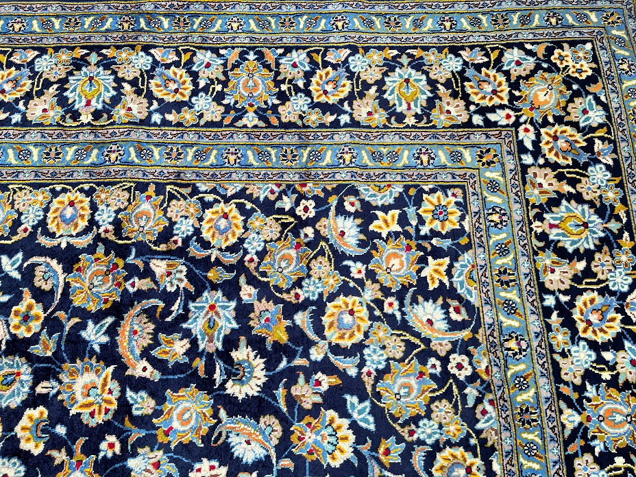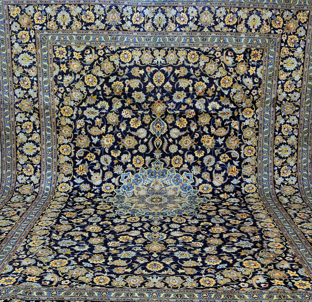 Large Room Size Authentic Persian Kashan Carpet. Above All It Is Hard To Get This Quality Hand Made Rug In Larger Sizes. It Also Has A Pure Lamb’s Pile On Cotton Base. Rare Indigo Blue Tones Dyed Using Traditional Methods. Fine Quality Piece From City Of Kashan.