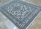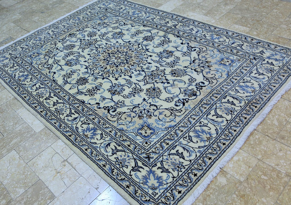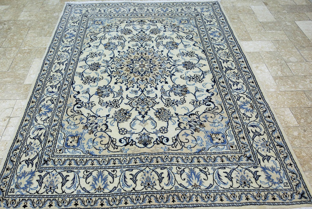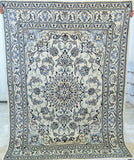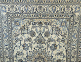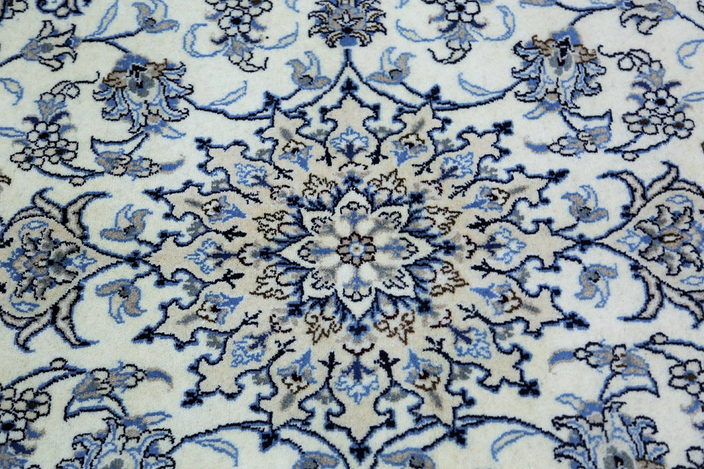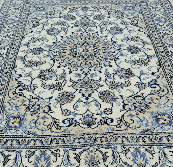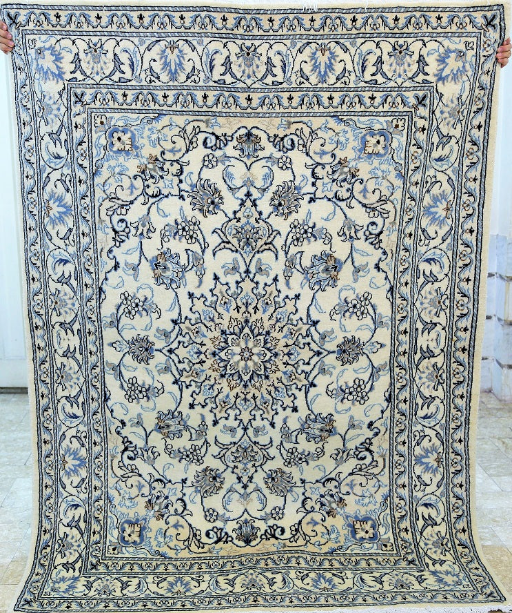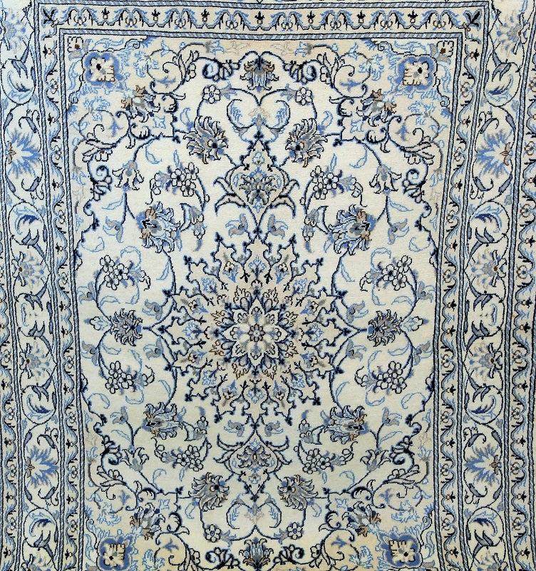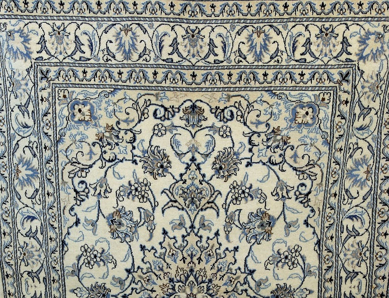 Fine Authentic Hand Knotted Persian Nain Rug. Above All It Has Pure Lamb’s Wool Pile on Cotton Base. It Also Has A Beige And Blue Tones Dyed Using Traditional Methods.