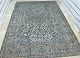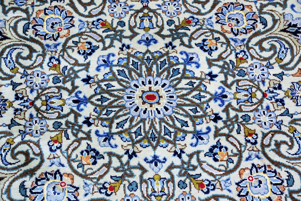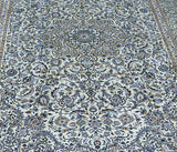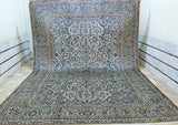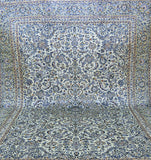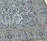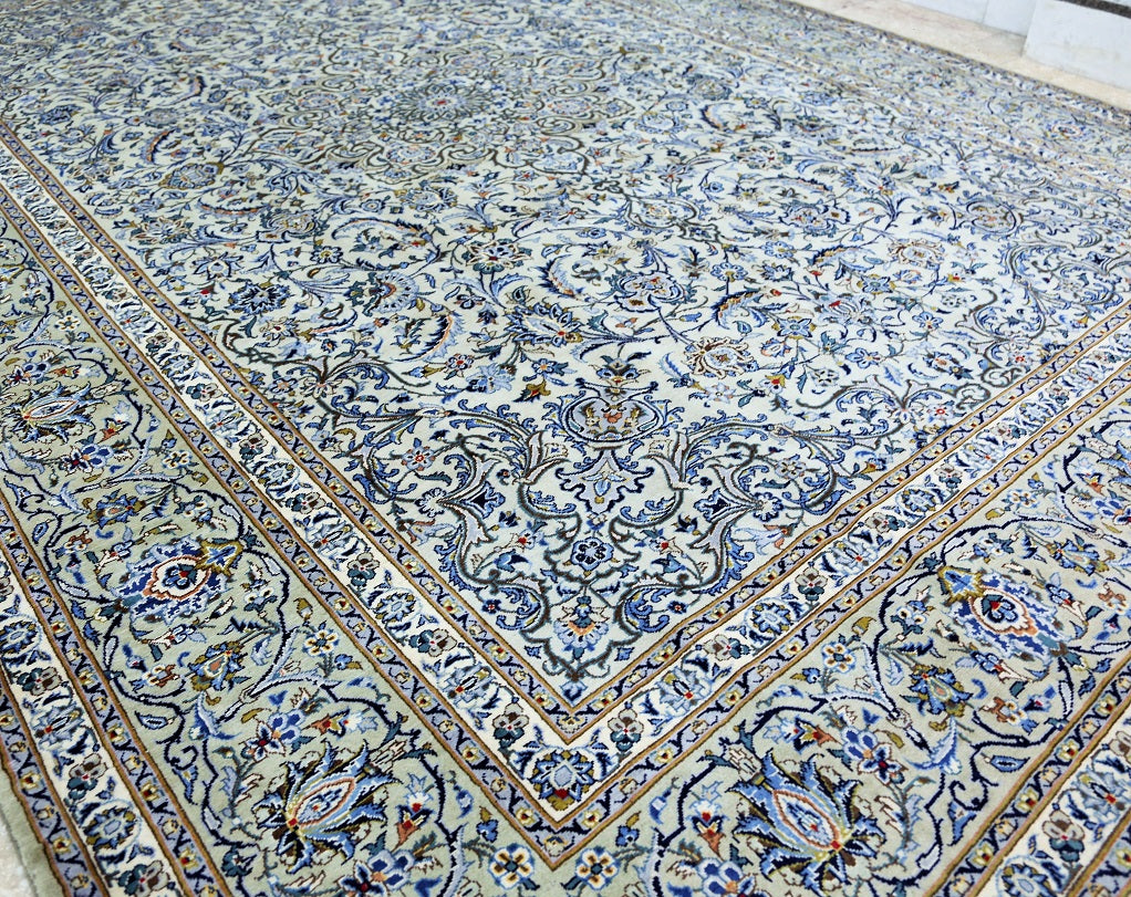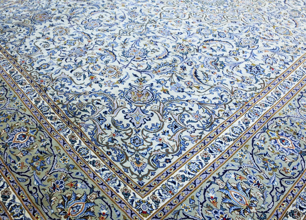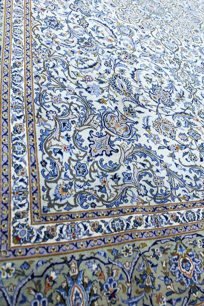 Rare Large Room Size Authentic Persian Kashan Carpet. Above All It Is Hard To Get This Quality Hand Made Rug In Larger Sizes. It Also Has a Pure Lamb’s Pile on Cotton Base. It Has Grey/Pistachio & Blue Tones Dyed Using Traditional Methods.