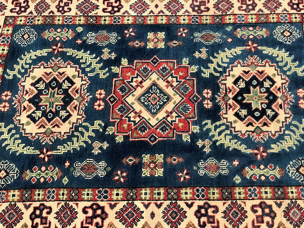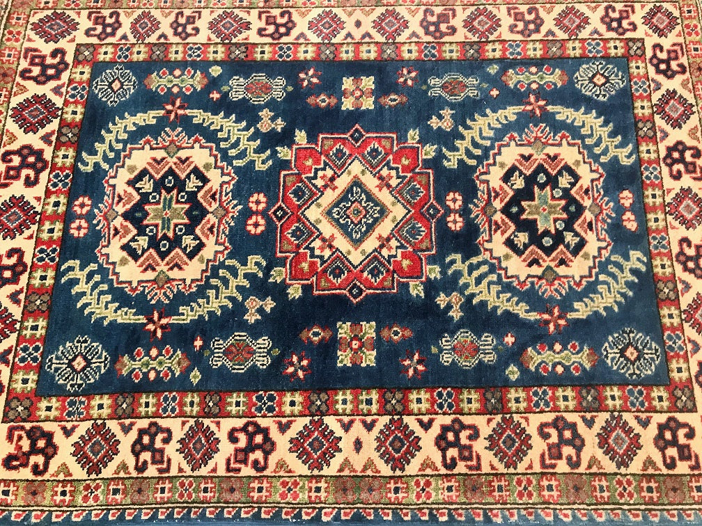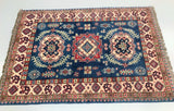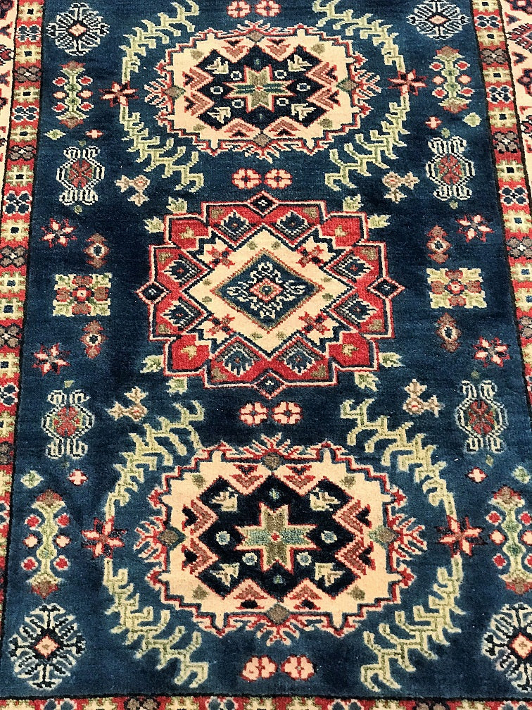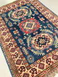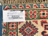 Coffee Table Caucasian Design Afghan Kazak Rug. Above All It Is Pure Hand Spun Wool Pile On Cotton Base. Blue, Green, Red and Beige Tone Dyed Using Traditional Methods (Vegetable Dyes). Last Of True Woven Tribal Art.