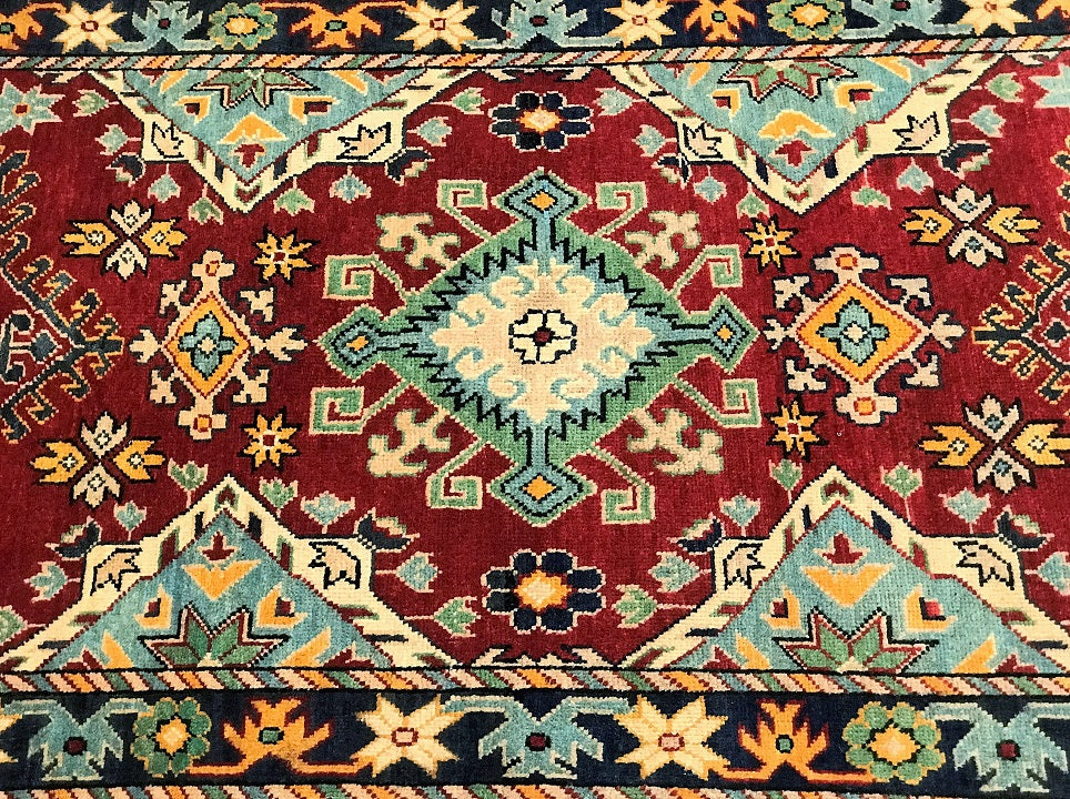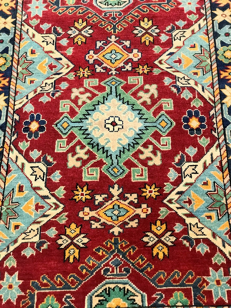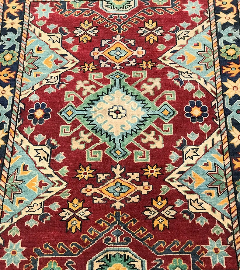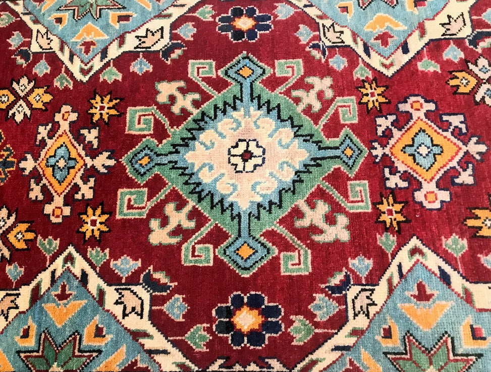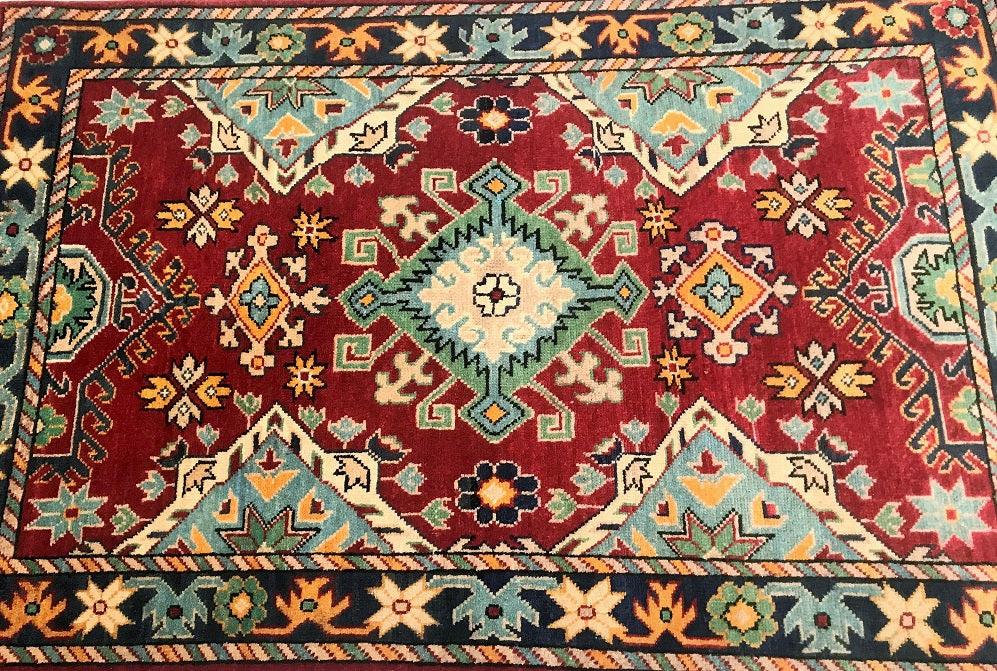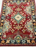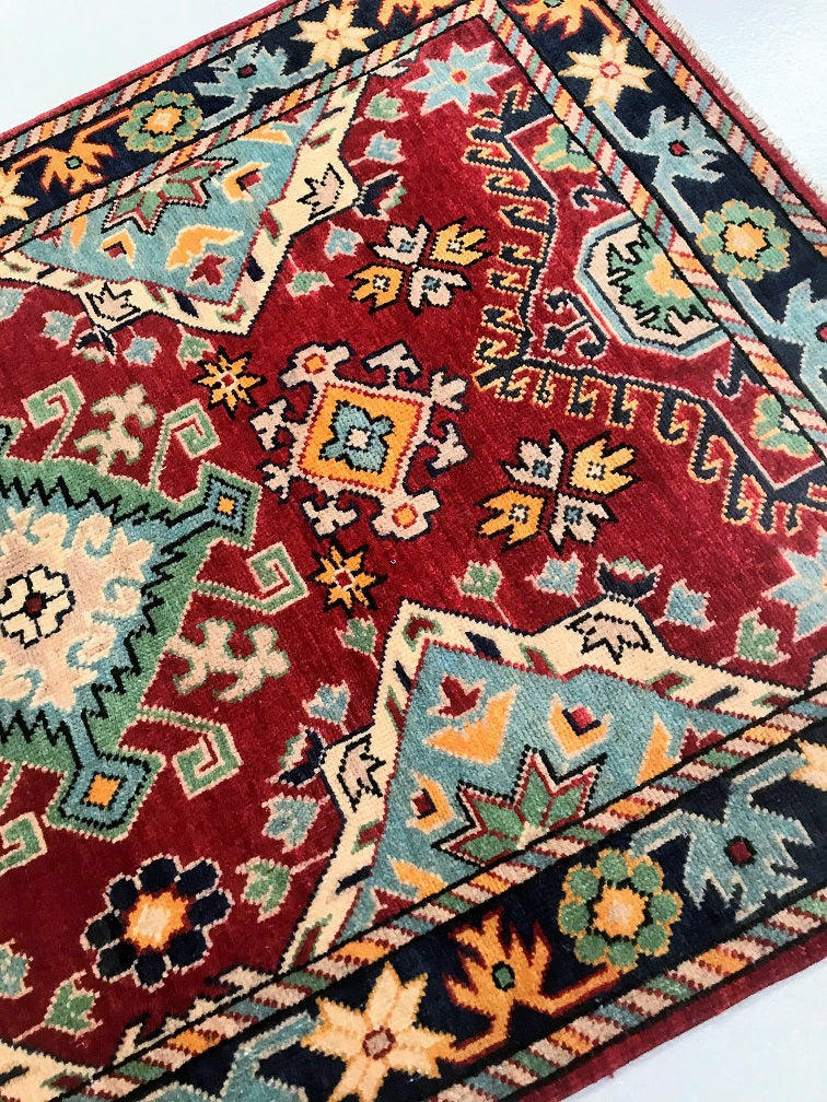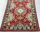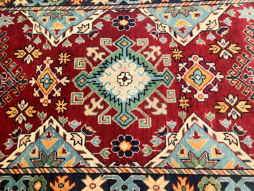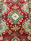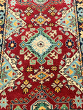 Discounted Coffee Table Size Afghan Kazak Rug. Above All It Is Pure Hand Spun Wool Pile On Cotton Base. Maroon/Red, Orange, Blue and Beige Tone Dyed Using Traditional Methods (Vegetable Dyes). Last Of True Woven Tribal Art.