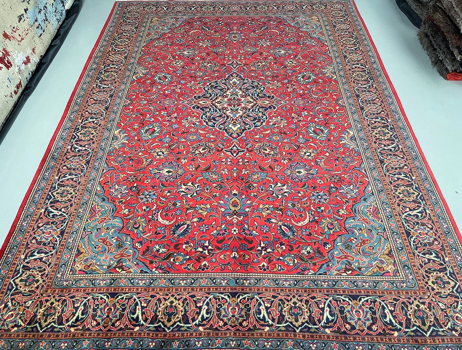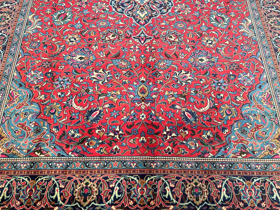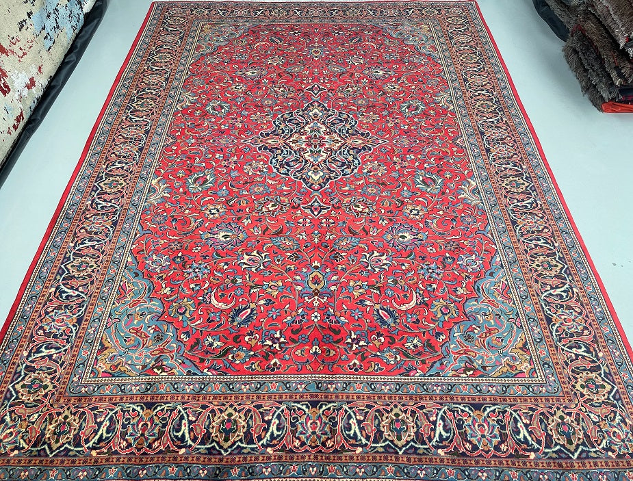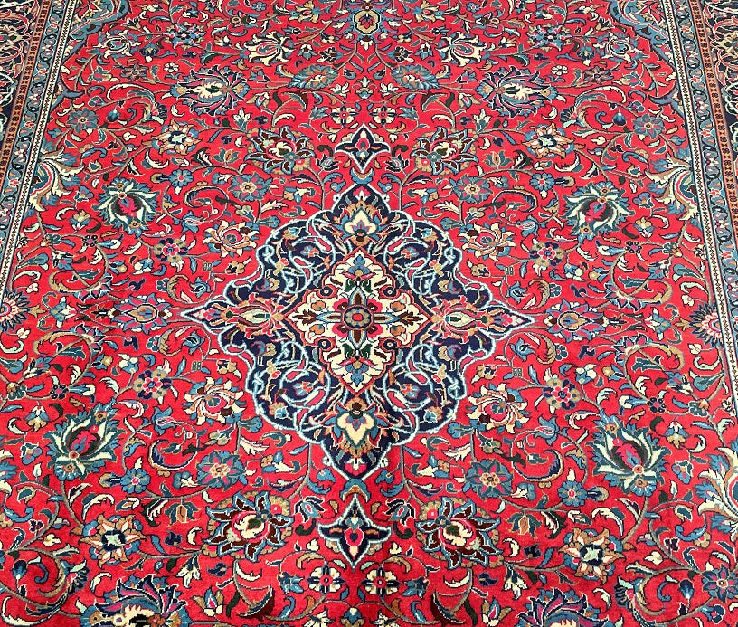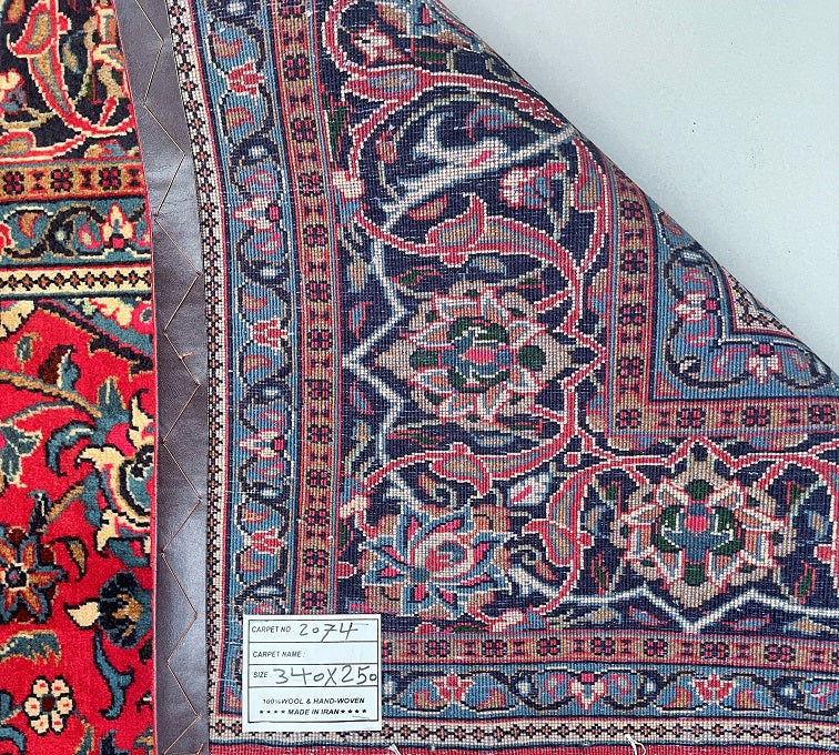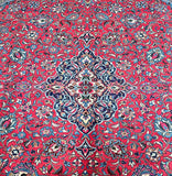 This Large Room Size Authentic Handmade Persian Sarough Carpet is a stunning piece with a lamb's wool pile on a cotton base. The salmon pink, beige, and blue tones are achieved through traditional dyeing methods, creating a beautiful color palette. The carpet features a central medallion floral design, adding an elegant touch to any space. It is important to note that it would have taken a skilled weaver approximately 12 months to complete this intricate piece by hand. Hand woven in the Saruk region of Central Persia, this carpet measures 340 x 250 cm and has a gallery replacement value of $7900.