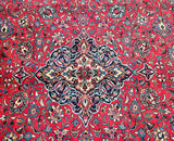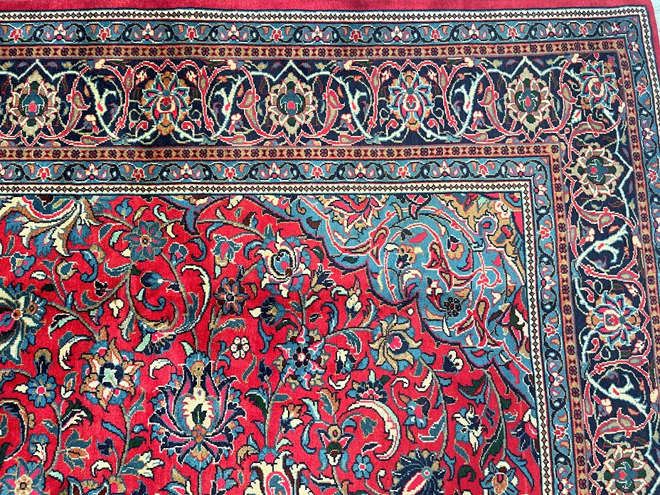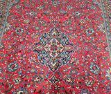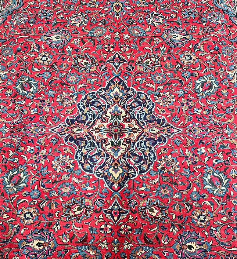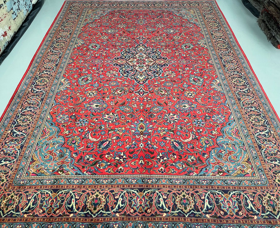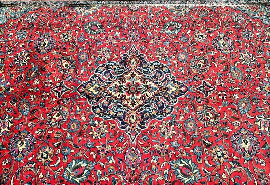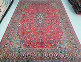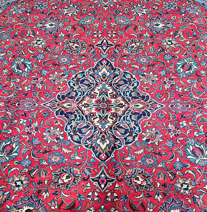 This Large Room Size Authentic Handmade Persian Sarough Carpet is a stunning piece with a lamb's wool pile on a cotton base. The salmon pink, beige, and blue tones are achieved through traditional dyeing methods, creating a beautiful color palette. The carpet features a central medallion floral design, adding an elegant touch to any space. It is important to note that it would have taken a skilled weaver approximately 12 months to complete this intricate piece by hand. Hand woven in the Saruk region of Central Persia, this carpet measures 340 x 250 cm and has a gallery replacement value of $7900.