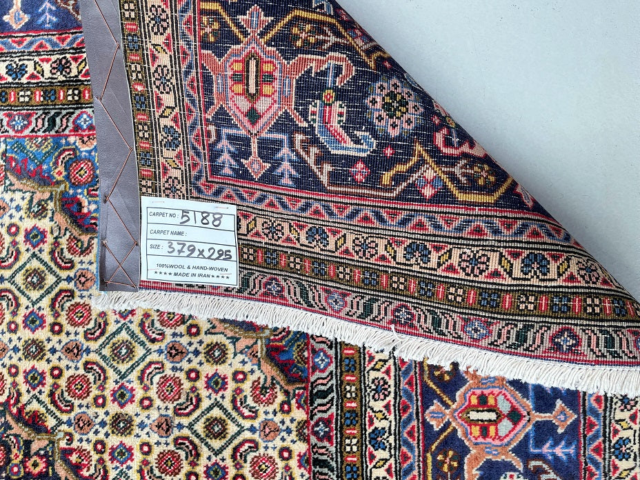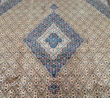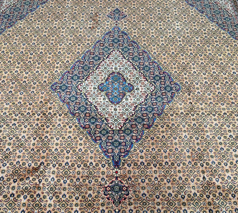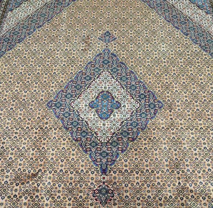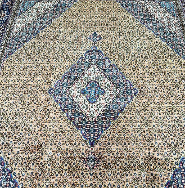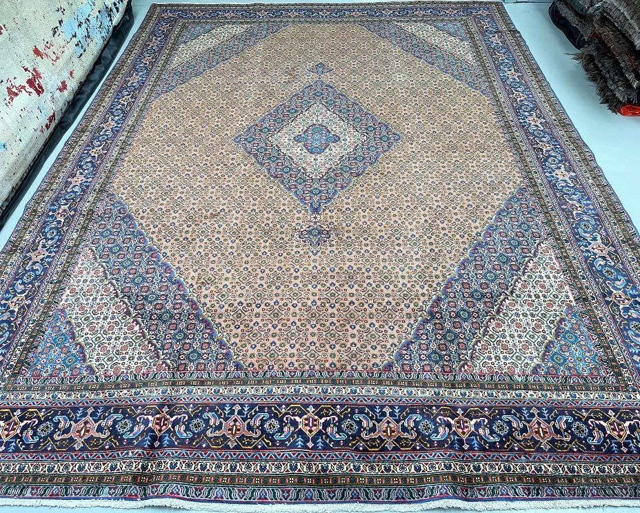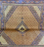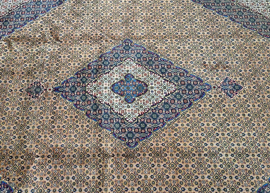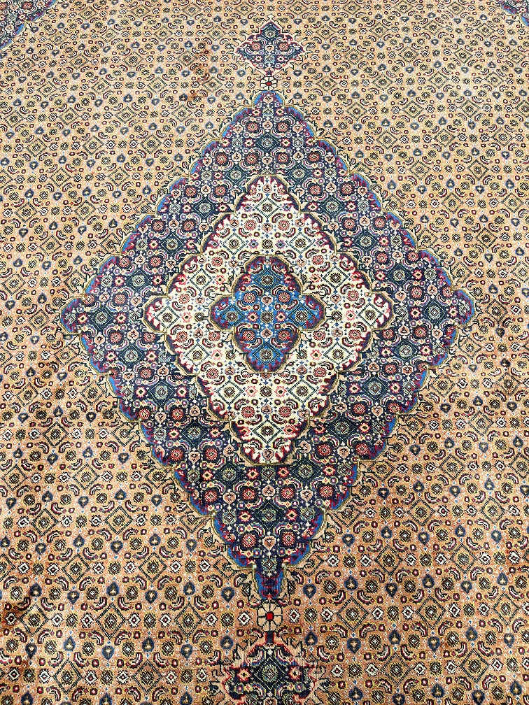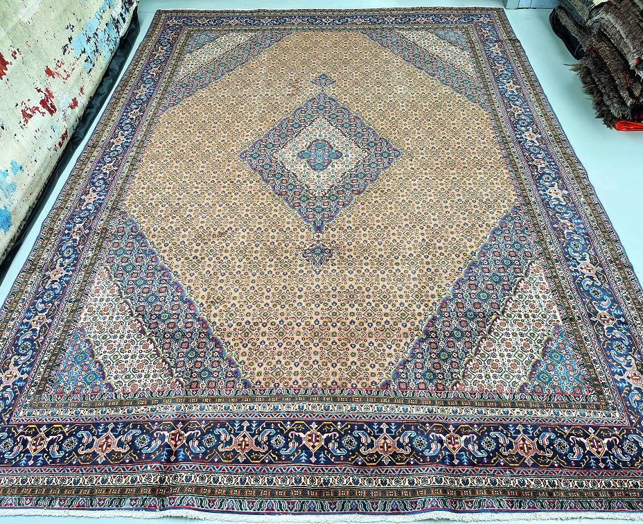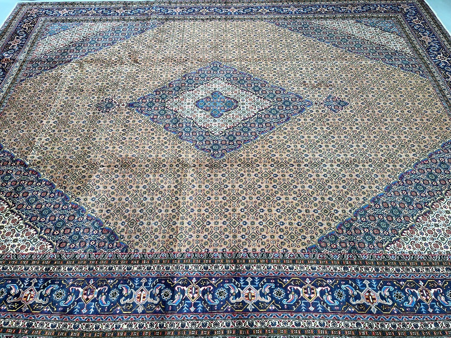 Massive Room Size Handmade Vintage Persian Ardebil Rug. Above All It Is Hard To Find Such Fine Quality Handmade Carpet In Larger Sizes. Pure Lamb’s Wool Pile On Cotton Base. Caramel, Beige And Blue Tones Dyed Using Traditional Methods. Dense Quality From Famous City Of Ardebil.