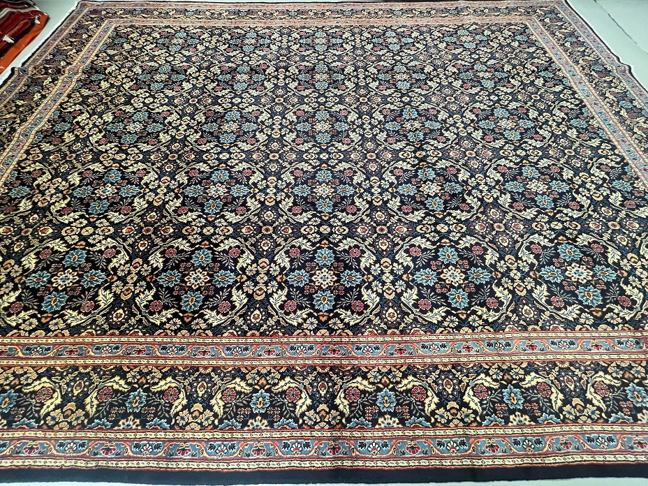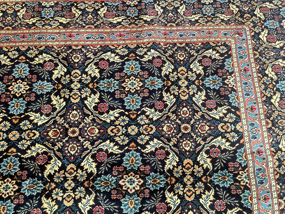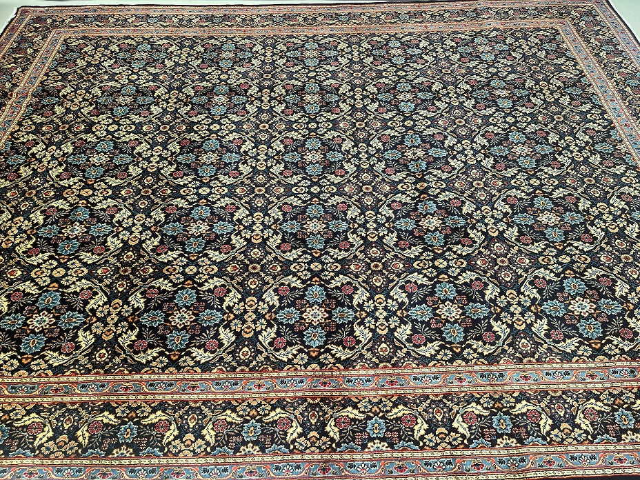 Stunning Large Room Size Authentic Handmade Persian Birjand Rug, Hard To Find This Quality Handmade Rugs That Are Signed. It Also Has A Lamb’s Wool Pile On Fine Cotton. Indigo Blue Tones Dyed Using Traditional Methods. Collectible Piece From Weaving House Of Khosravani.