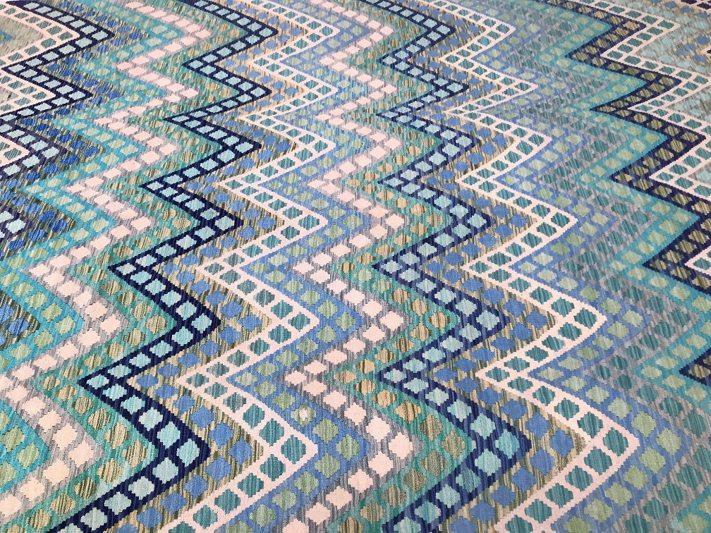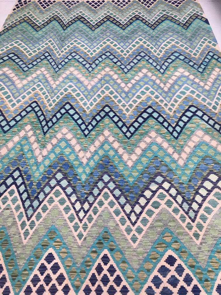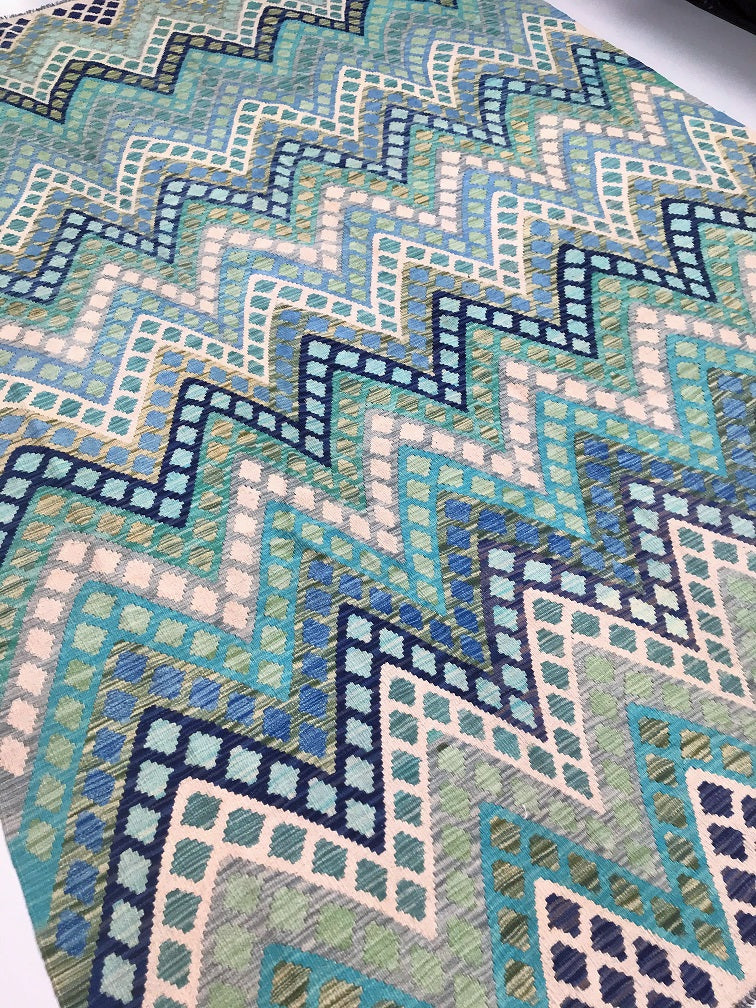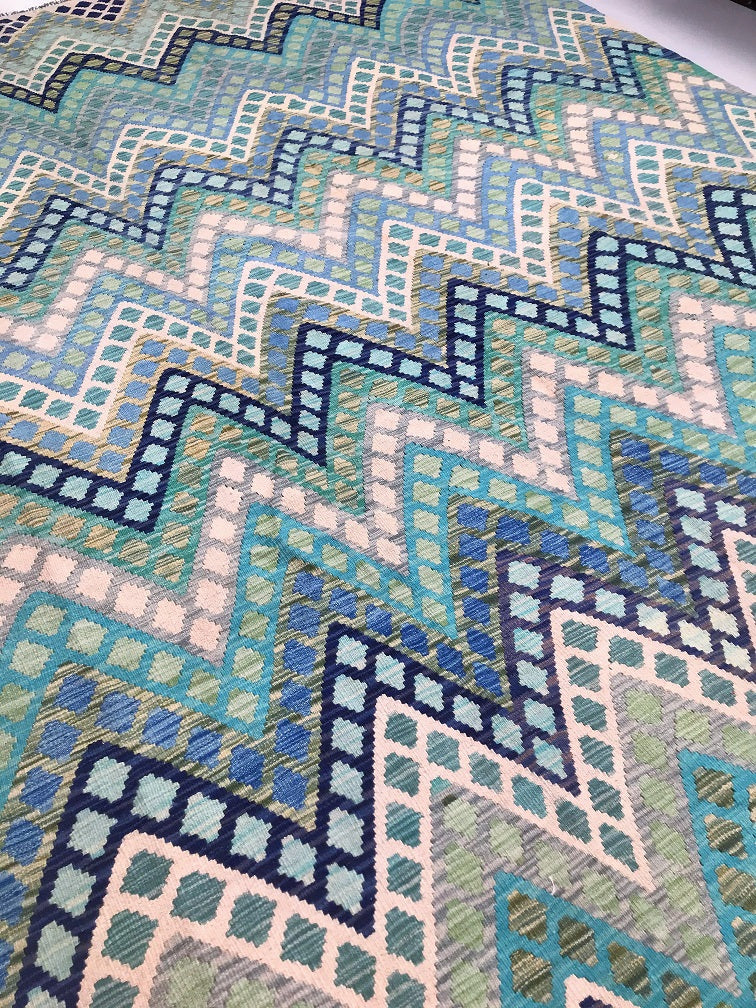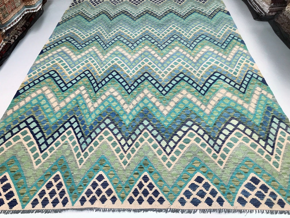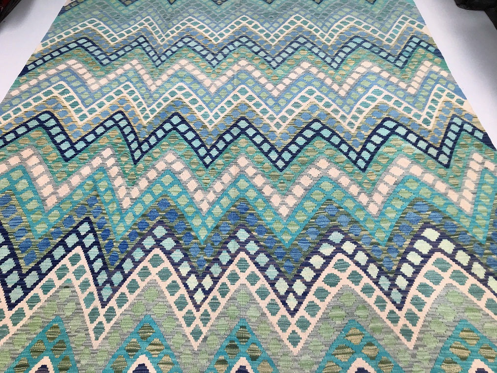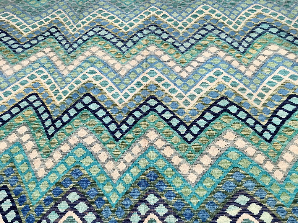 Unique Large Room Size Hand Woven Afghan Aryana Kilim Rug. Above All It Is Reversible. It Also Has A Pure Hand Spun Wool Pile On Wool Base. Green, Blue And Beige Tone Dyed Using Vegetable Dyes.