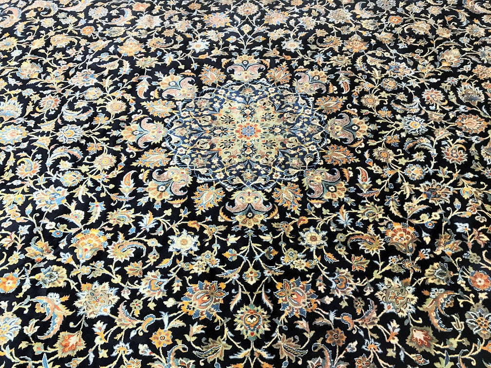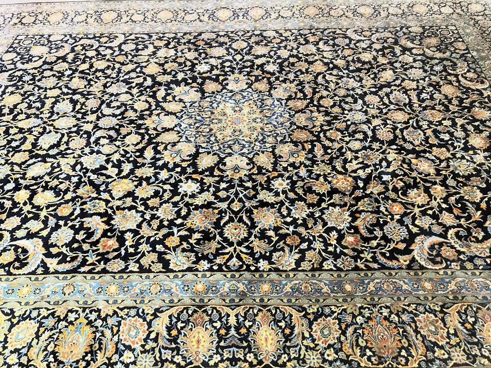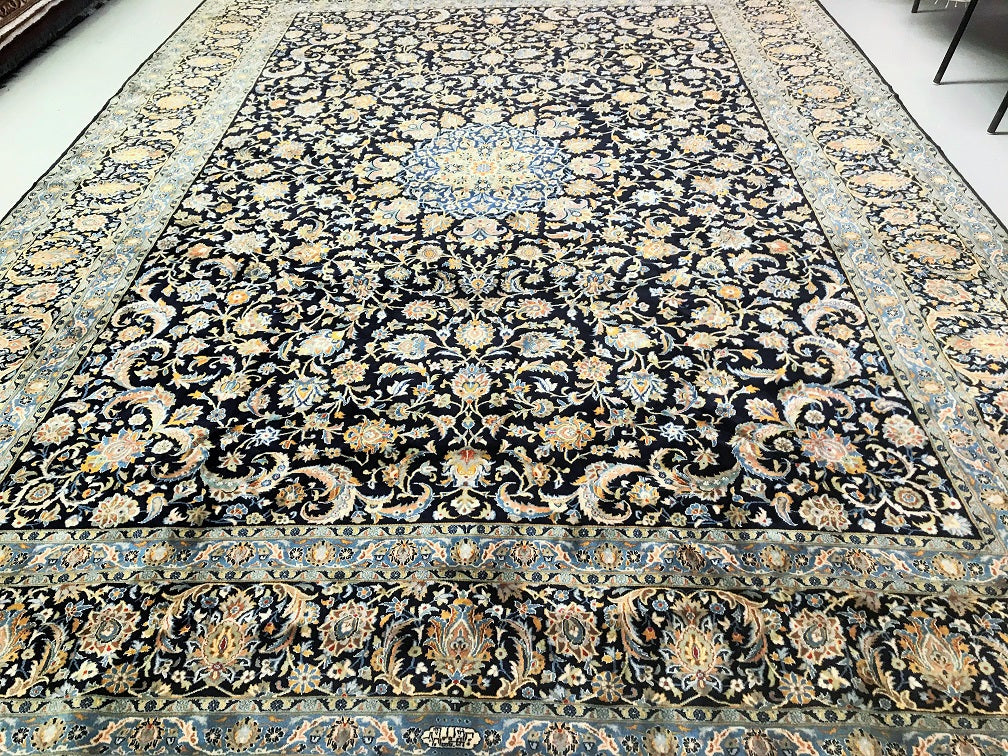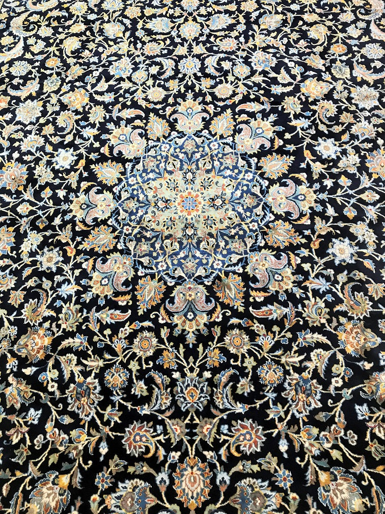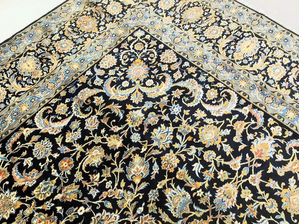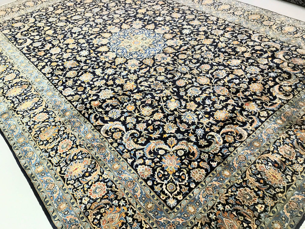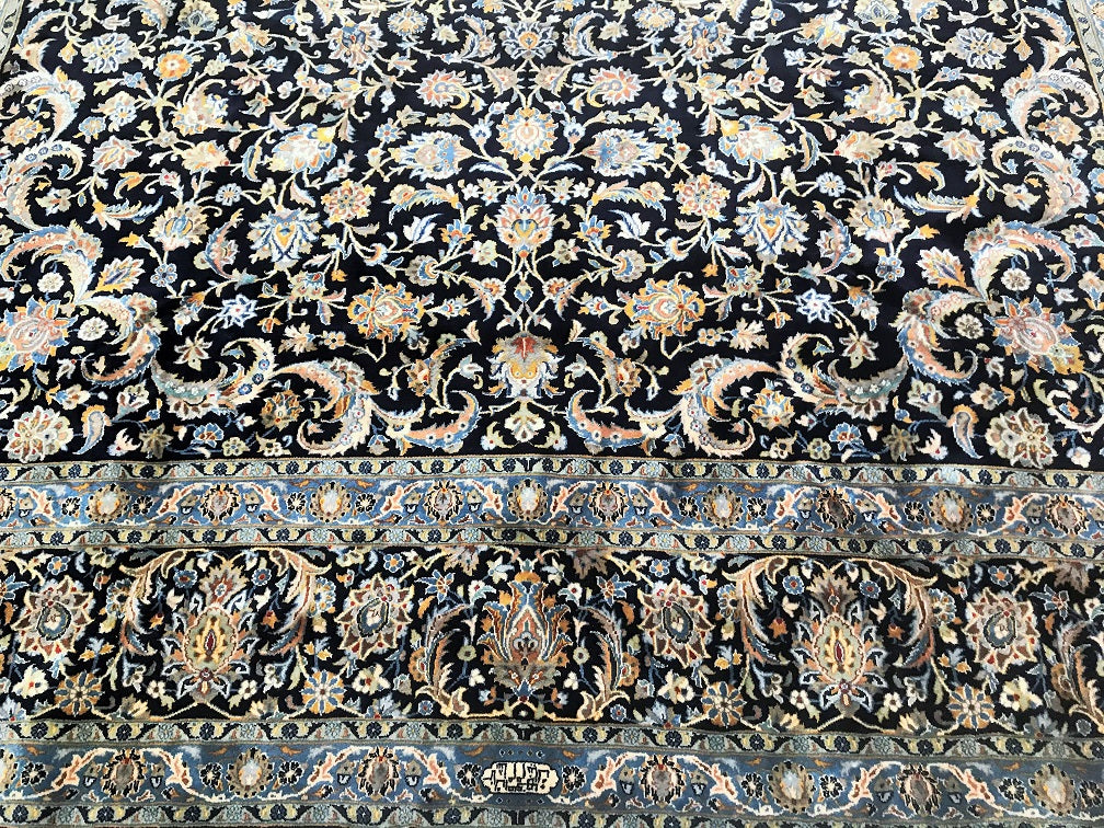 Top Quality Oversize Authentic Persian Kashan Rug Signed. Above All This Is a Superfine Weaved Rug From Weaving House Of “Isfahanian-Kashan”. Pure Lamb’s Wool Pile On Cotton Base. It Also Has A Rare Indigo Blue Tone Dyed Using Traditional Method.