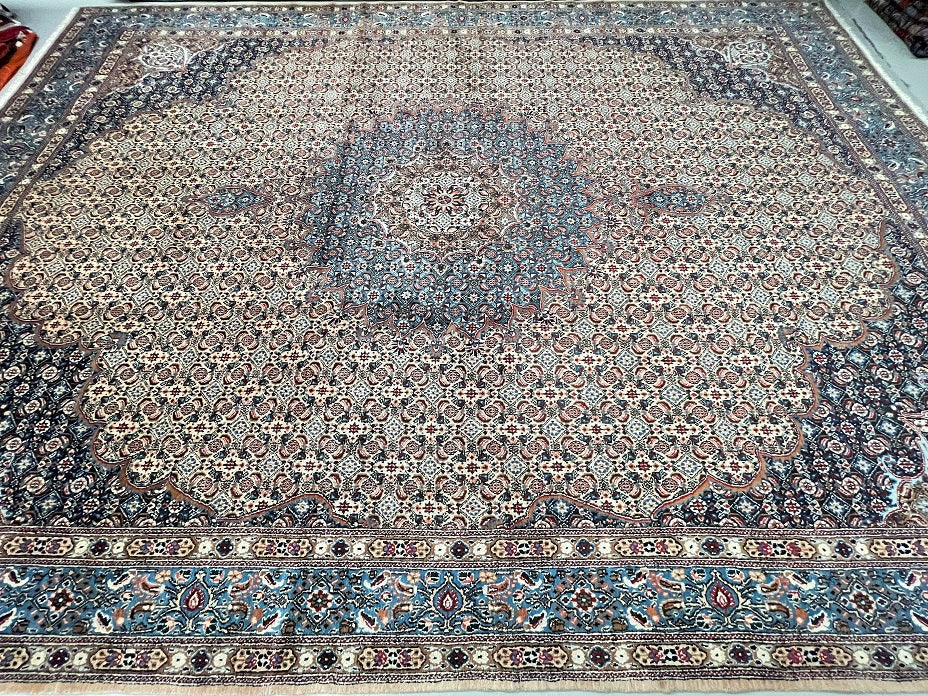 Large Room Size Authentic Handmade Persian Birjand Rug. Above All It Is Hard To Find This Quality Original Handmade Carpets In Larger Sizes. Pure Lamb’s Wool Pile On Cotton Foundation. It Also Has A Light Brown/Caramel, Beige And Blues Tone Dyed Using Traditional Methods. Fine Quality From City Of Birjand.