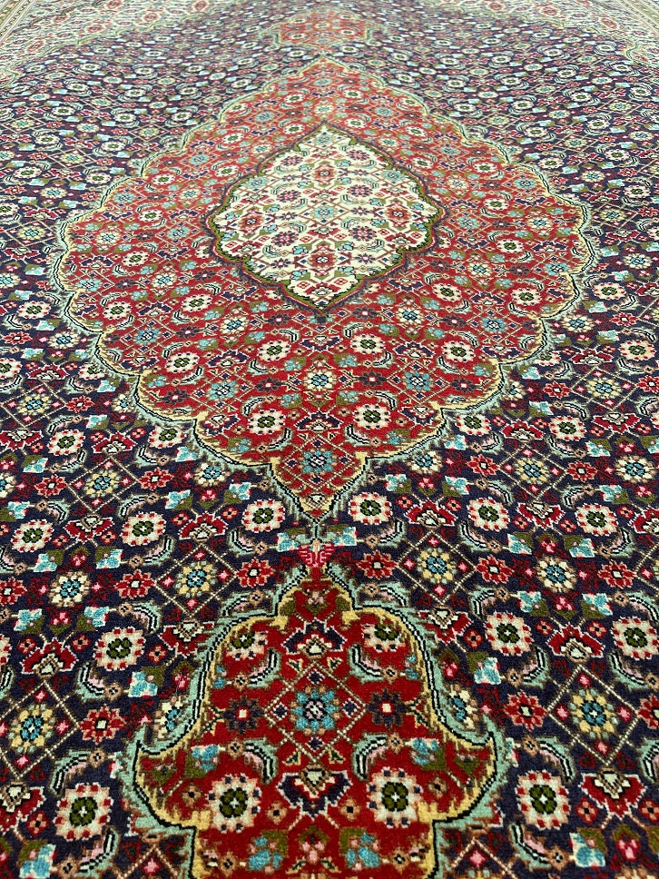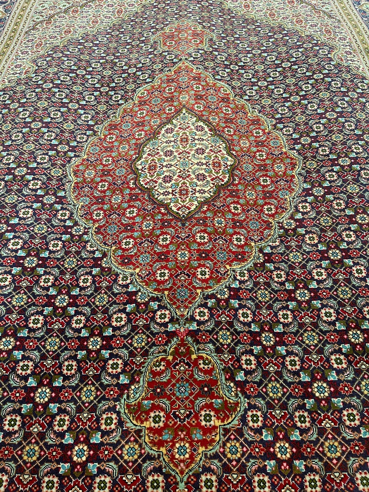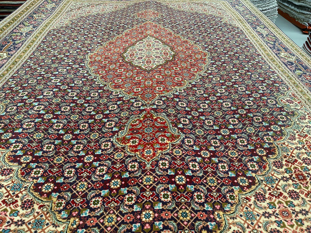 Masterpiece Full Room Size Hand Made Persian Tabriz Rug. Above All It Is Hard To Find This Quality Hand Made Carpet In Larger Sizes. Lamb’s Wool Pile on Cotton Base. Indigo Blue, Beige And Green Tones Dyed Using Traditional Methods. Pin Point Quality From Famous City Of Tabriz.