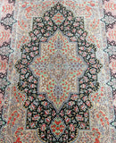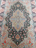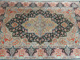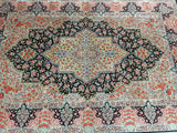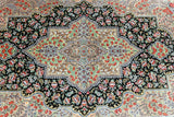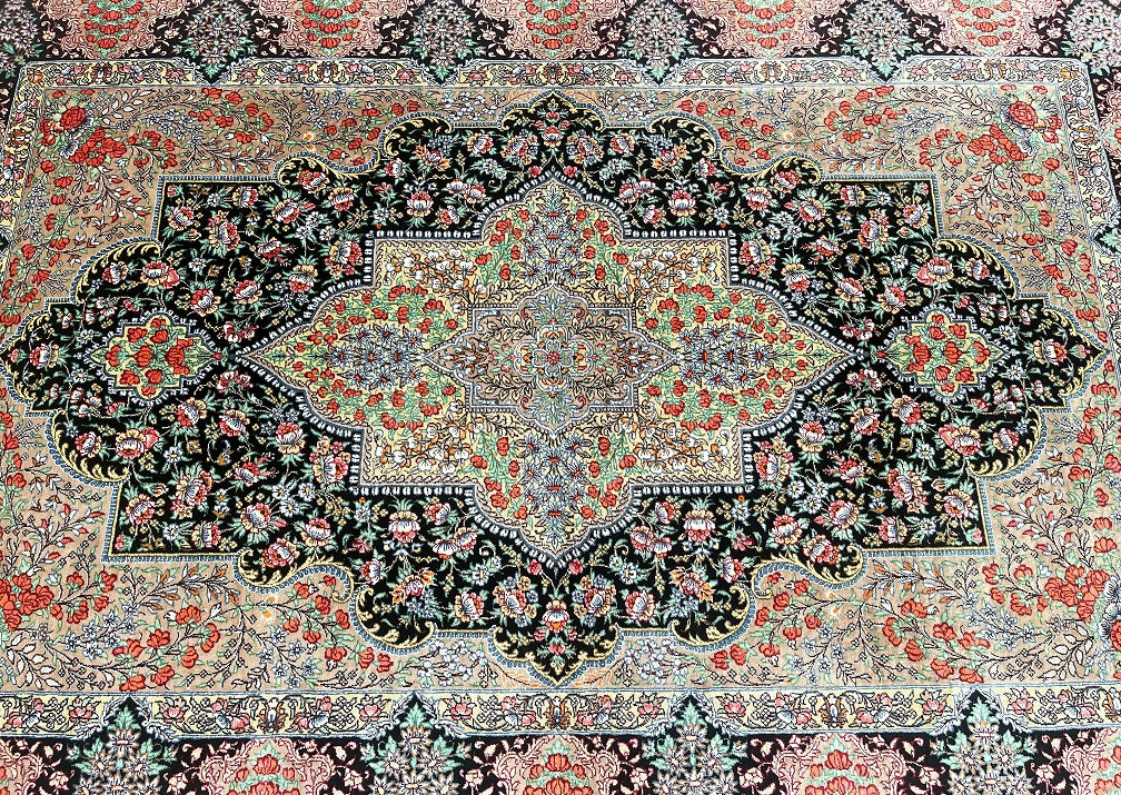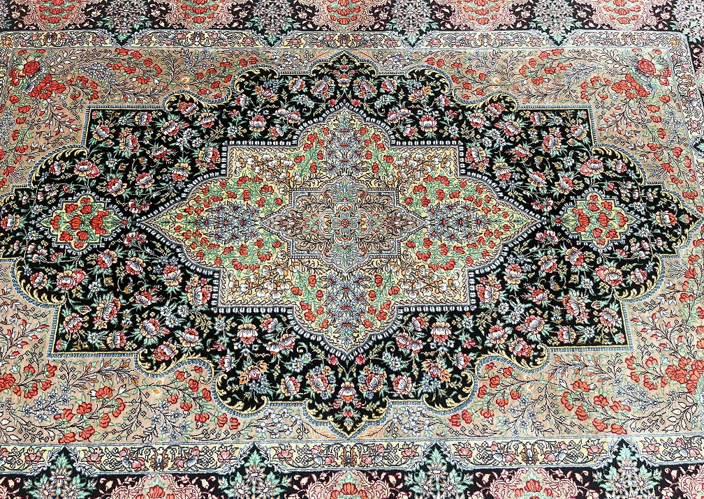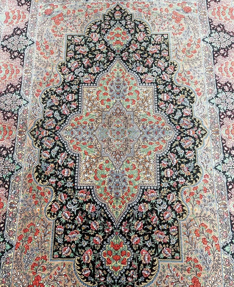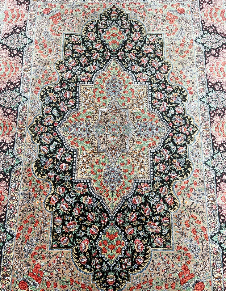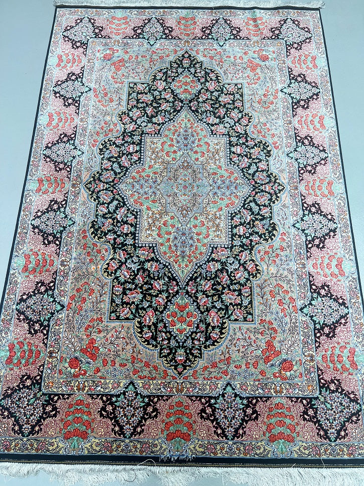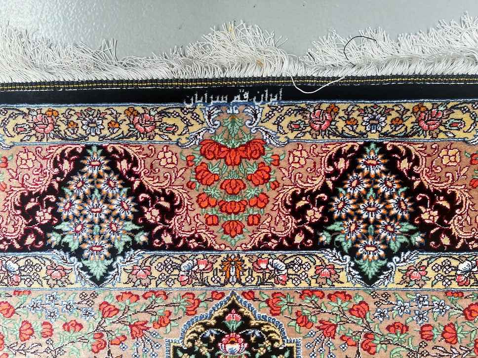 Masterpiece Authentic Handmade Persian Qum Silk Rug Signed. Above All It Is Hard To Get Such Top Quality Hand Made Rug In Pure Silk Material. Black, Green, Beige, Pink, Red And Orange Tone Dyed Using Traditional Methods. Pin-Point Quality Piece Which Is Considered To Be An Investment Item (Signed Sezarian).