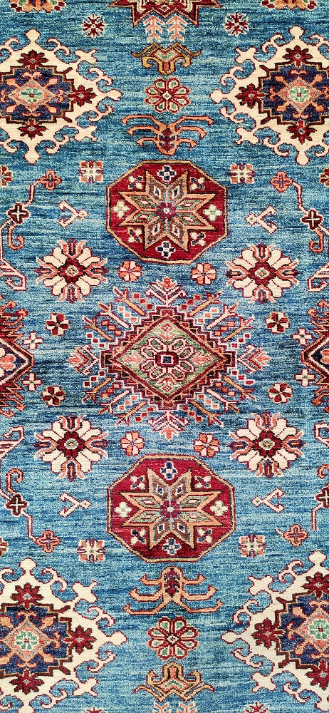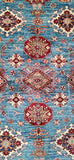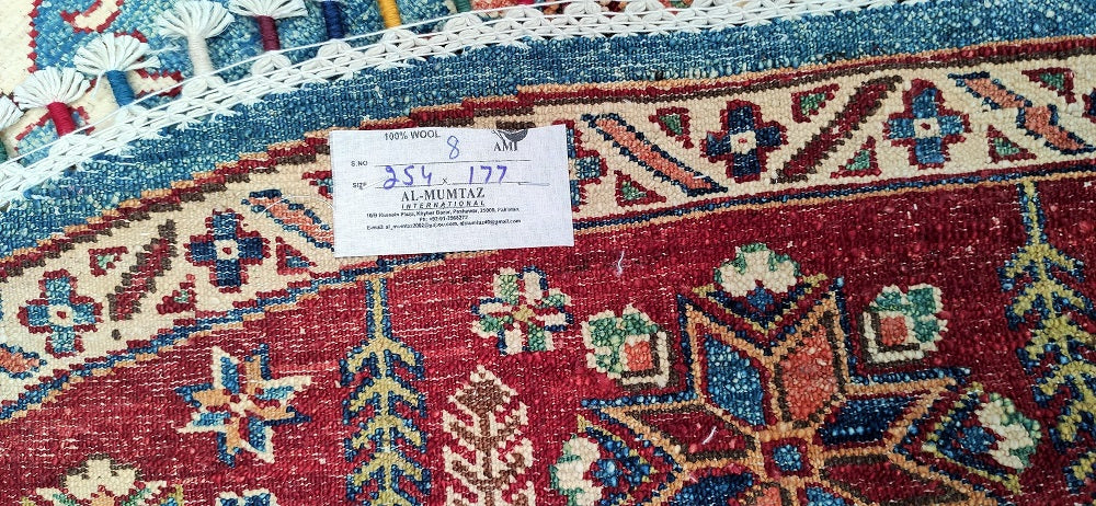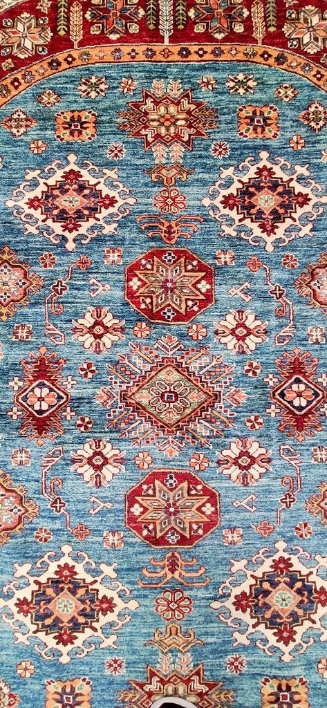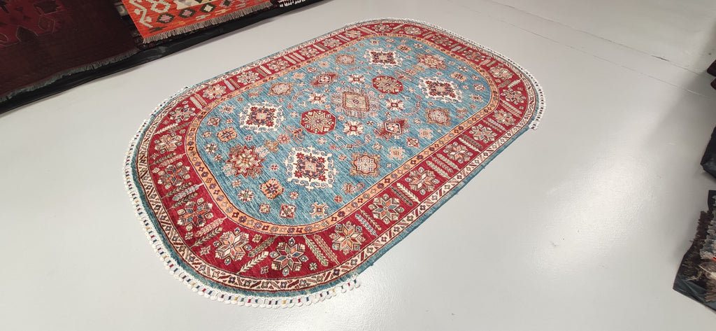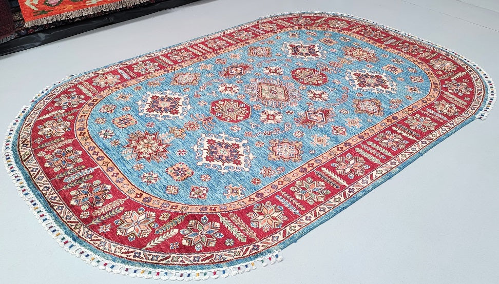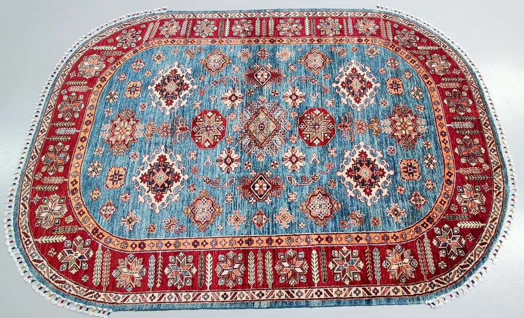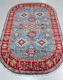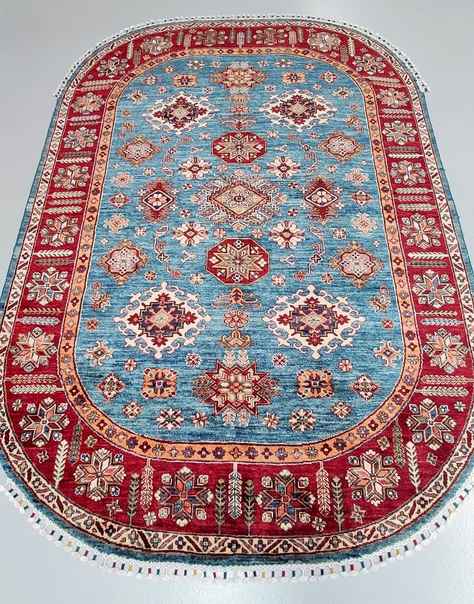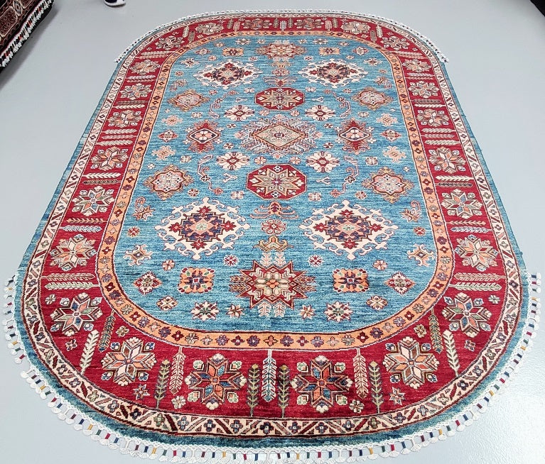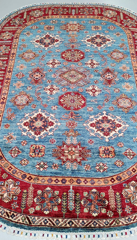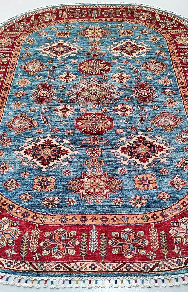 Gorgeous Room Size Hand Knotted Afghan Super Kazak Oval Rug. Above All It Is Very Hard To Weave Oval carpets. Pure Lamb’s Wool Pile On Cotton Base. Blue And Maroon Tone Dyed Using Traditional Methods (Vegetable Dyes). Last Of True Woven Tribal Art.