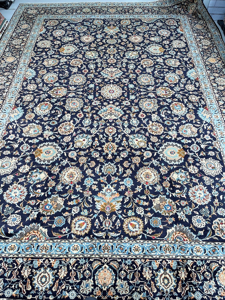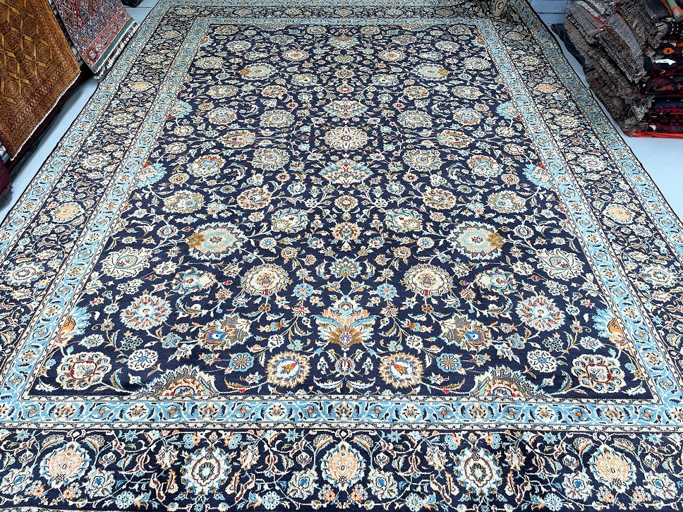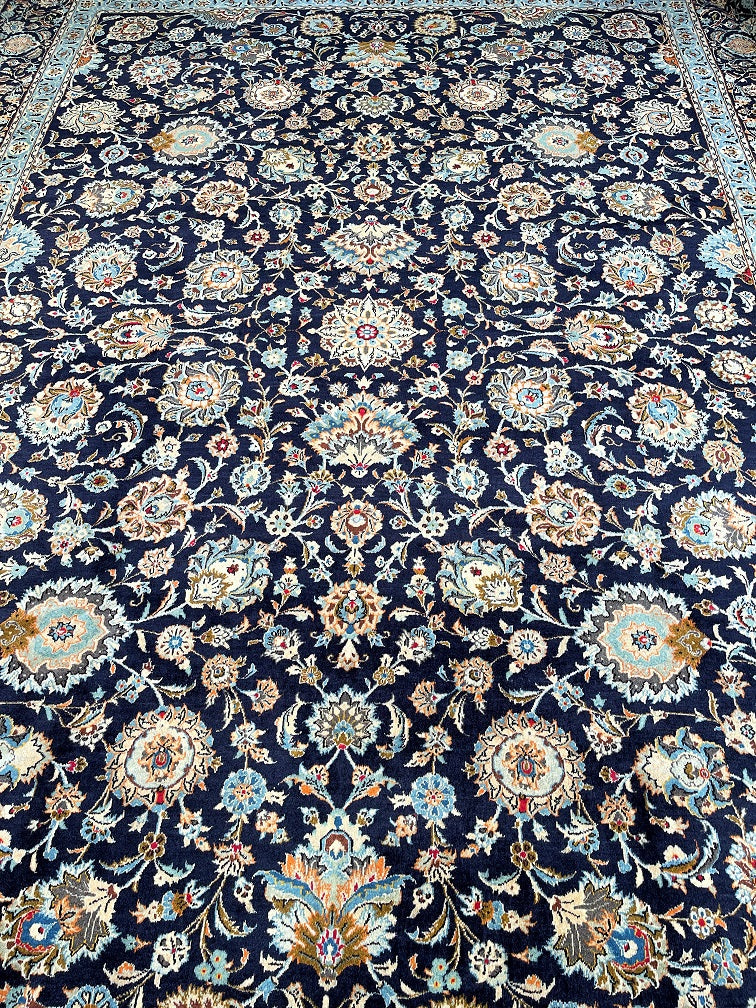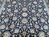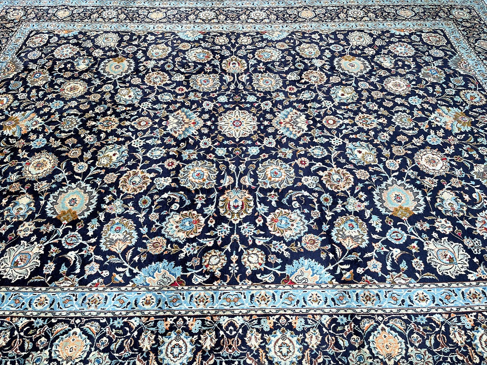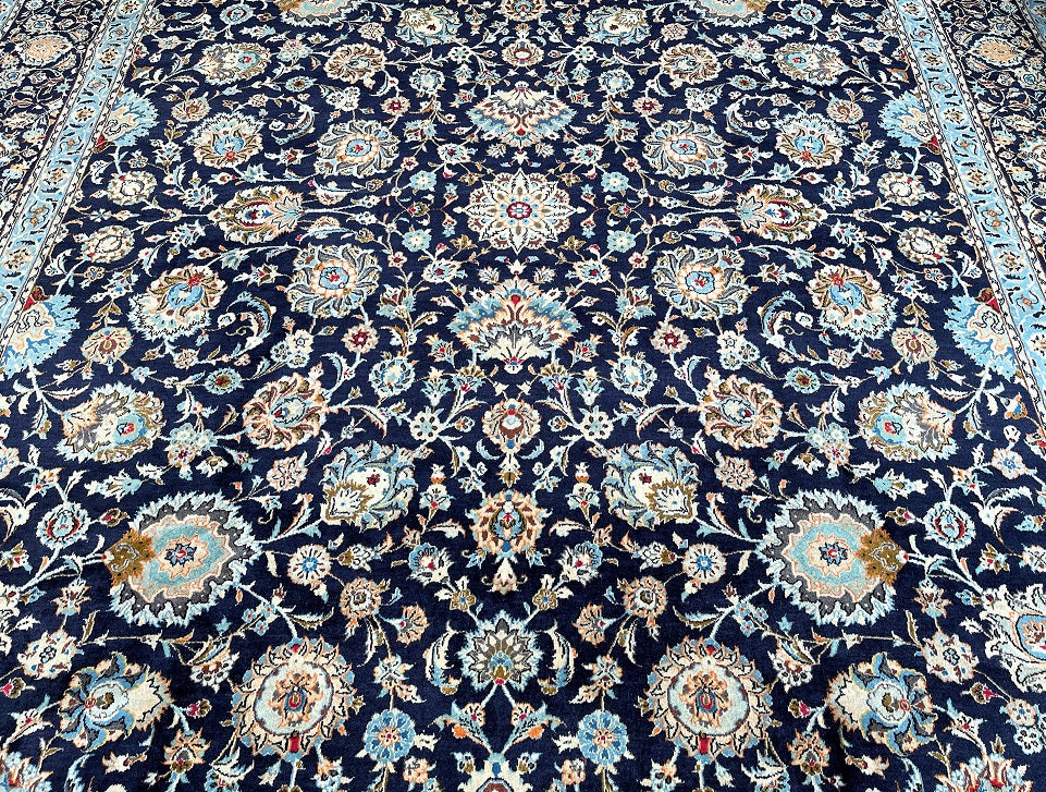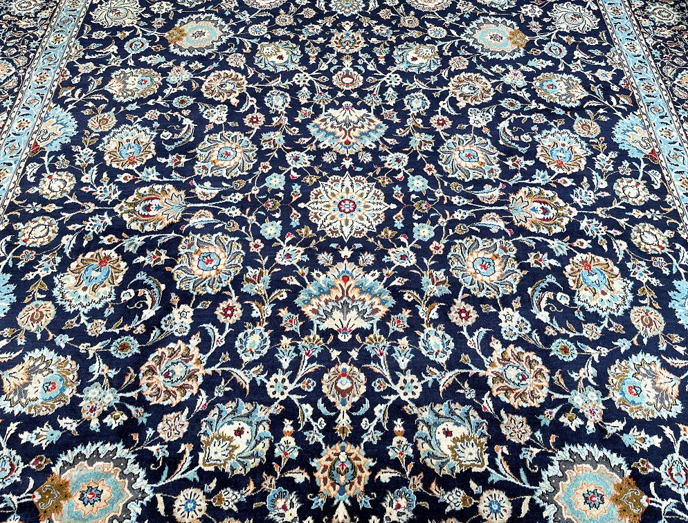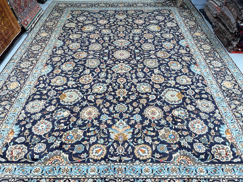 Oversize Authentic Handmade Persian Kashan Rug. Above All It Is To Find Handmade Rugs In Extra Large Sizes. It Also Has A Pure Lamb’s Wool Pile On Cotton Base. It Also Has An Indigo Blue, Beige, Light Blue, Gold and Brown Tones Dyed Using Traditional Method.