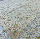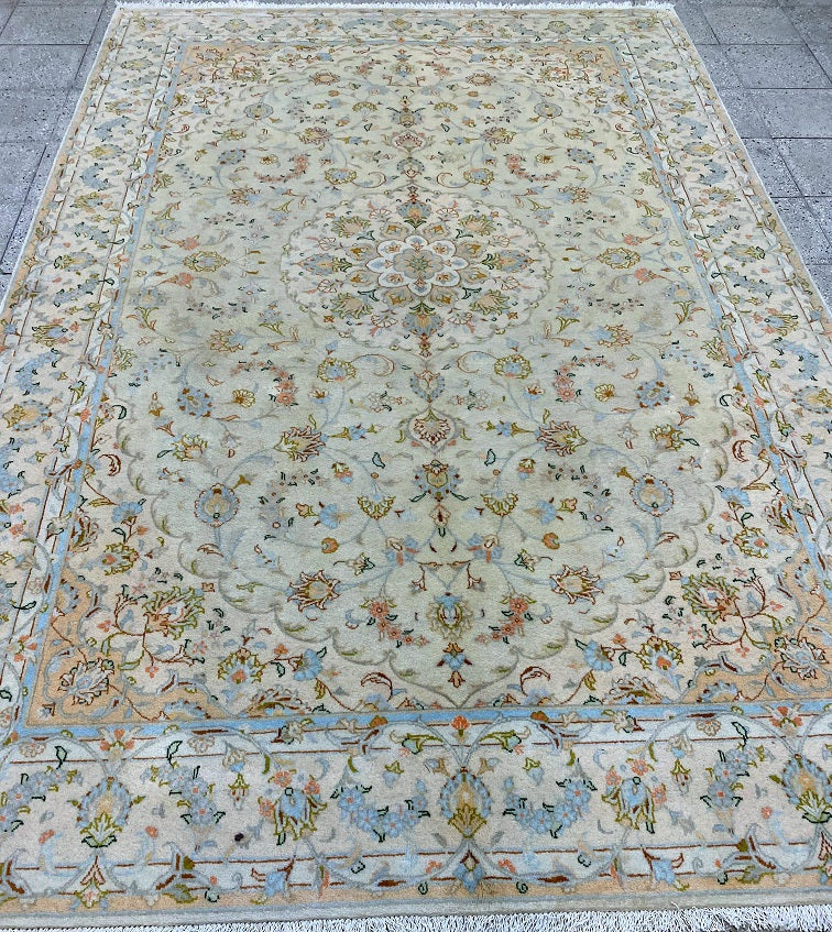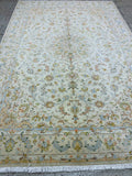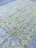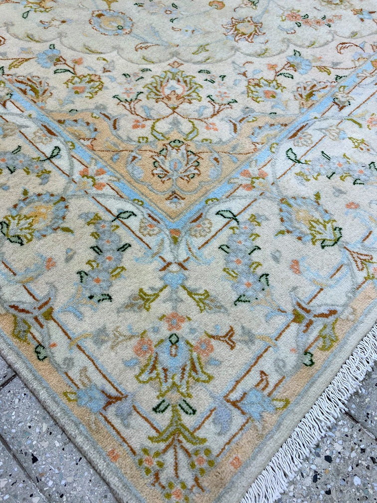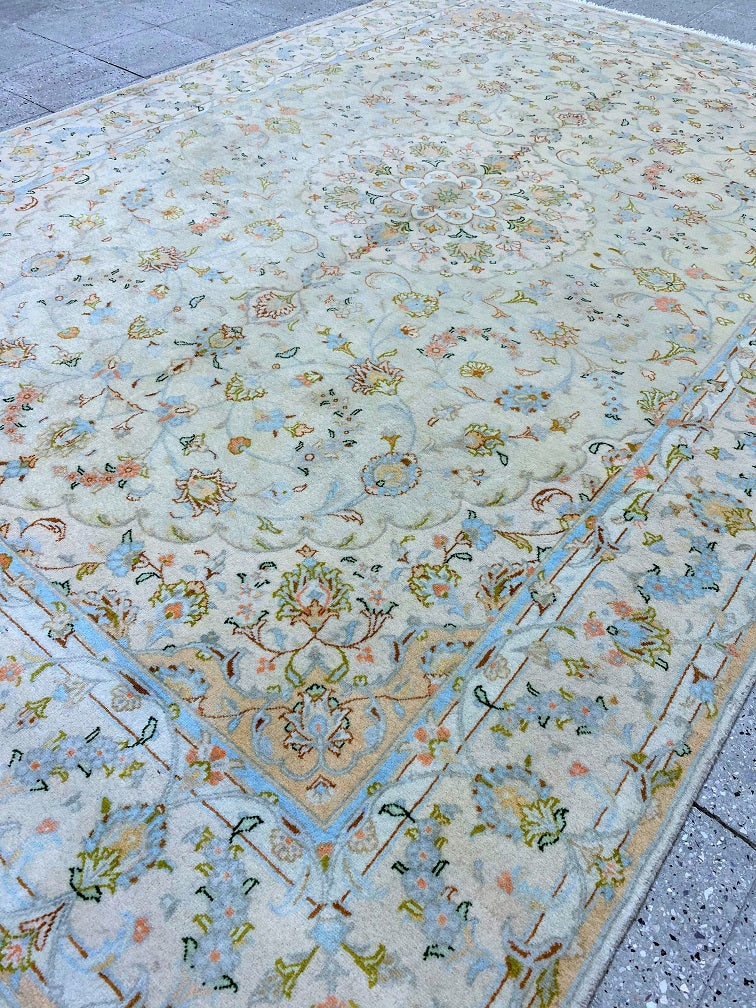 Full room size authentic handmade Persian Kashan rug. It has a pure wool pile on cotton base. Stunning Pastel tone (beige, Gold, Aqua blue, soft orange, green and mustard) tone dyed using traditional methods.