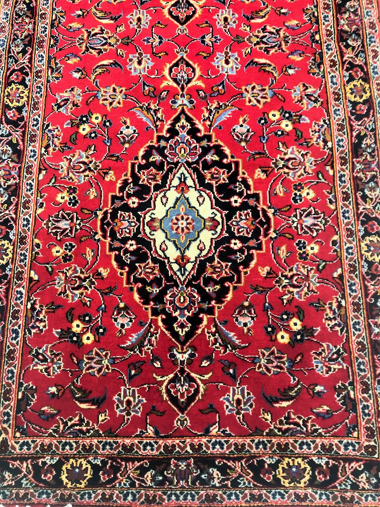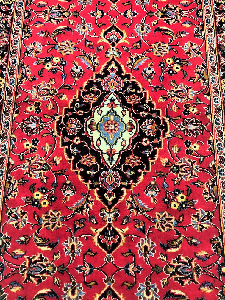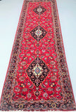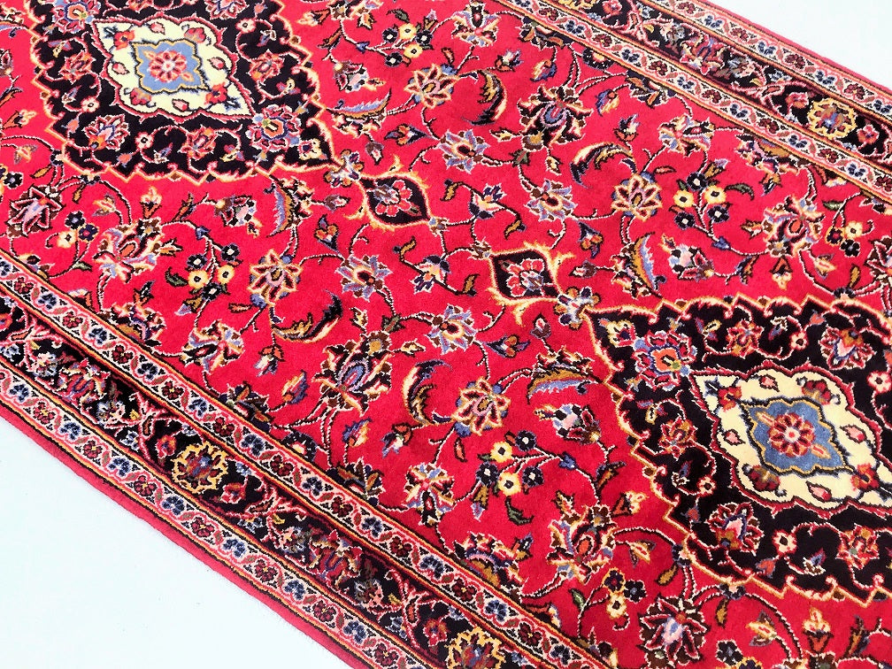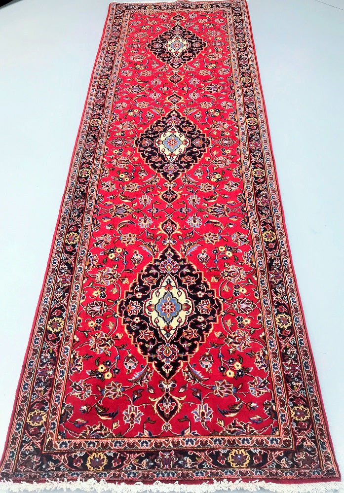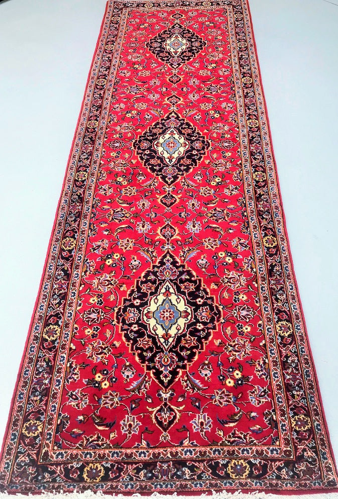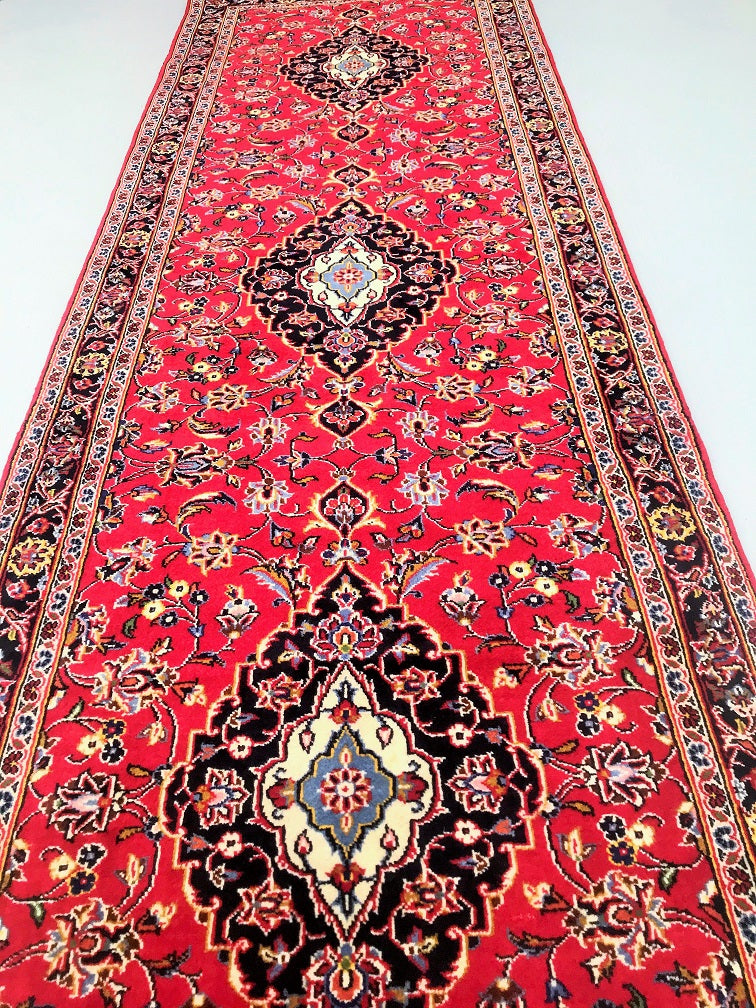 Fine 3m authentic Persian Kashan runner. Above all it is hard to get this quality Original handmade Runners. It has a pure lamb’s pile on cotton base. Red and blue tones dyed using traditional methods.
