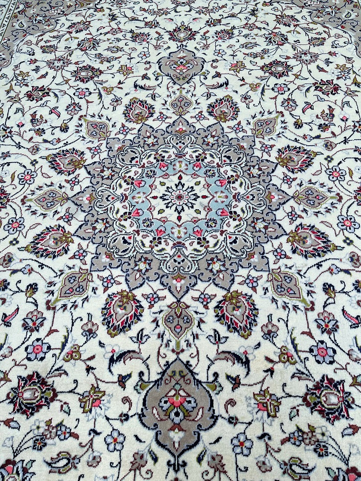 Large Room Size Authentic Handmade Persian Kashan Rug. Above All This Rug Has A Pure Lamb’s Wool Pile On Cotton Base. Beige, Light Brown, Green, Pink and Blue Tones Dyed Using Traditional Methods. Dense Quality Piece That Would Last A Life Time.