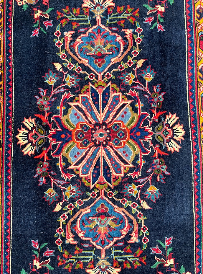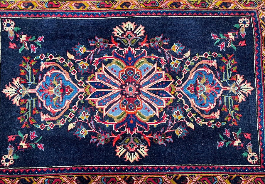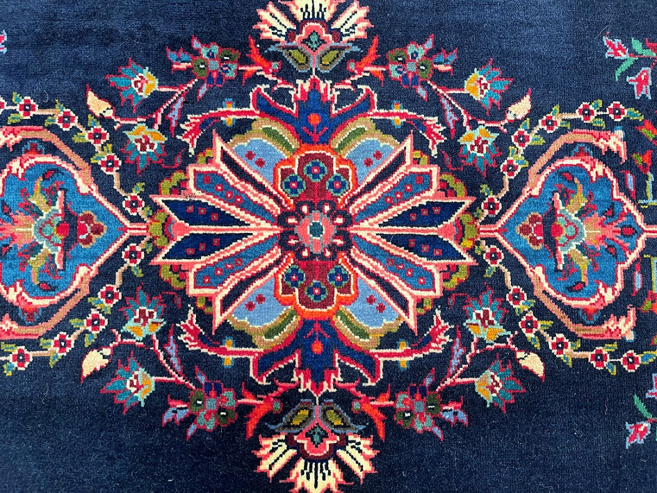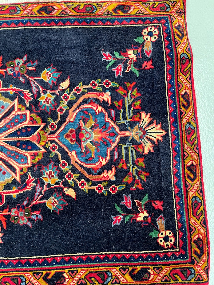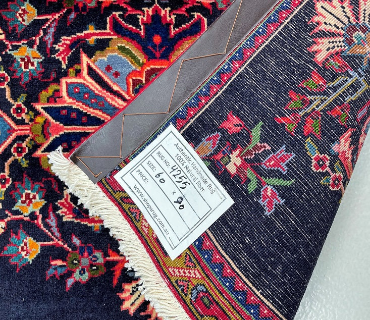 Fine Door Mat Size Authentic Handmade Persian Kashan Rug. Above All We Do Have This Rug In A Matching Pair. It also Has a Pure Lamb’s Wool Pile on Cotton Base. Indigo Blue, Beige, Pink, Gold, Green And Red Tones Dyed Using Traditional Methods.