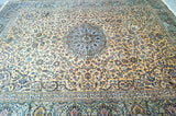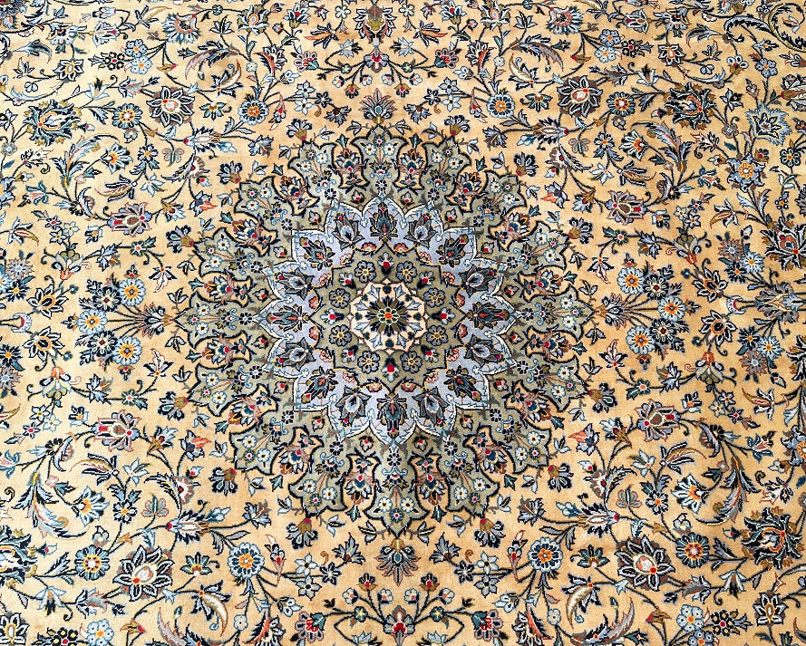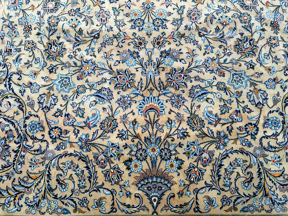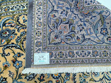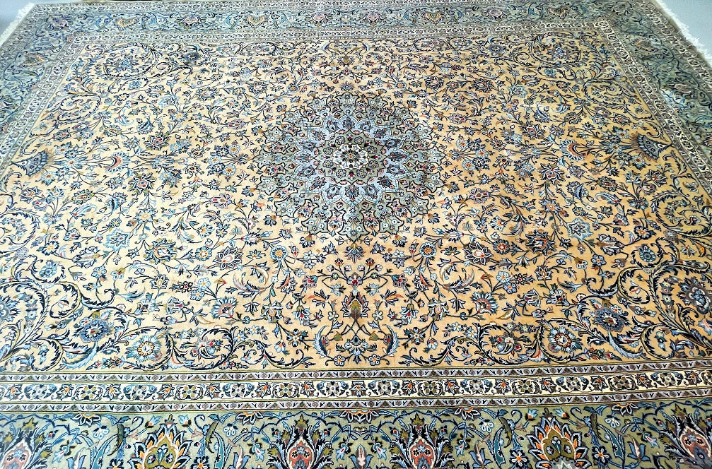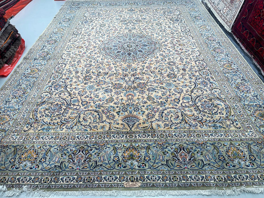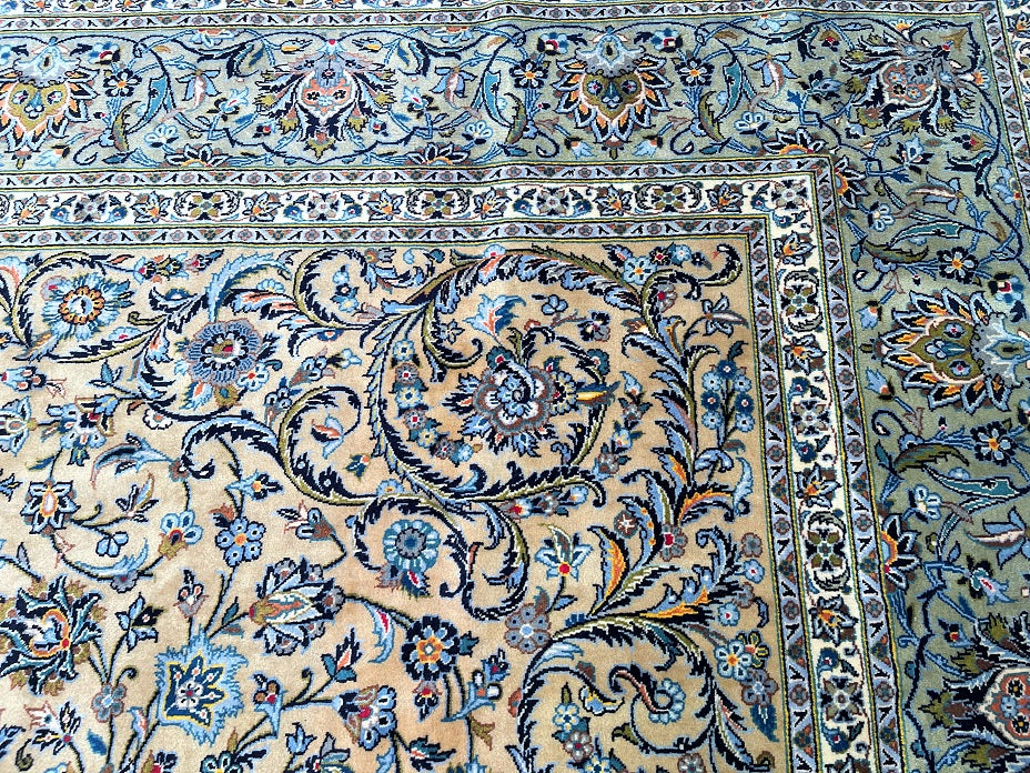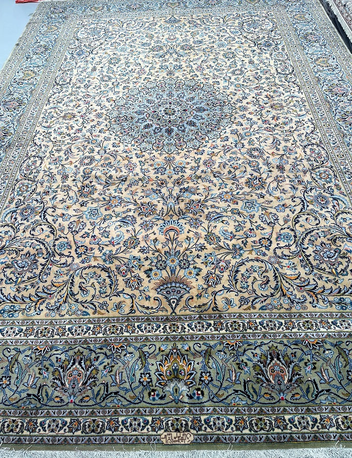 Top Quality Large Room Size Authentic Handmade Persian Kashan Rug Signed. Above All This Is a Superfine Weaved Rug From Weaving House Of “Isfahanian-Kashan”. Pure Lamb’s Wool Pile On Cotton Base. It Also Has A Rare Ocher, Beige, Light Blue, Green, Orange, Pink And Indigo Blue Tones Dyed Using Traditional Method.