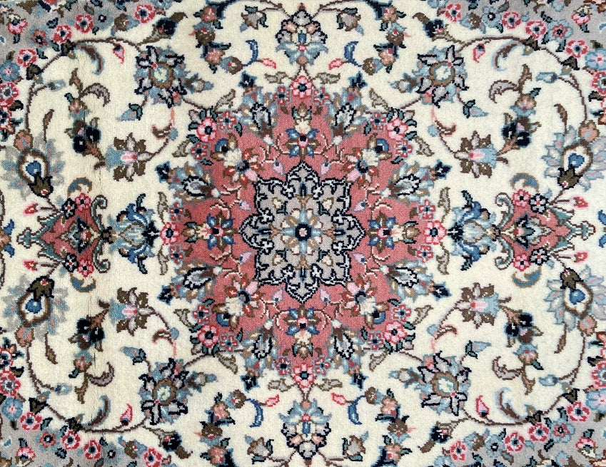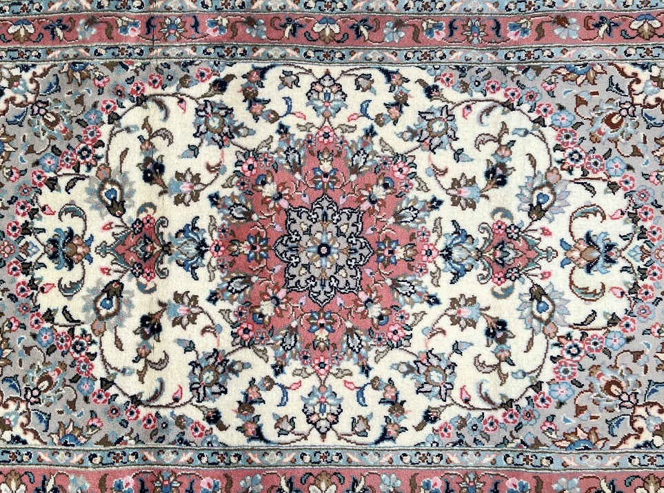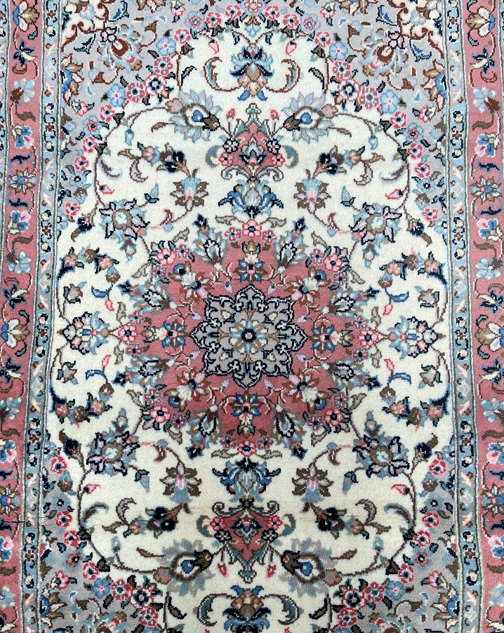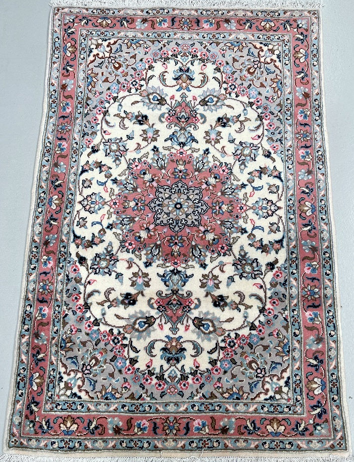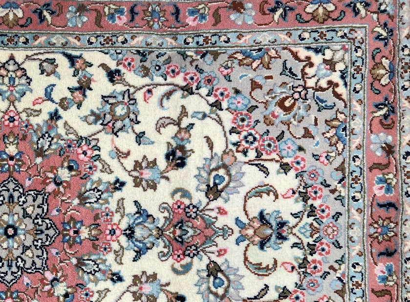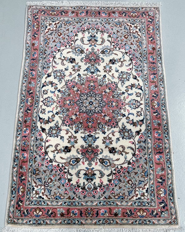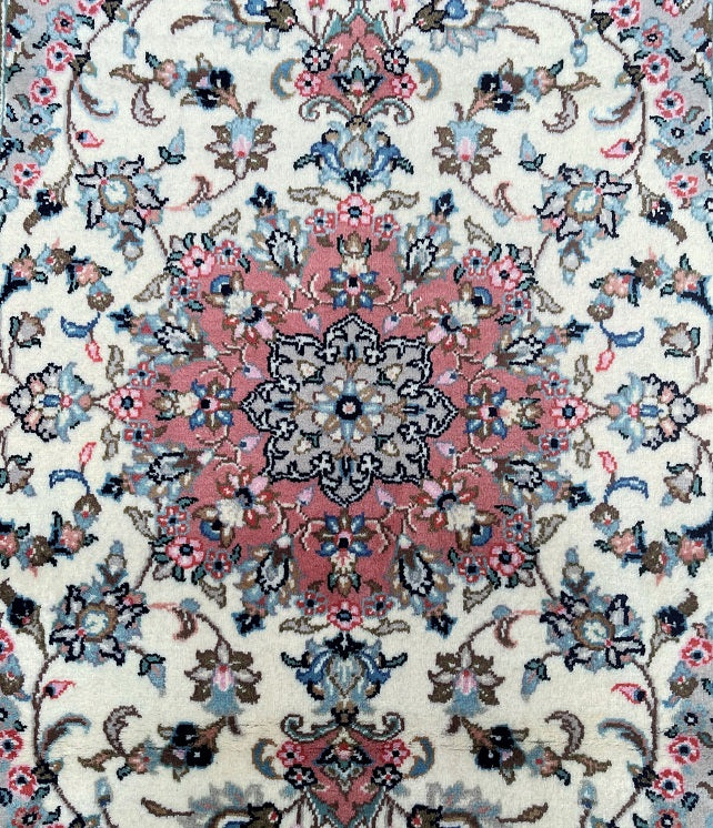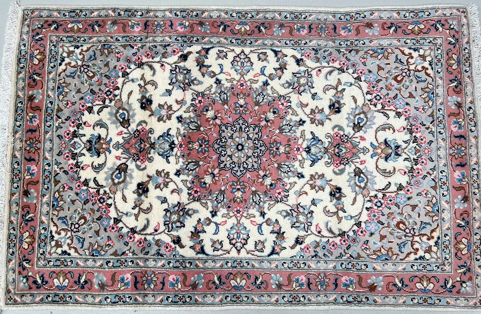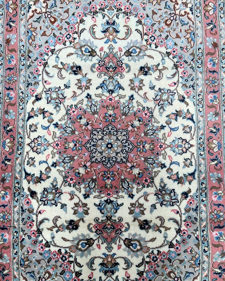 Authentic Handmade Persian Kashmar Rug. Above It Has A Lamb’s Wool Pile On Cotton Base. Beige, Pink And Blue Tones Dyed Using Traditional Methods.