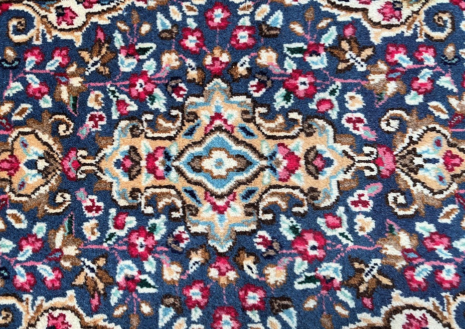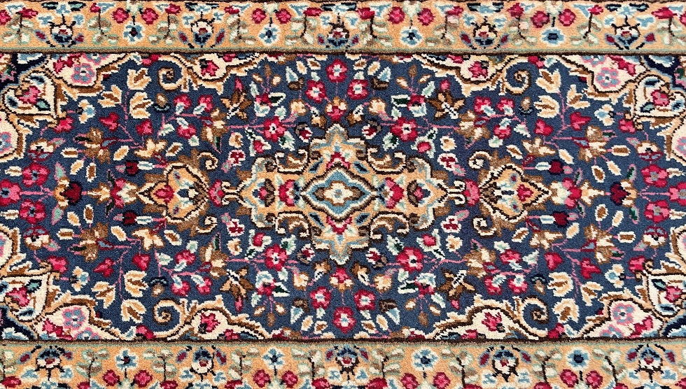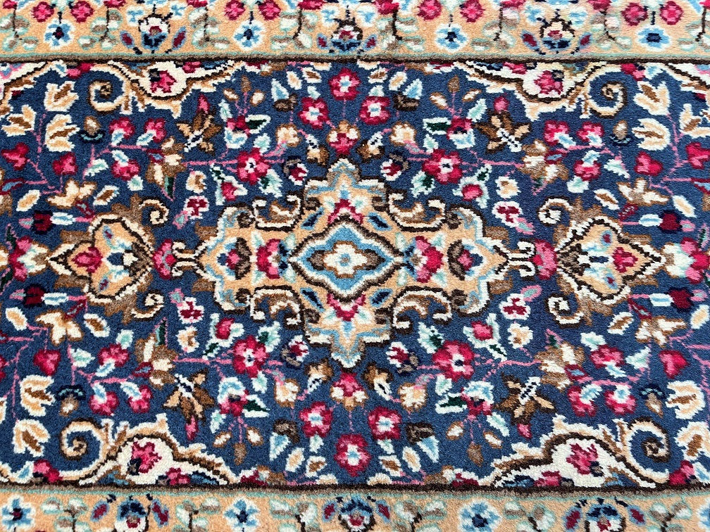 Authentic Handmade Persian Kerman Short Hall Runner Rug. Above All We Do Have This Rug In A Matching Pair. It also Has A Pure Lamb’s Wool Pile on Cotton Base. Light Blue, Beige, Pink, Peach, Mustard, Brown And Red Tones Dyed Using Traditional Methods.
