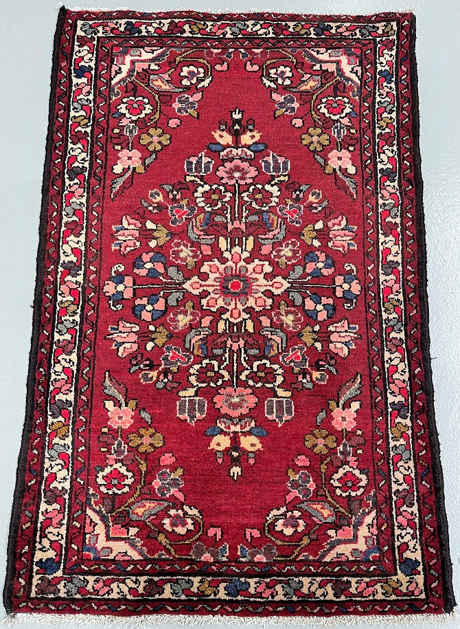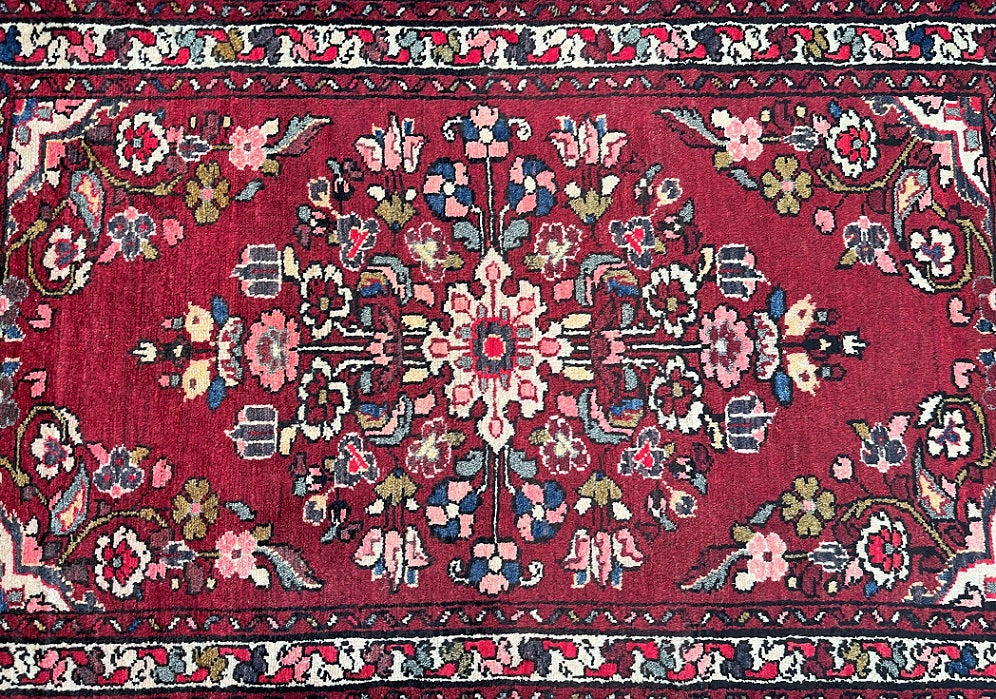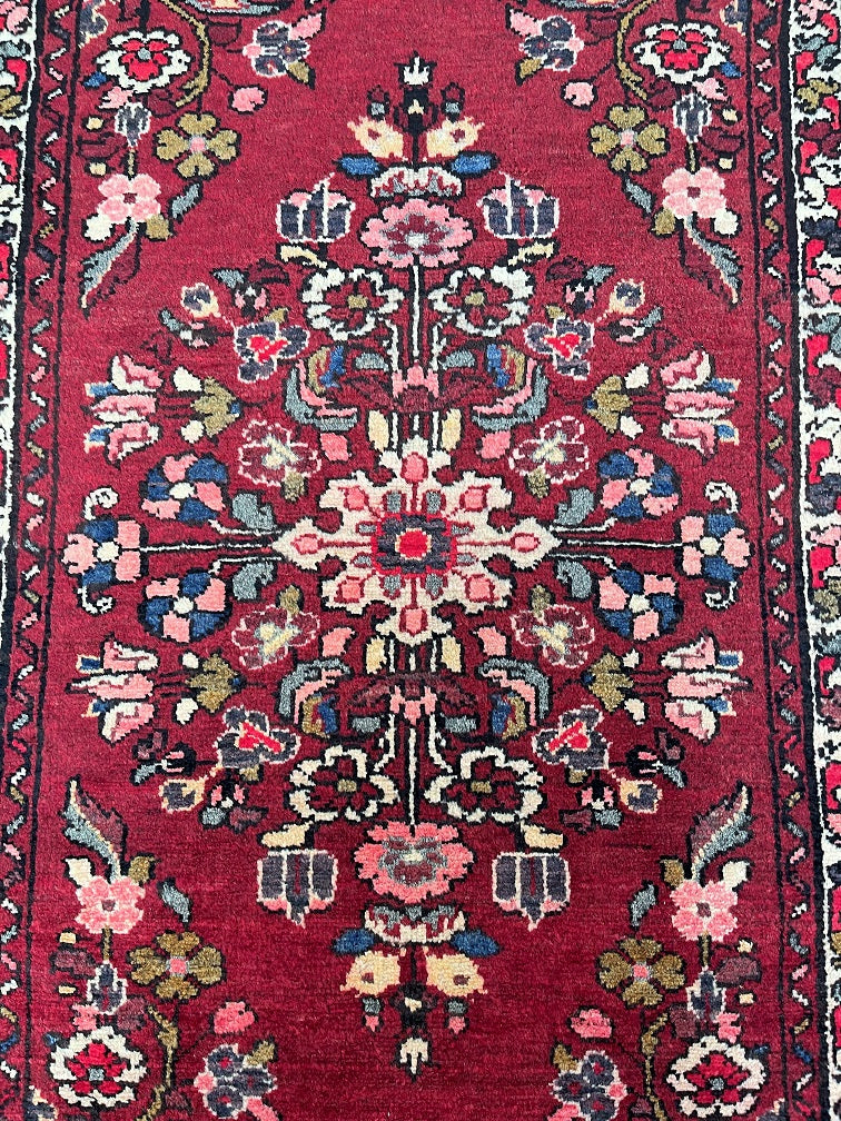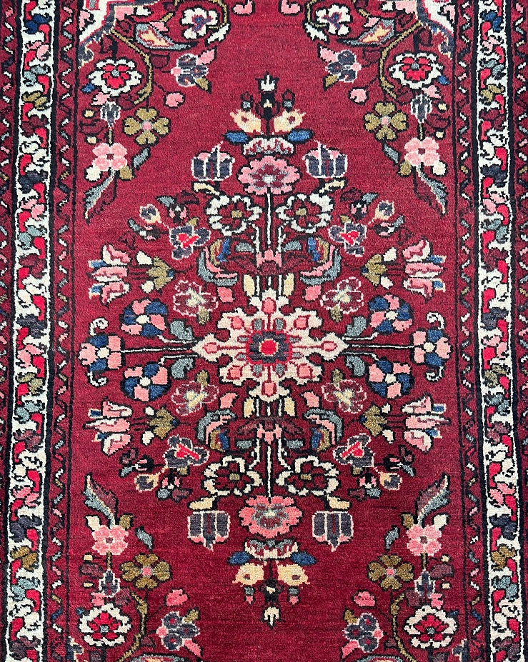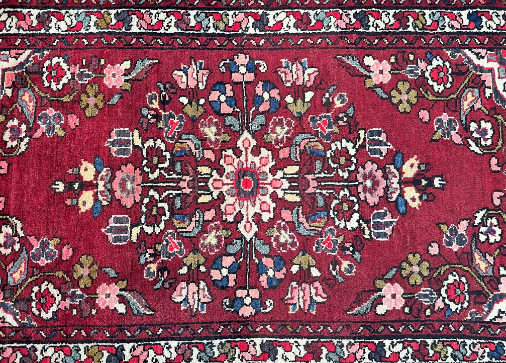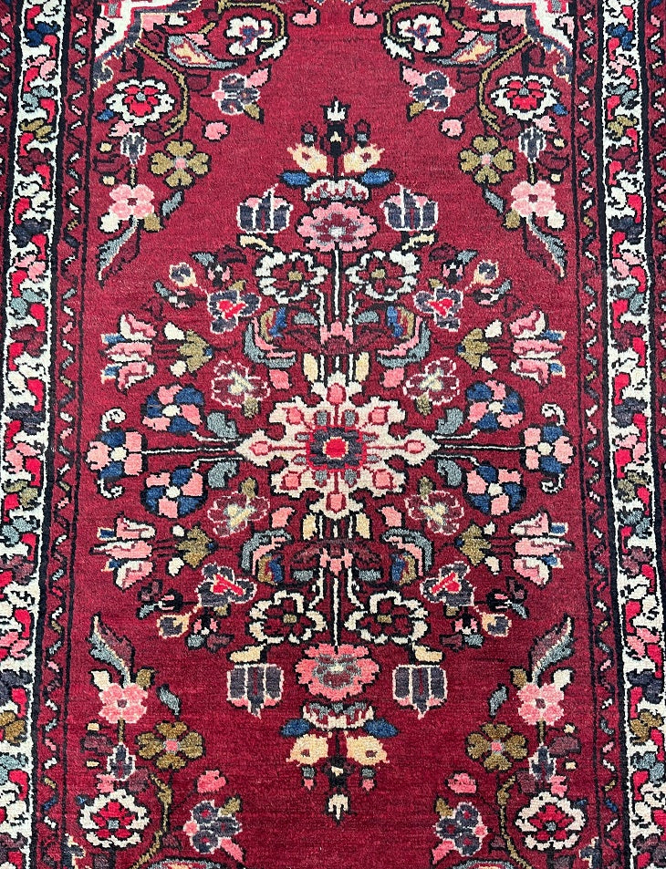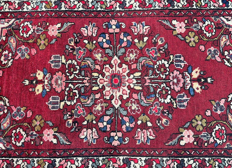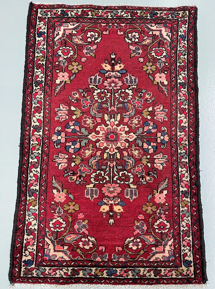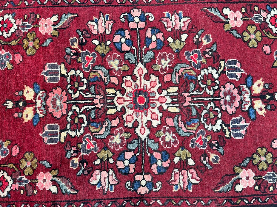 Authentic Handmade Vintage Armenian Lilian Rug Which Also Can Be Used As A Short Runner. It Also Has A Pure Hand Spun Wool Pile On Cotton Base. It Has a Burgundy Red, blue, Beige, Green And Pink Tones Dyed Using Traditional Methods.