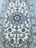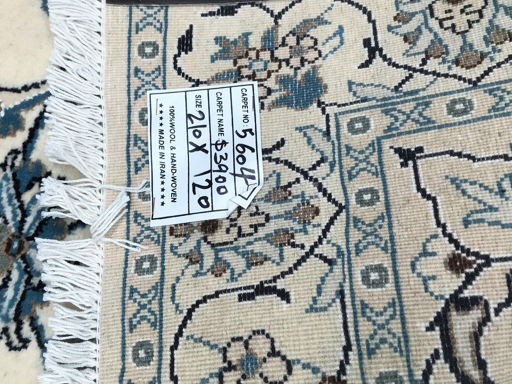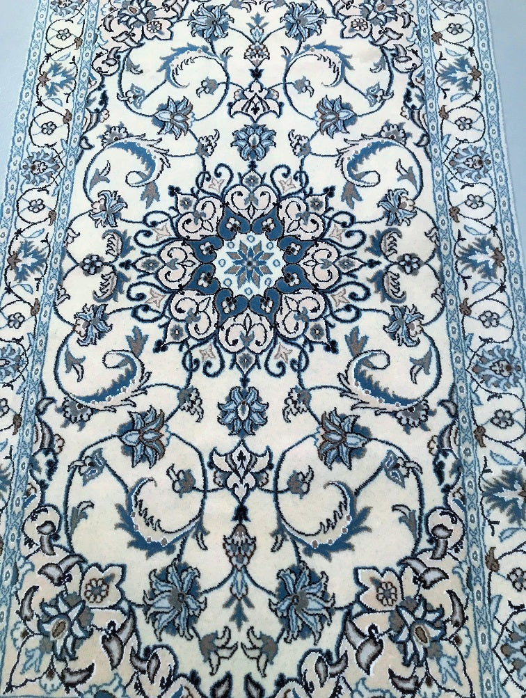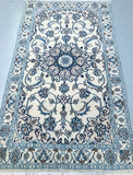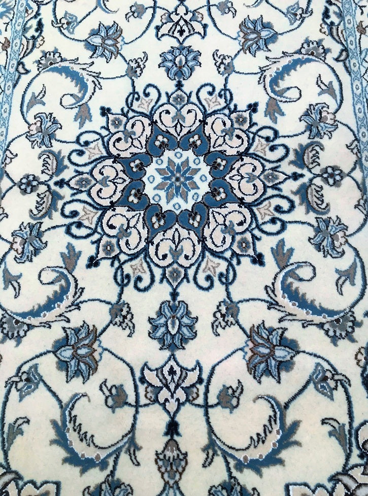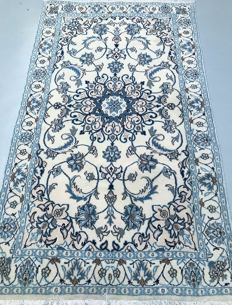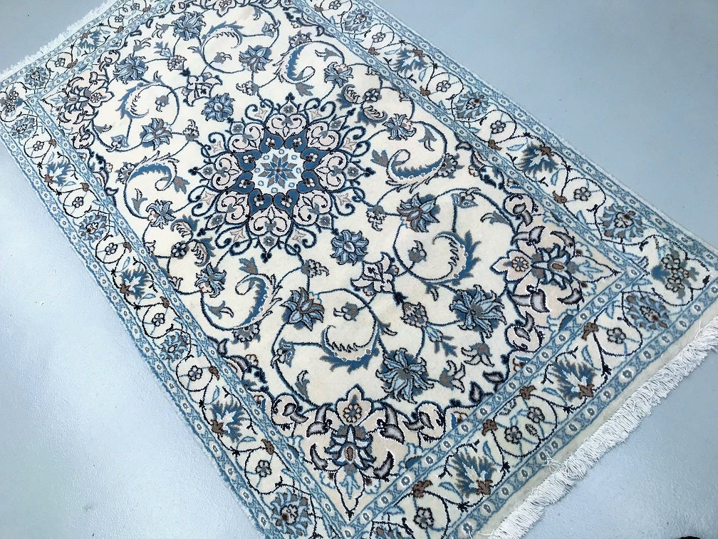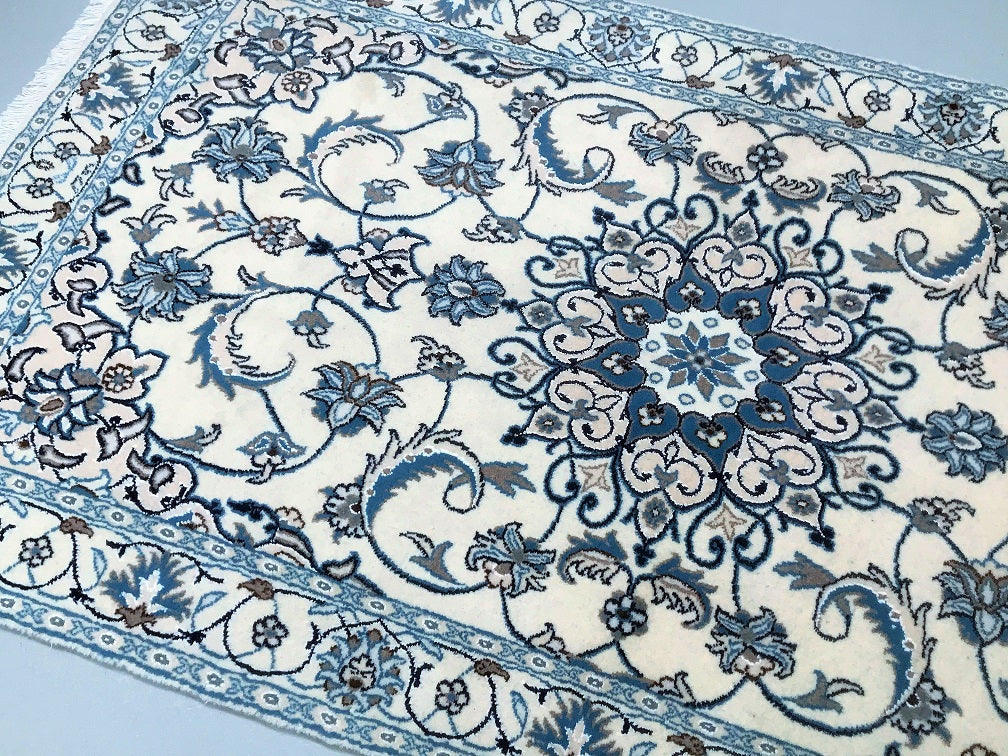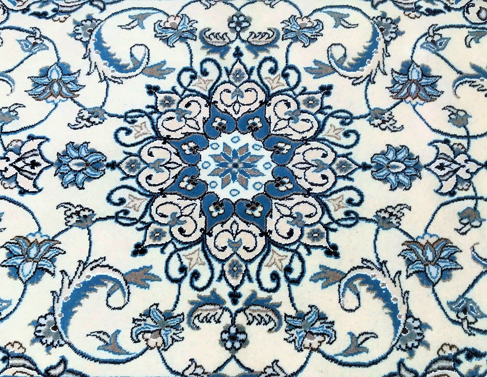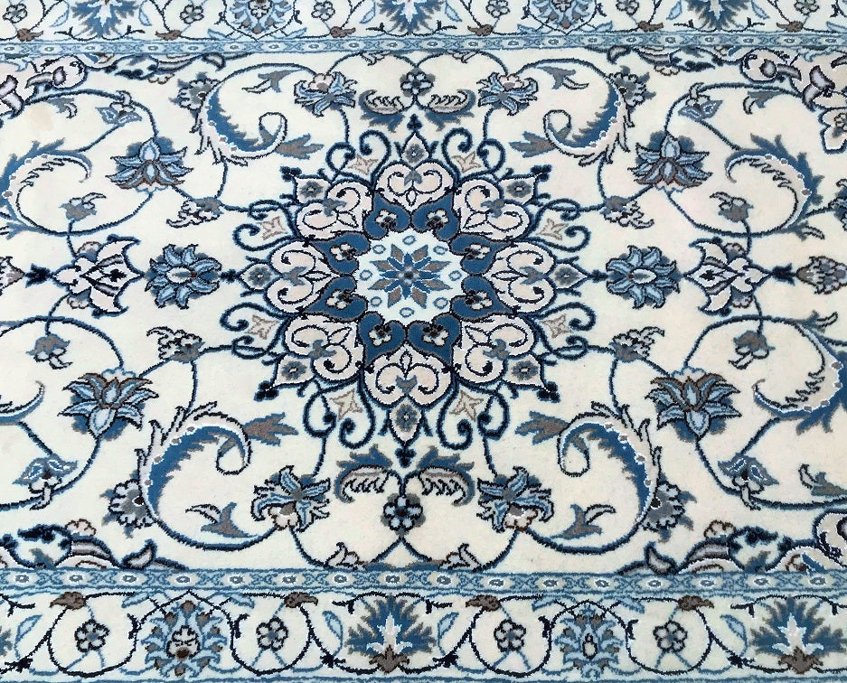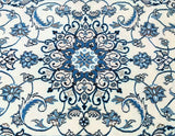 Fine Coffee Table Size Hand Knotted Persian Nain Rug. Above All It Has a Lamb’s Wool Pile on Cotton Base. Beige, Grey and Blue Tone Dyed Using Traditional Methods. Fine Quality Piece from City Of Nain.