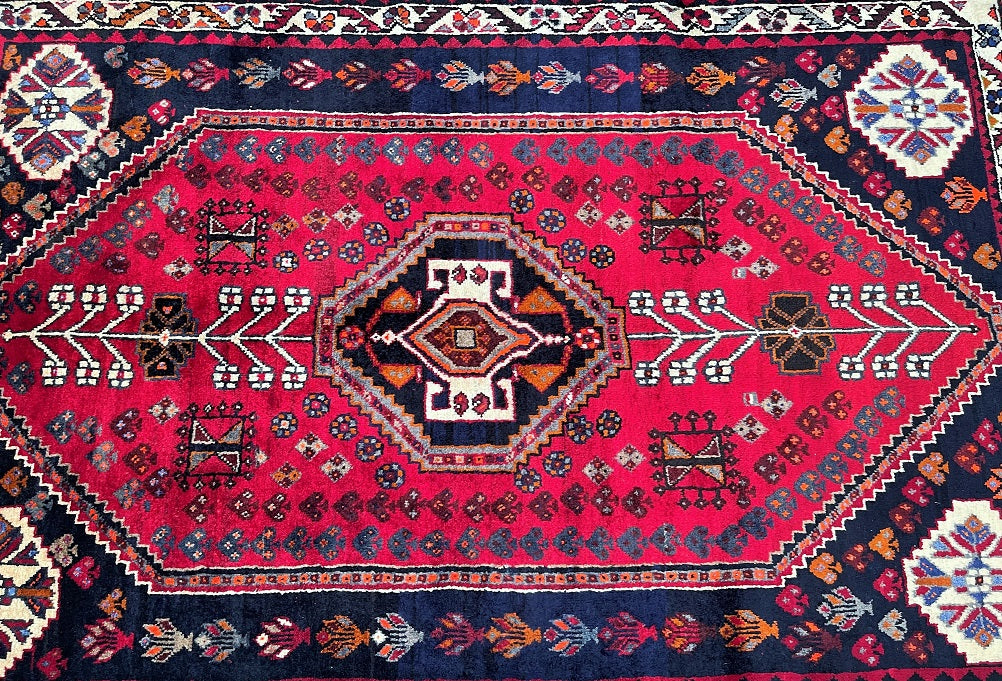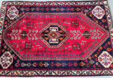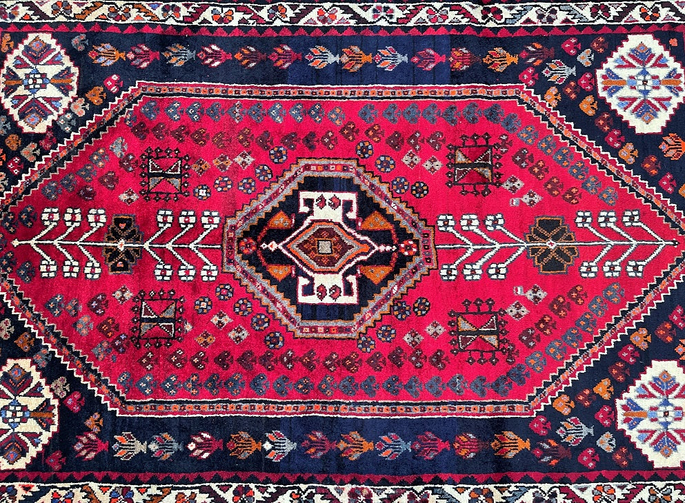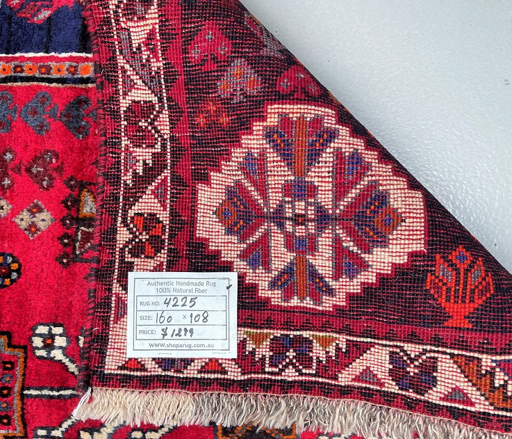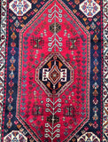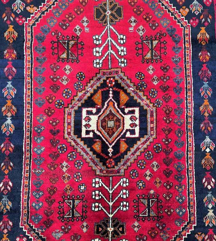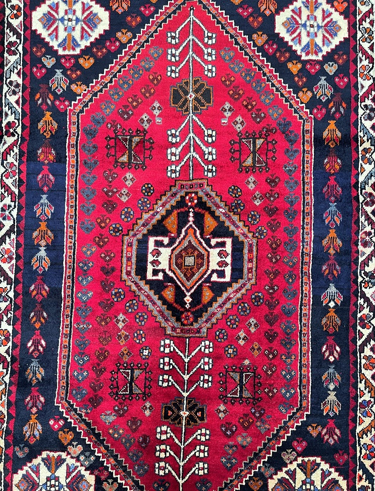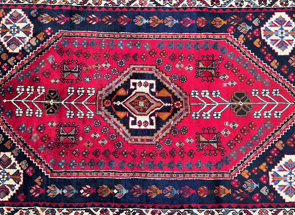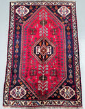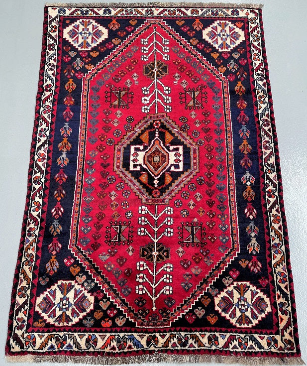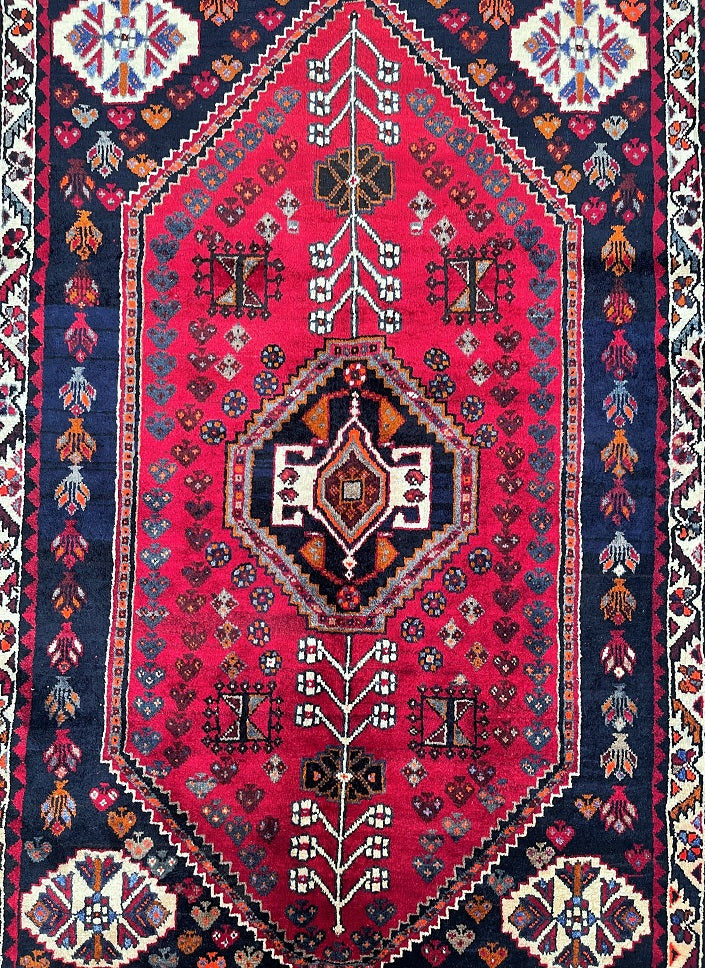 Handmade Persian Qashqai Shiraz rug, known for its dense and high-quality craftsmanship. This rug features a luxurious pile made of pure hand-spun wool, skillfully woven onto a wool base. The color palette is a captivating blend of red, beige, green, blue, black, yellow, orange, and brown tones, achieved through traditional dyeing methods. The design showcases a central medallion that combines elements of both floral and geometric patterns, creating a unique and visually appealing composition. The level of skill and dedication is evident, as it would have taken a weaver approximately 4 months to complete this piece. Hand-woven in the Shiraz district of South Persia, this rug measures 160 x 108 cm and holds a gallery replacement value of $2,299