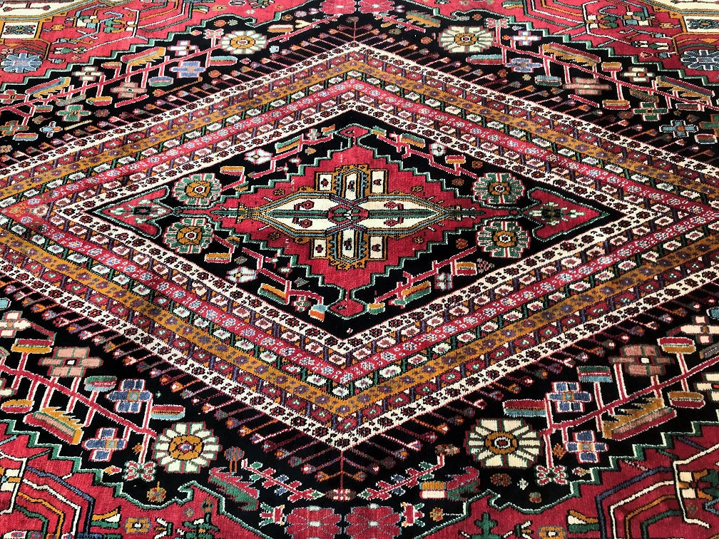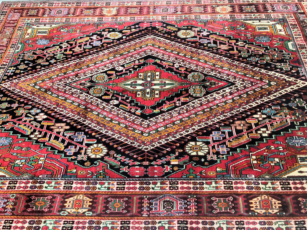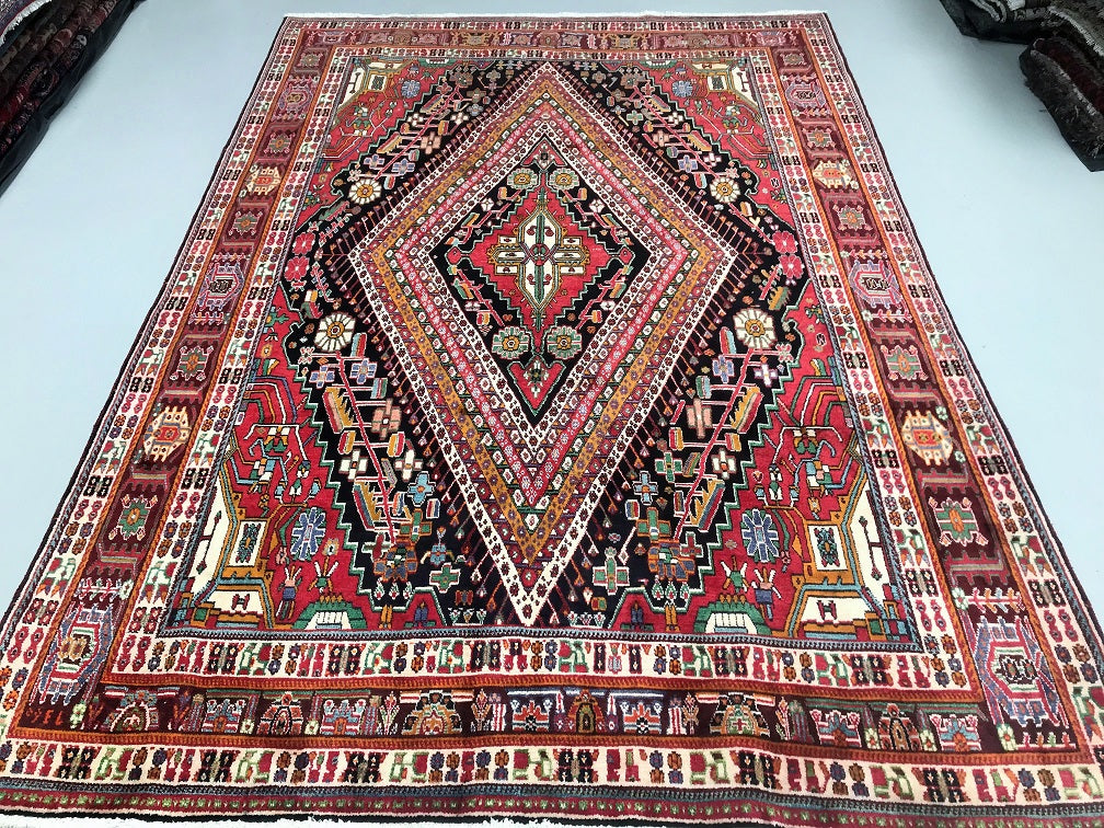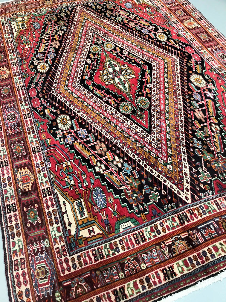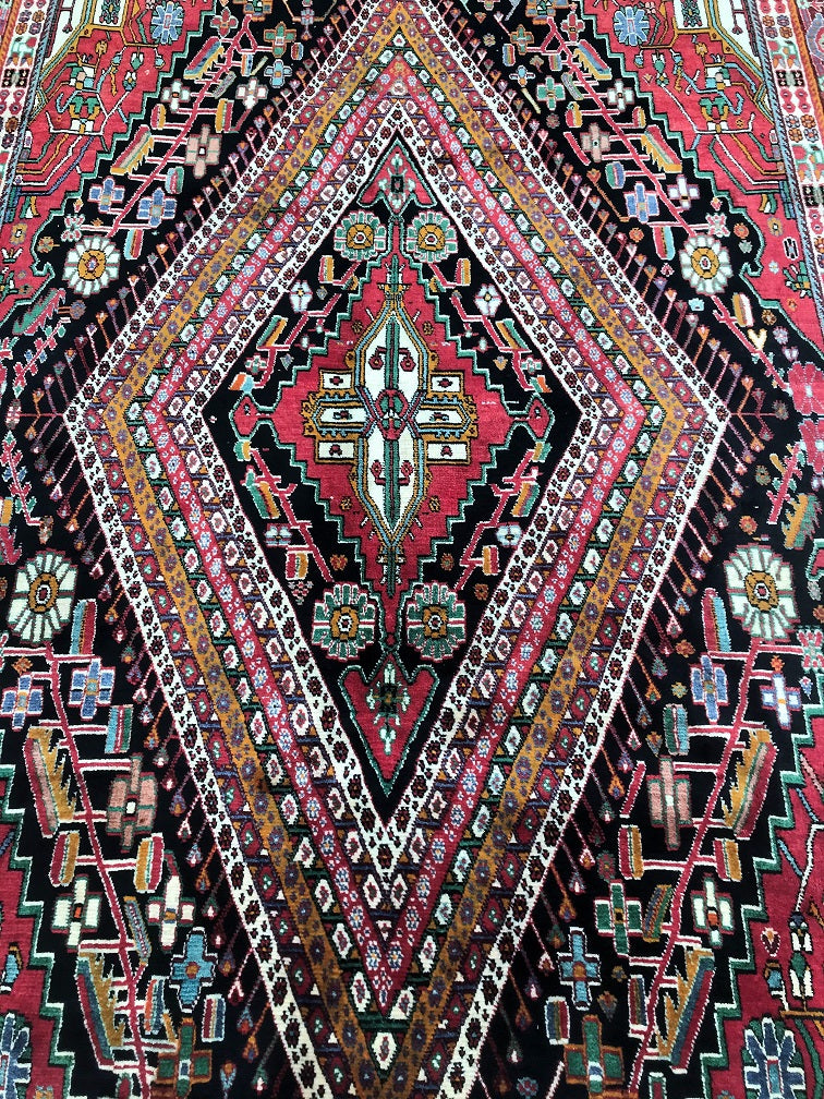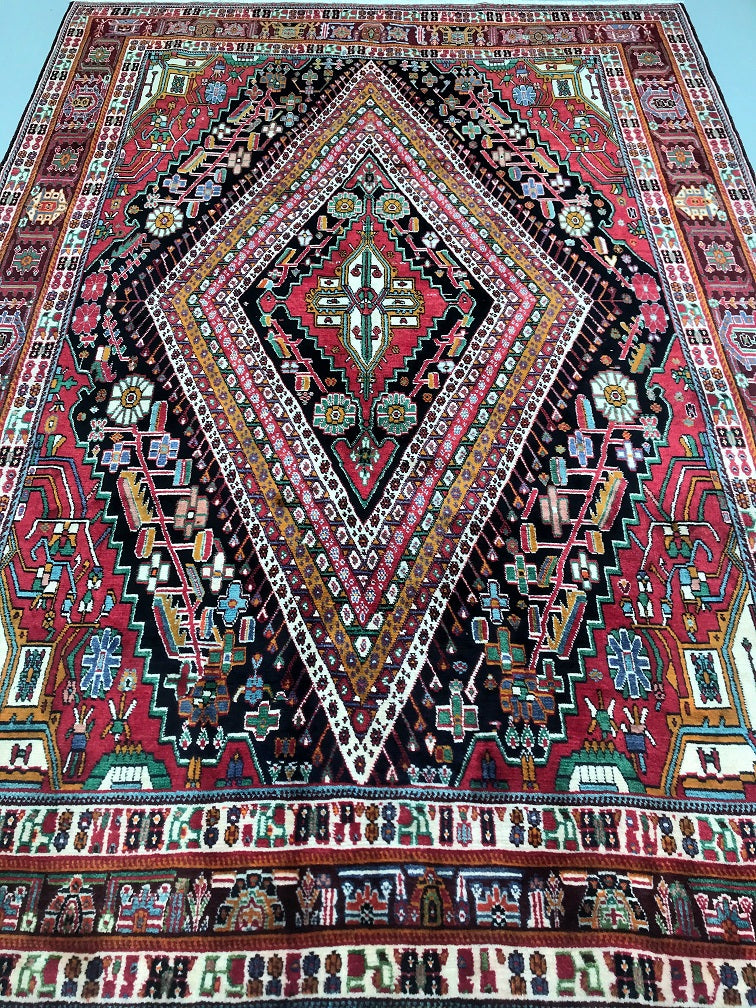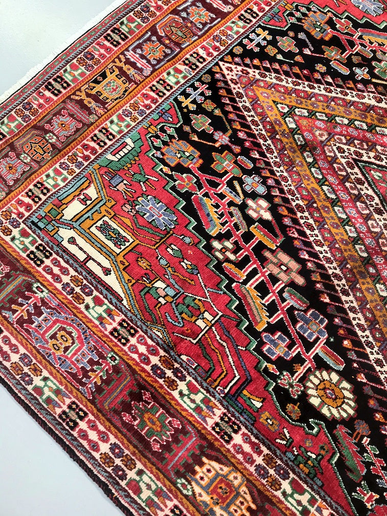 Full Room Size Hand Knotted Persian Qashkuli Shiaz Rug. Above All It Is A Dense Quality Rug Which Will Last You A Life Time. It Has Pure Hand Spun Wool Pile On Cotton Base. Multi-Colour Tone Dyed Using Traditional Methods.