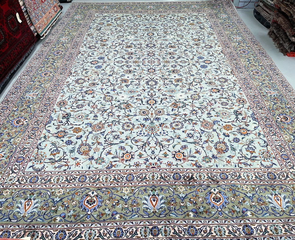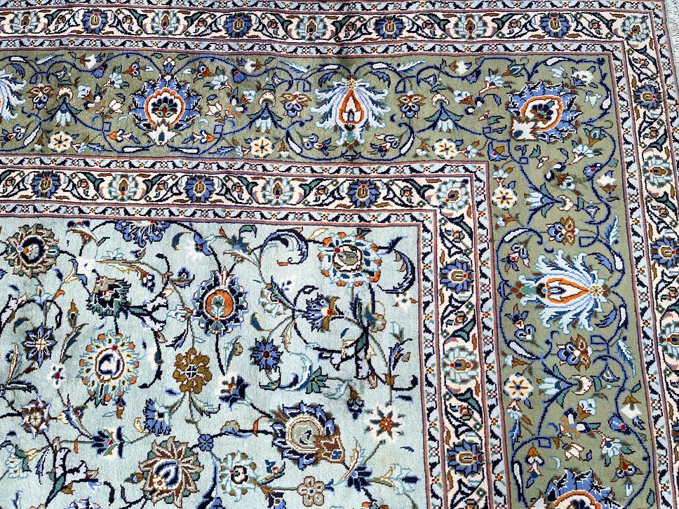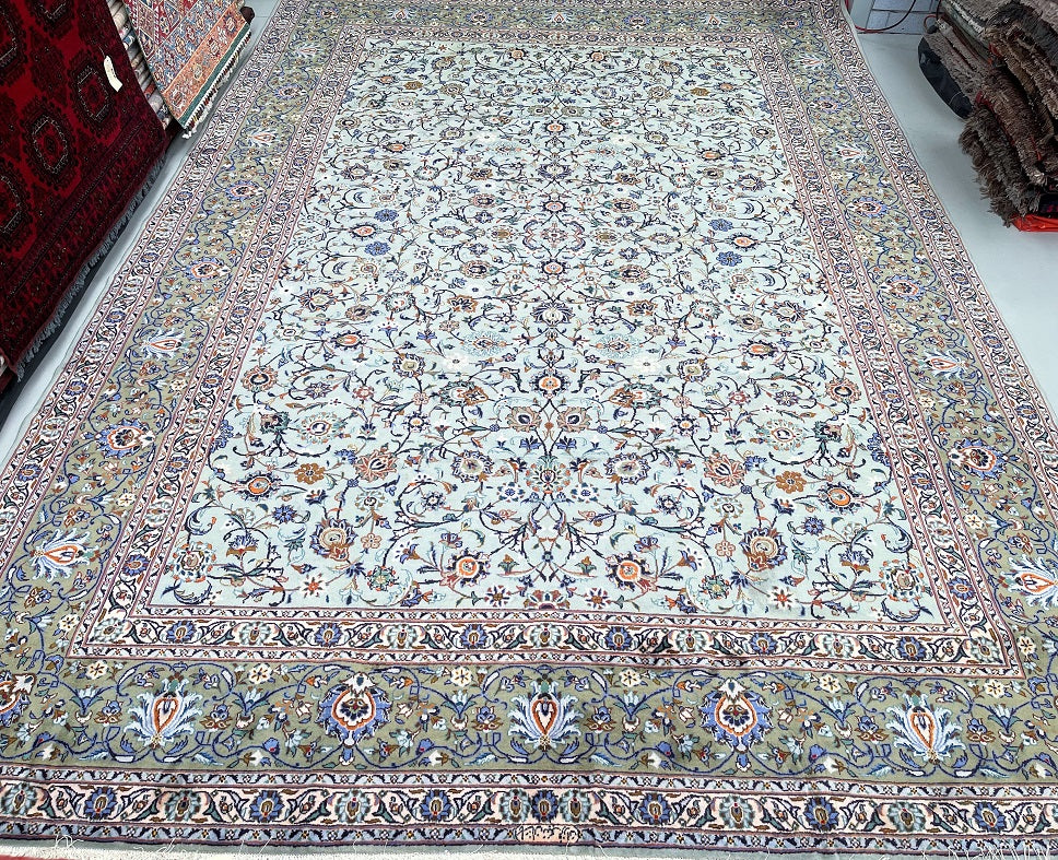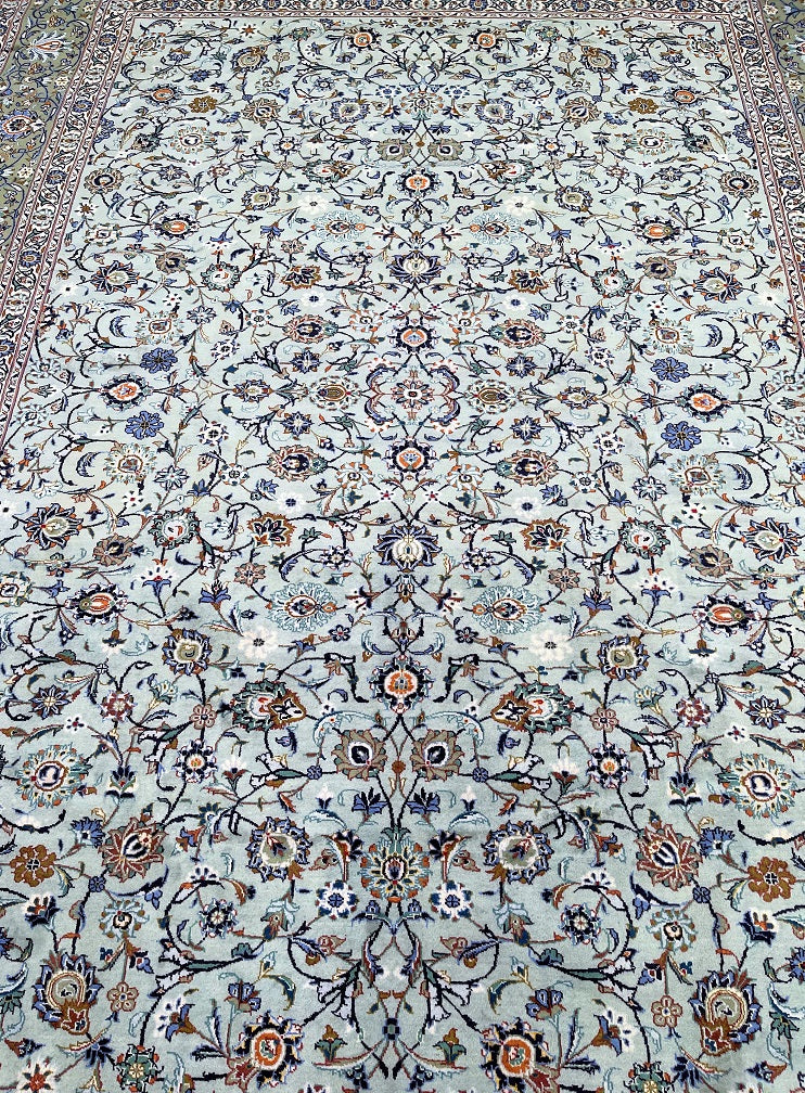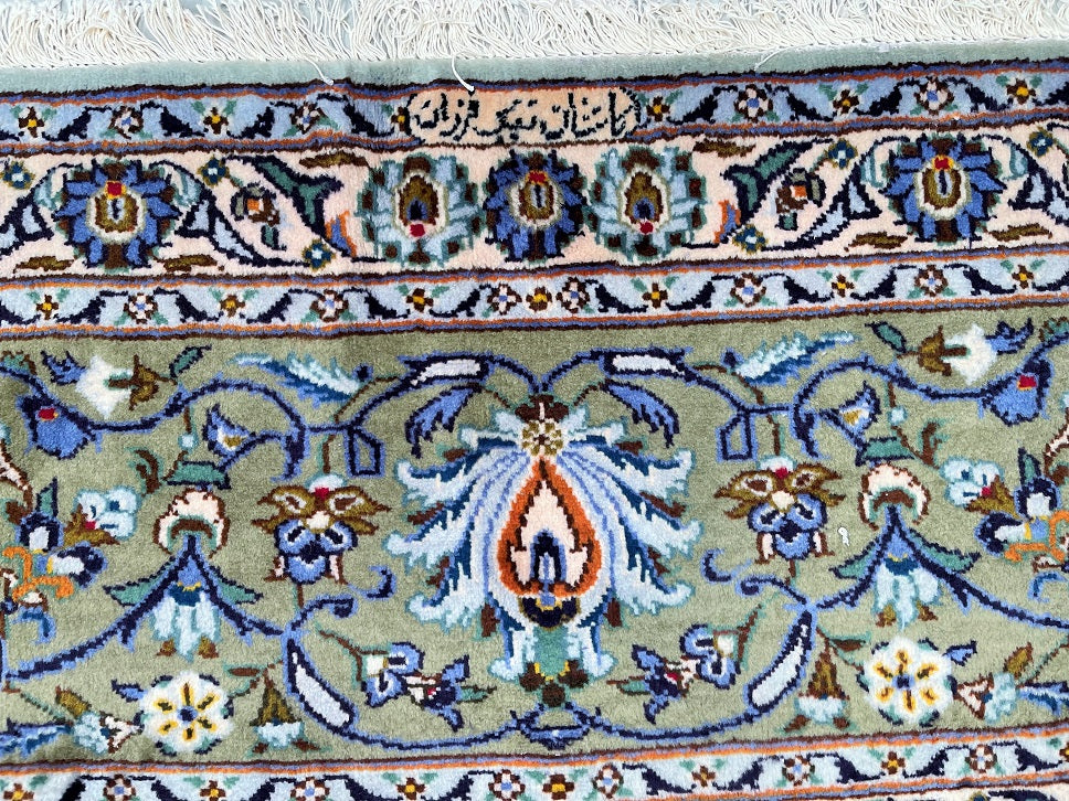 Large Room Size Authentic Handmade Vintage Persian Kashan Carpet. Above All It Is Hard To Get This Quality Hand Made Rug That Are Also Signed. Pure Lamb’s Wool Pile On Cotton Base. Beige, Brown, Pistachio And Blue Tone Dyed Using Traditional Methods. Dense Quality Piece From City Of Kashan.