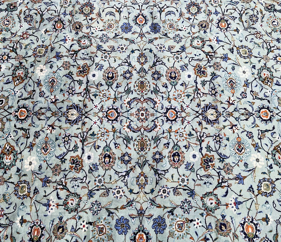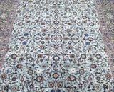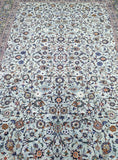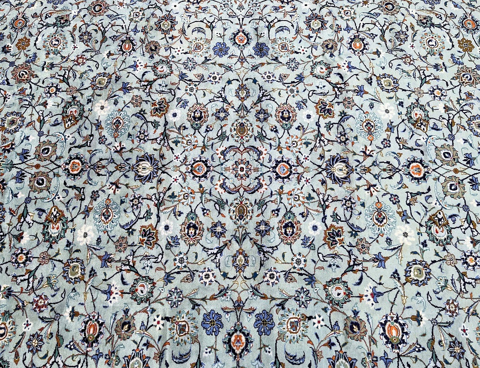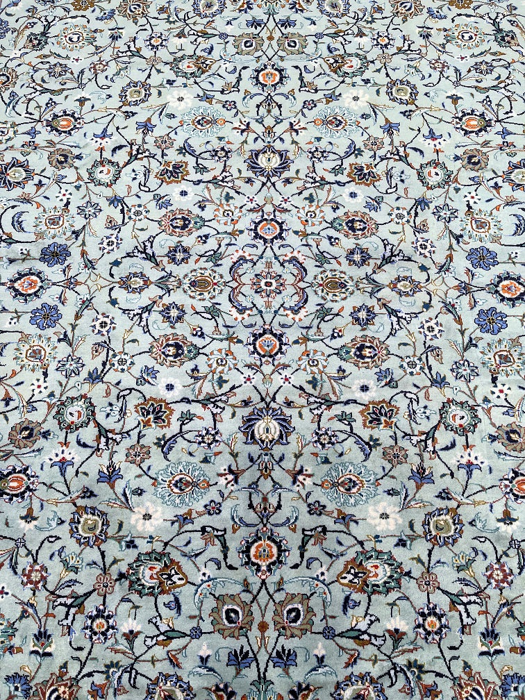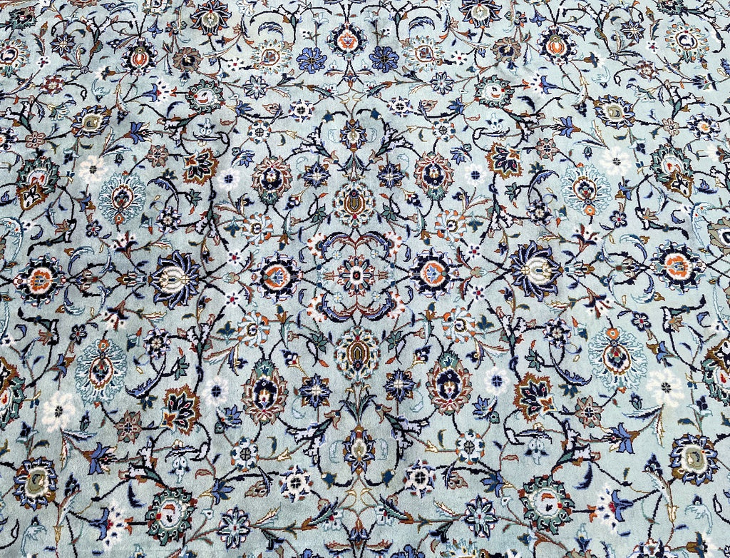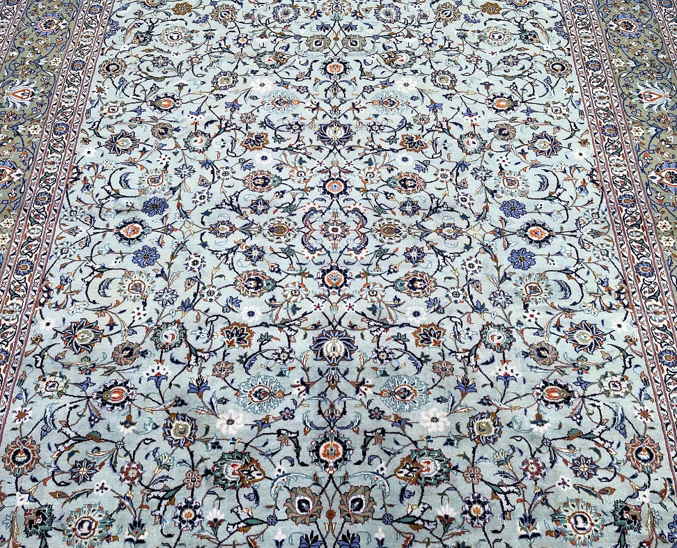 Large Room Size Authentic Handmade Vintage Persian Kashan Carpet. Above All It Is Hard To Get This Quality Hand Made Rug That Are Also Signed. Pure Lamb’s Wool Pile On Cotton Base. Beige, Brown, Pistachio And Blue Tone Dyed Using Traditional Methods. Dense Quality Piece From City Of Kashan.