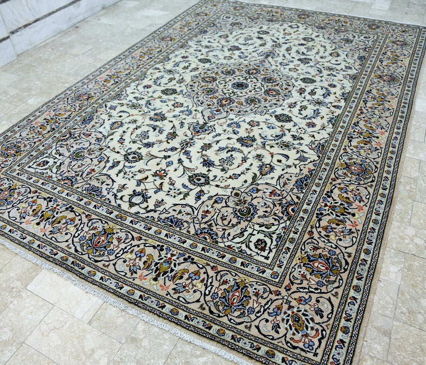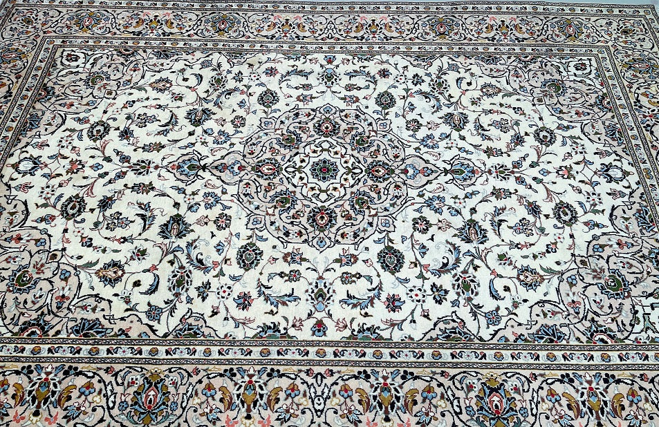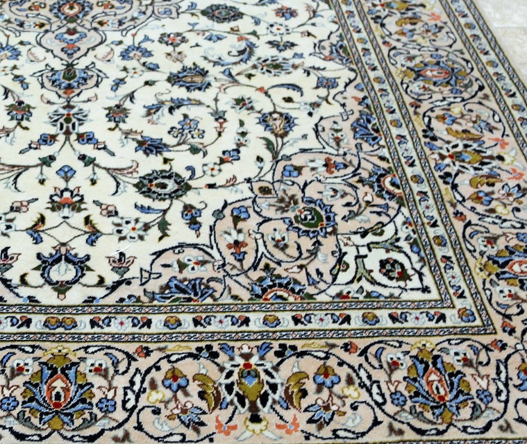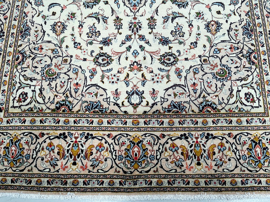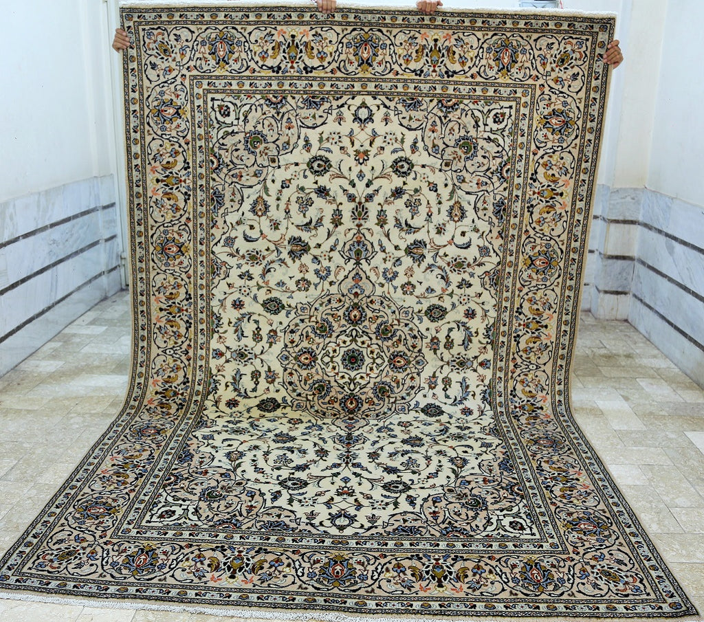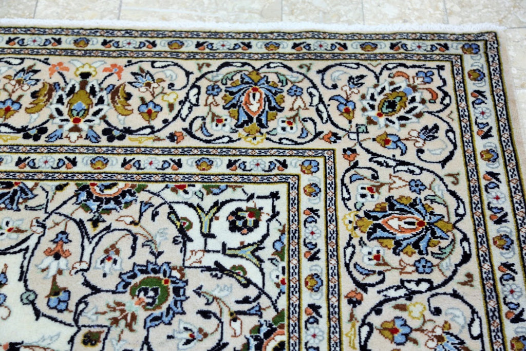 Full Room Size Authentic Handmade Persian Kashan Rug. It Also Has a Pure Lamb’s Wool Pile on Cotton Base. Beige, Blue, Mustard, Green, Red And Orange Tones Dyed Using Traditional Methods.