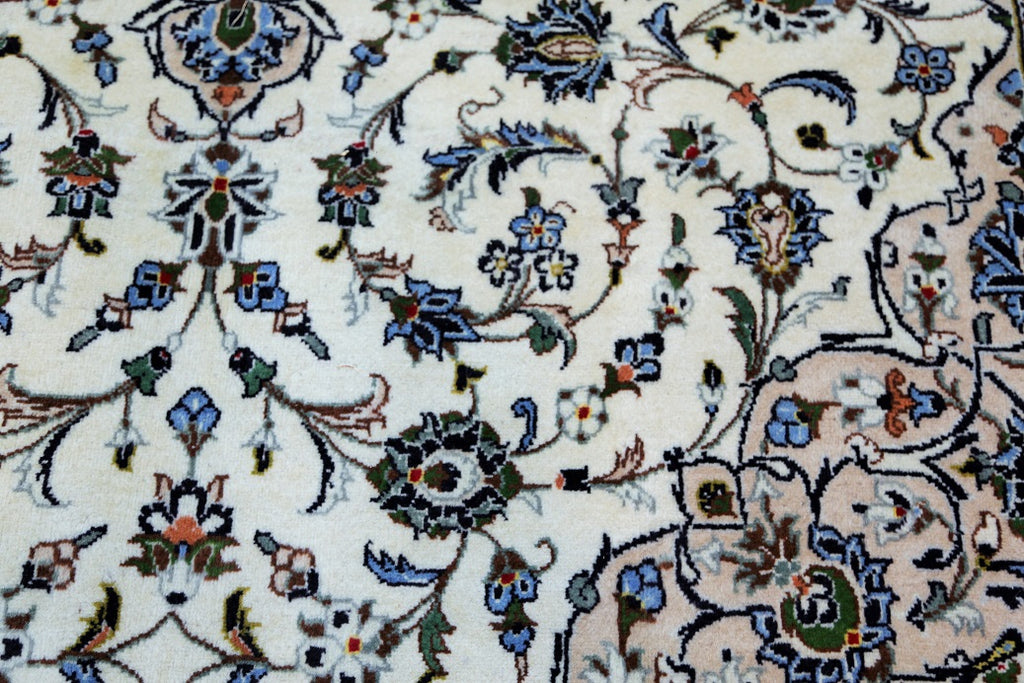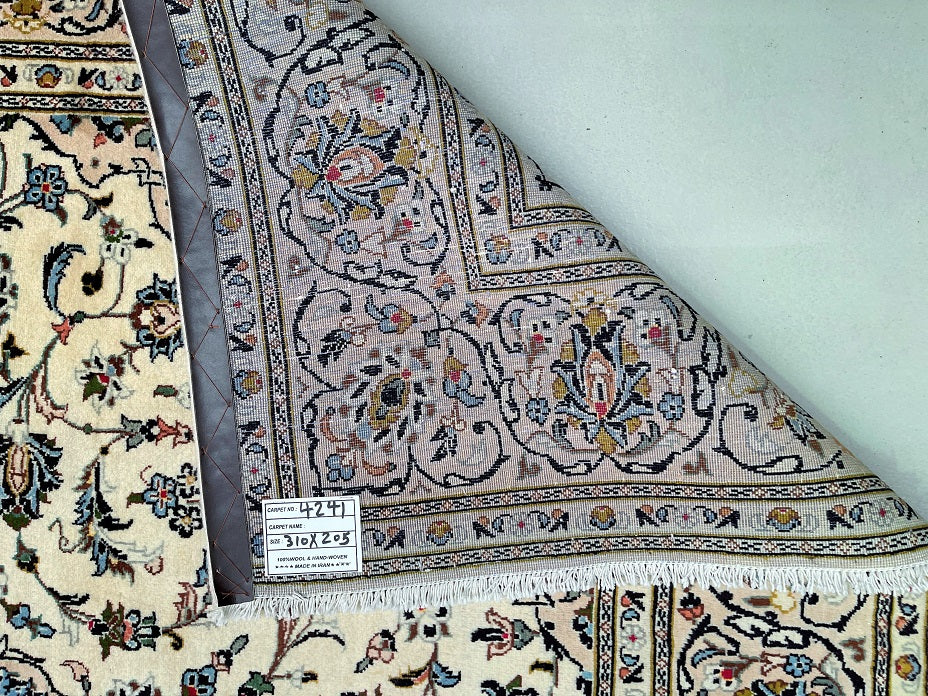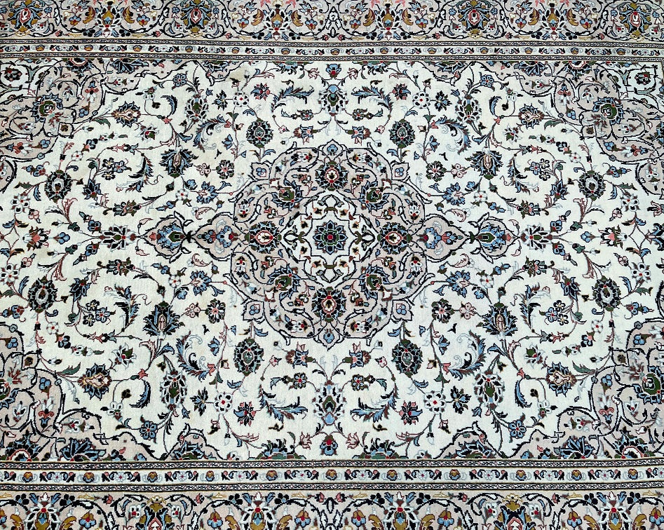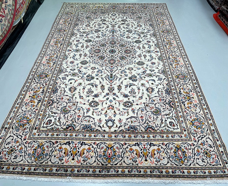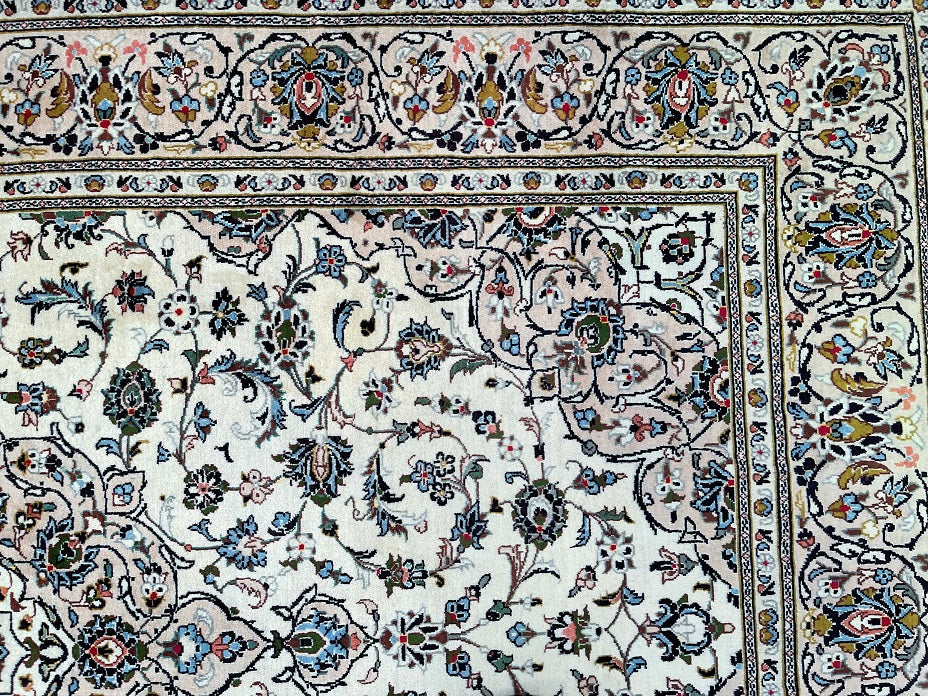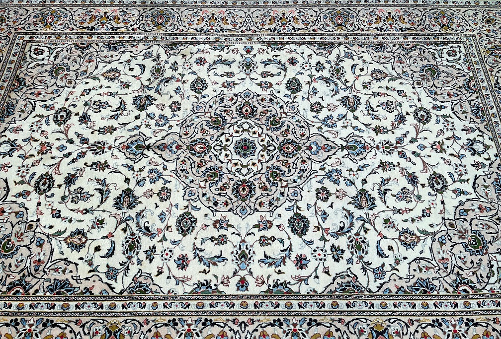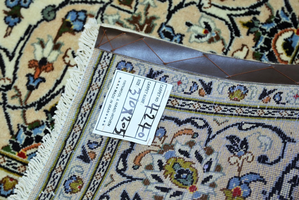 Full Room Size Authentic Handmade Persian Kashan Rug. It Also Has a Pure Lamb’s Wool Pile on Cotton Base. Beige, Blue, Mustard, Green, Red And Orange Tones Dyed Using Traditional Methods.