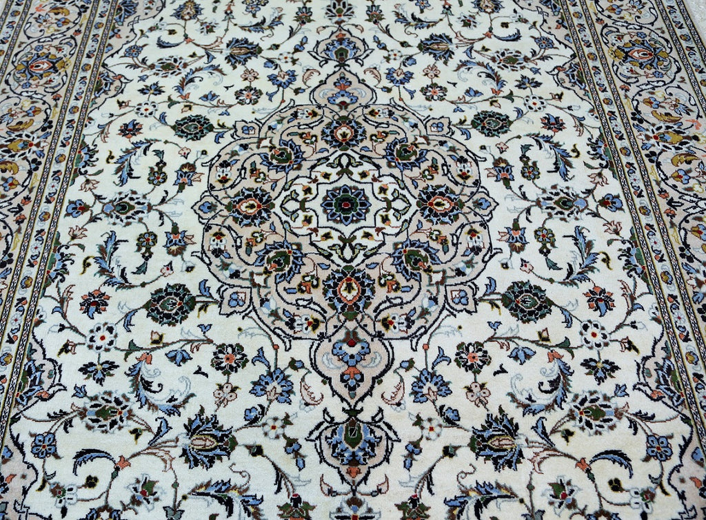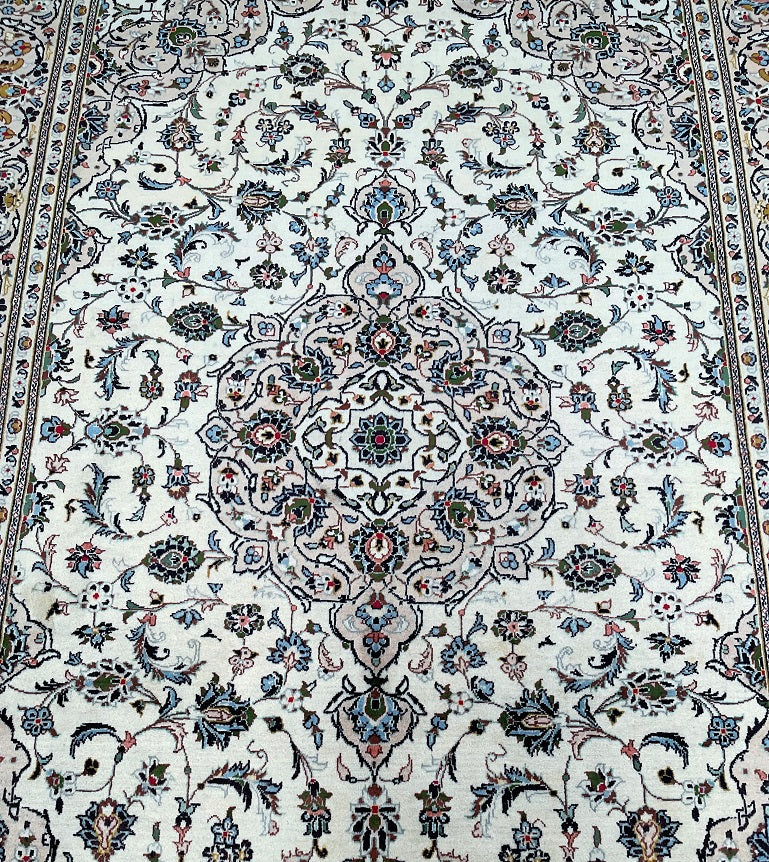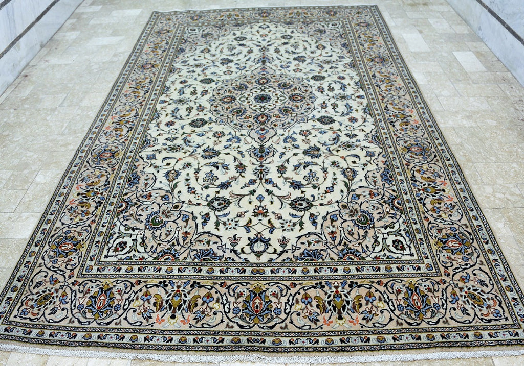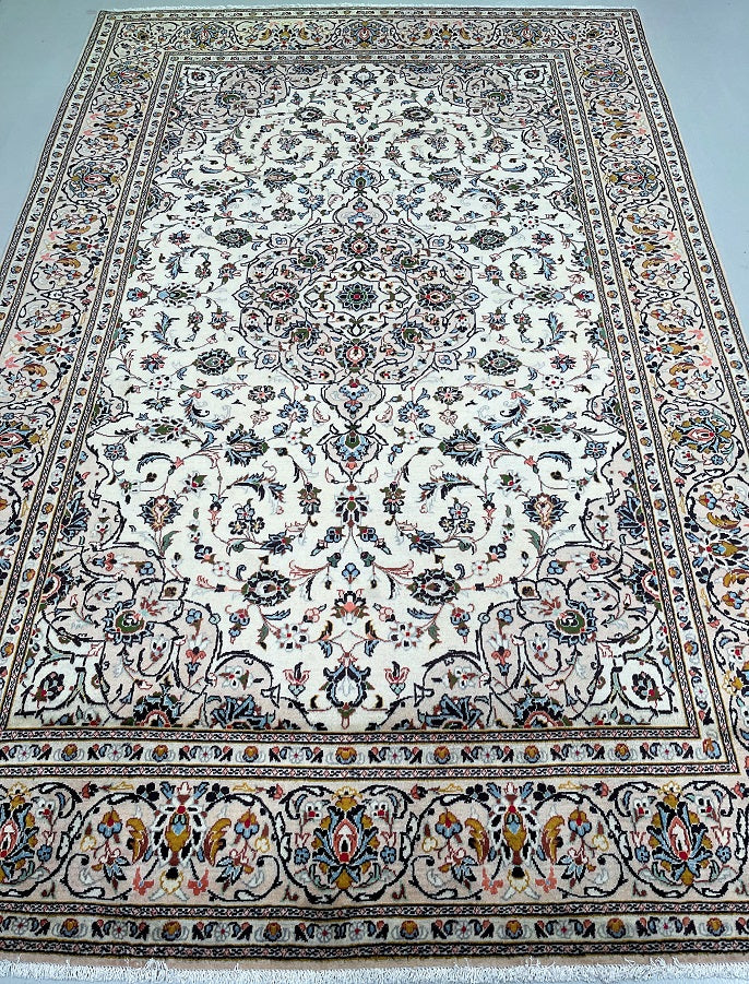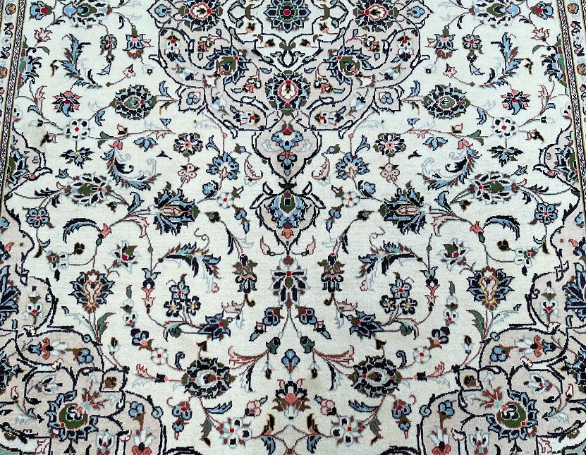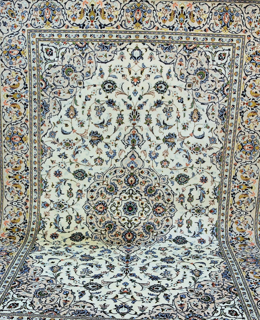 Full Room Size Authentic Handmade Persian Kashan Rug. It Also Has a Pure Lamb’s Wool Pile on Cotton Base. Beige, Blue, Mustard, Green, Red And Orange Tones Dyed Using Traditional Methods.