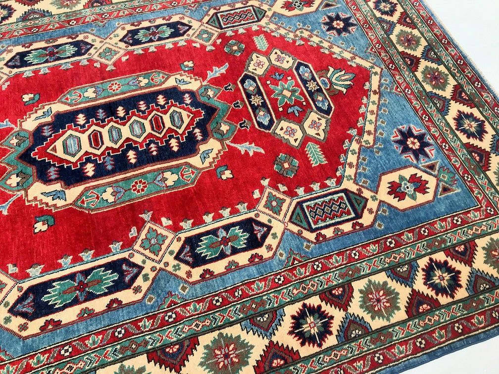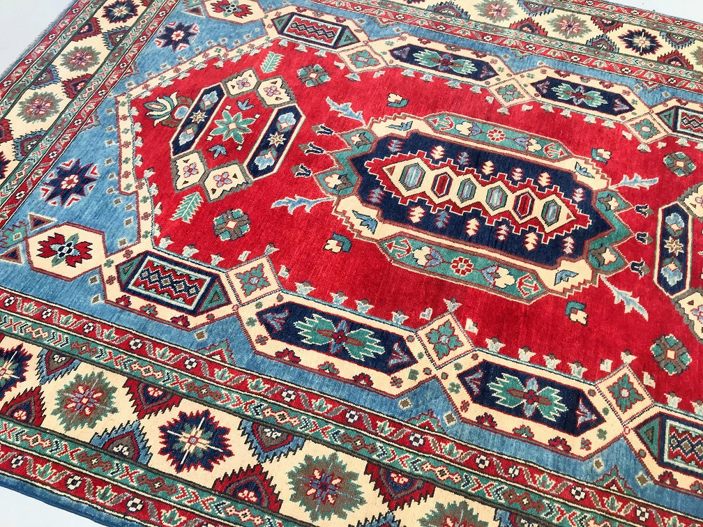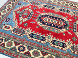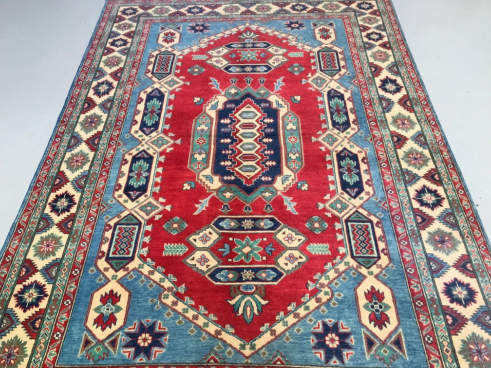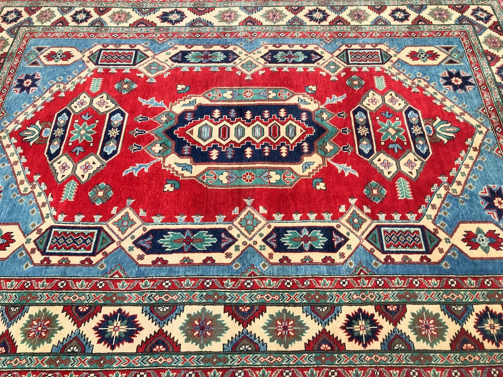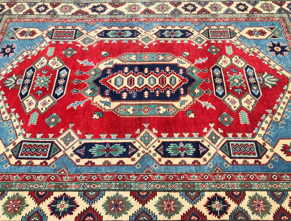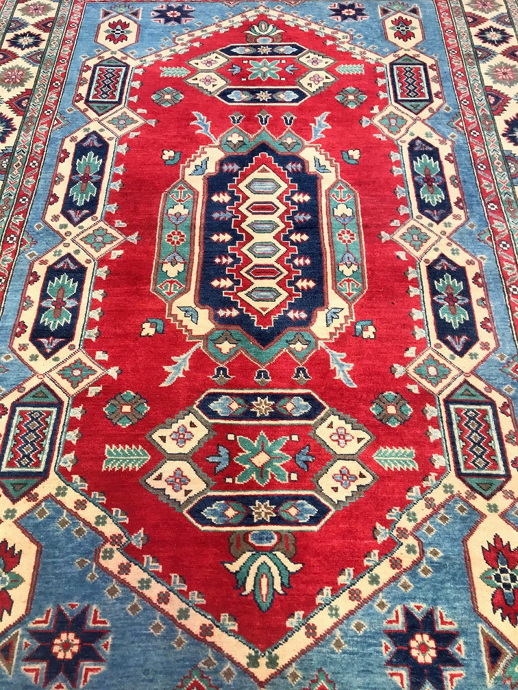 Full Room Size Caucasian Design Afghan Kazak Rug. Above All It Has a Pure Hand Spun Wool Pile On Cotton Base. French Blue, beige And Red Tone Dyed Using Traditional Methods (Vegetable Dyes). Last of True Woven Tribal Art.