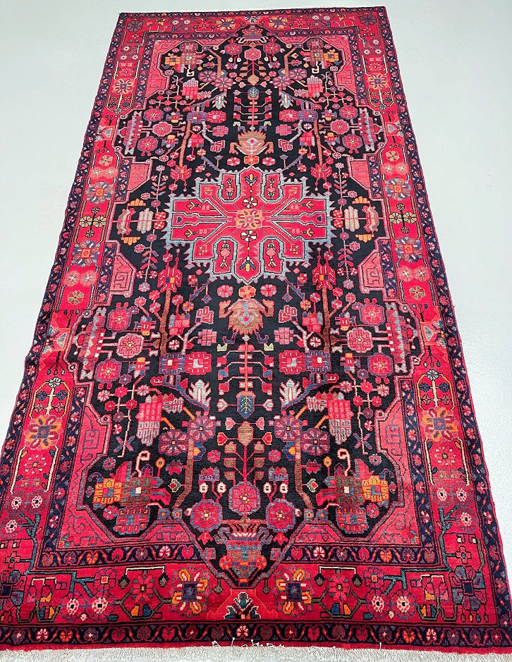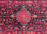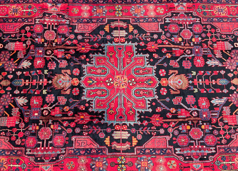 Full Room Size Hand Knotted Nahavand Rug. It Also Can Be Used As A Wide Corridor Piece. Pure Hand Spun Wool Pile On Cotton Base. Indigo Blue/Black, Red, Beige, Pink, Light Blue And Orange Tones Dyed Using Traditional Methods.