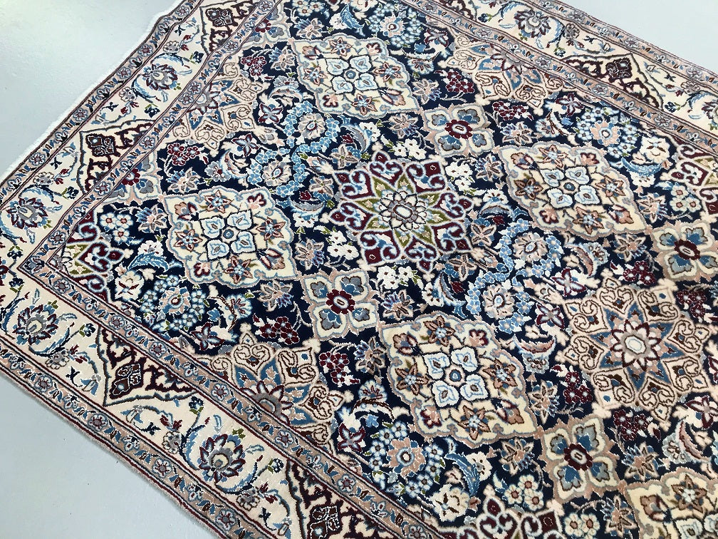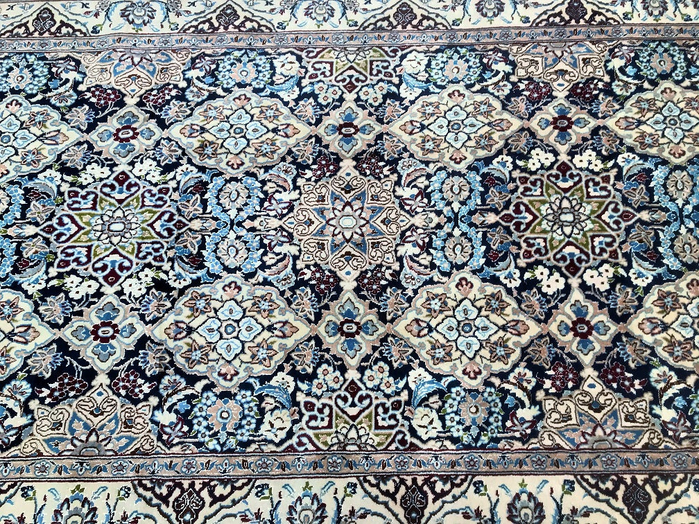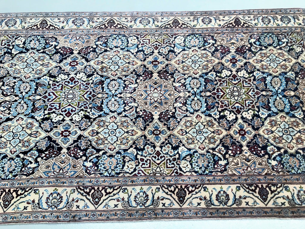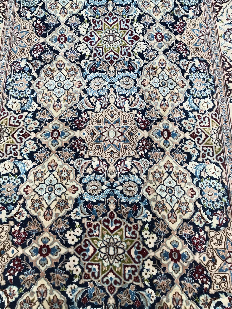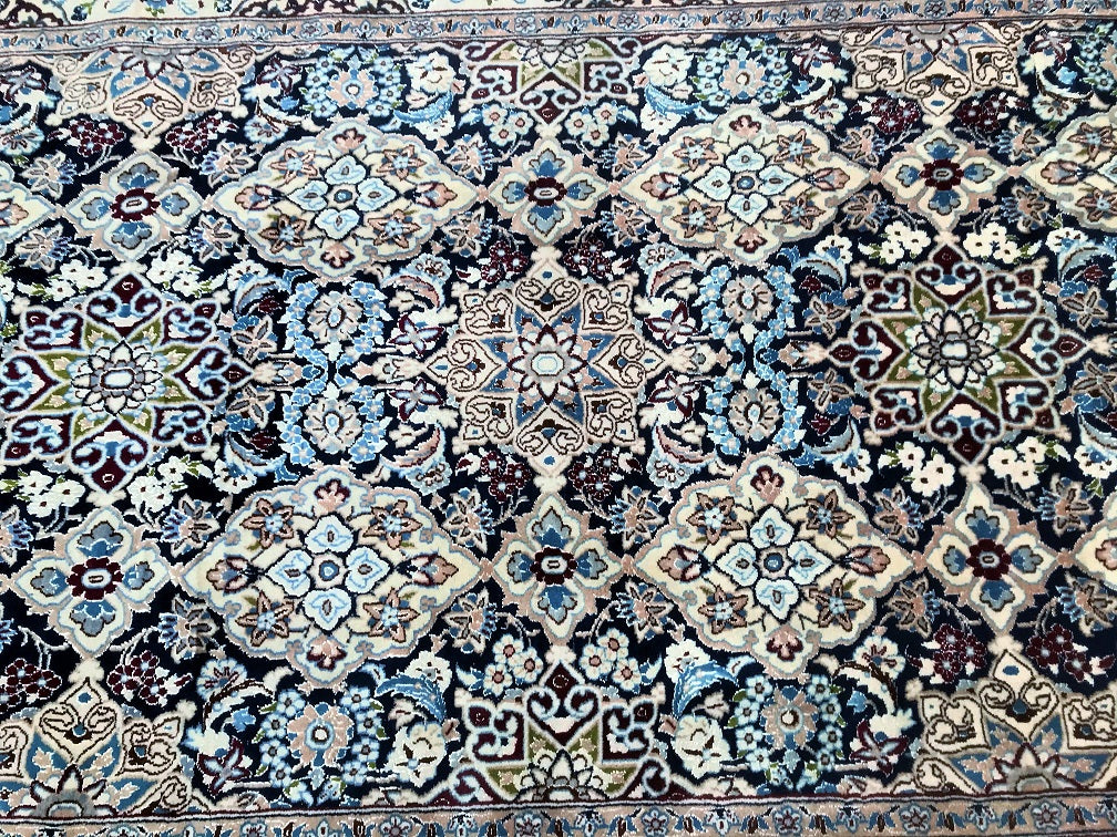 Superfine Coffee Table Size Authentic Handmade Persian Silkinlaid Nain Rug. Above All It Has A Very Unique Design Which Is Hard To Find. Never The Less It Has A Lamb’s Wool Pile And Silk Highlights On Cotton Base. Indigo Blue And Beige Tone Dyed Using Traditional Methods. Superb Quality Piece From City Of Nain.