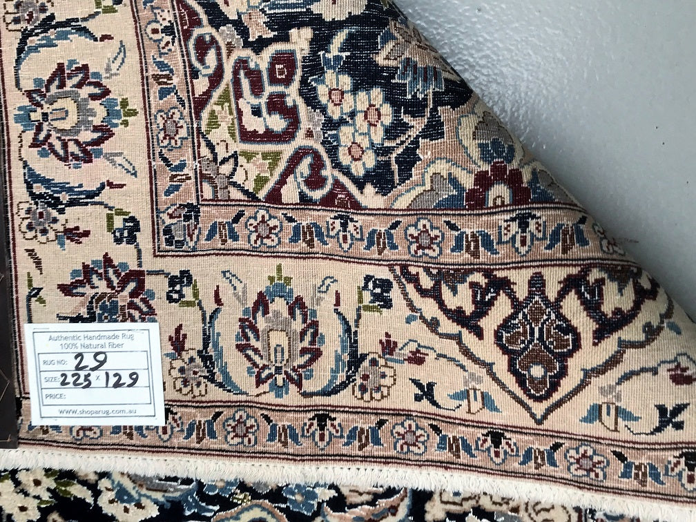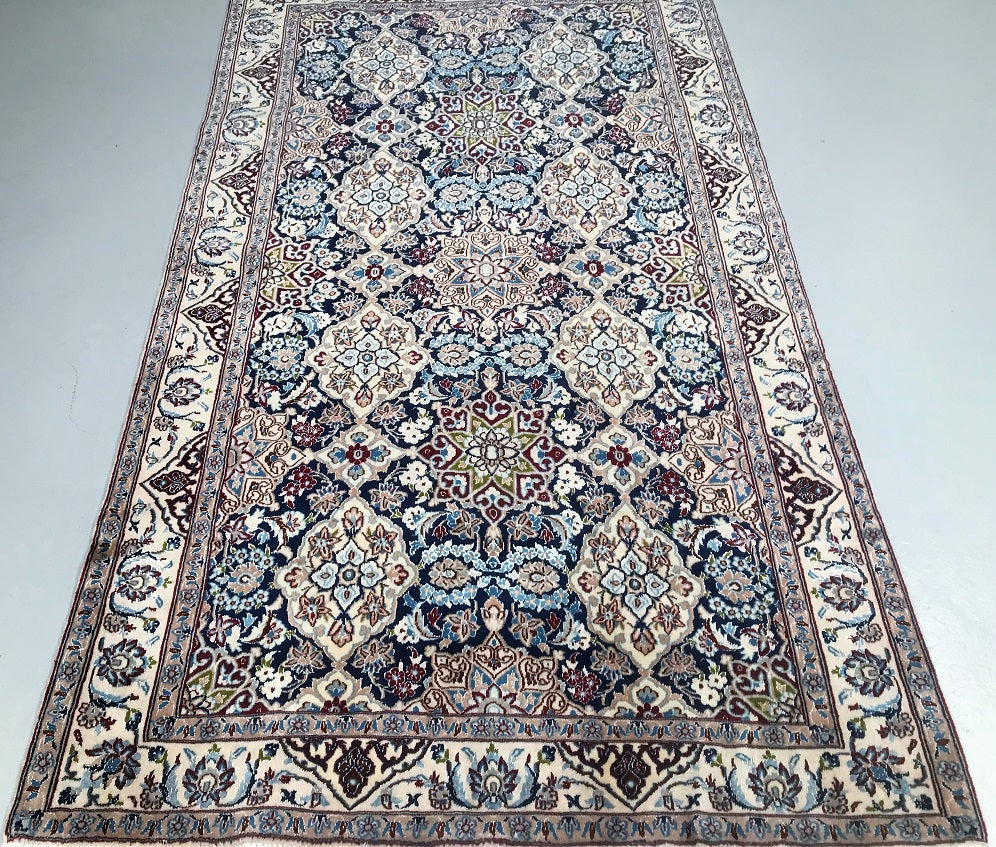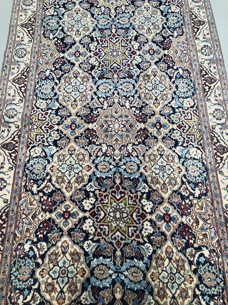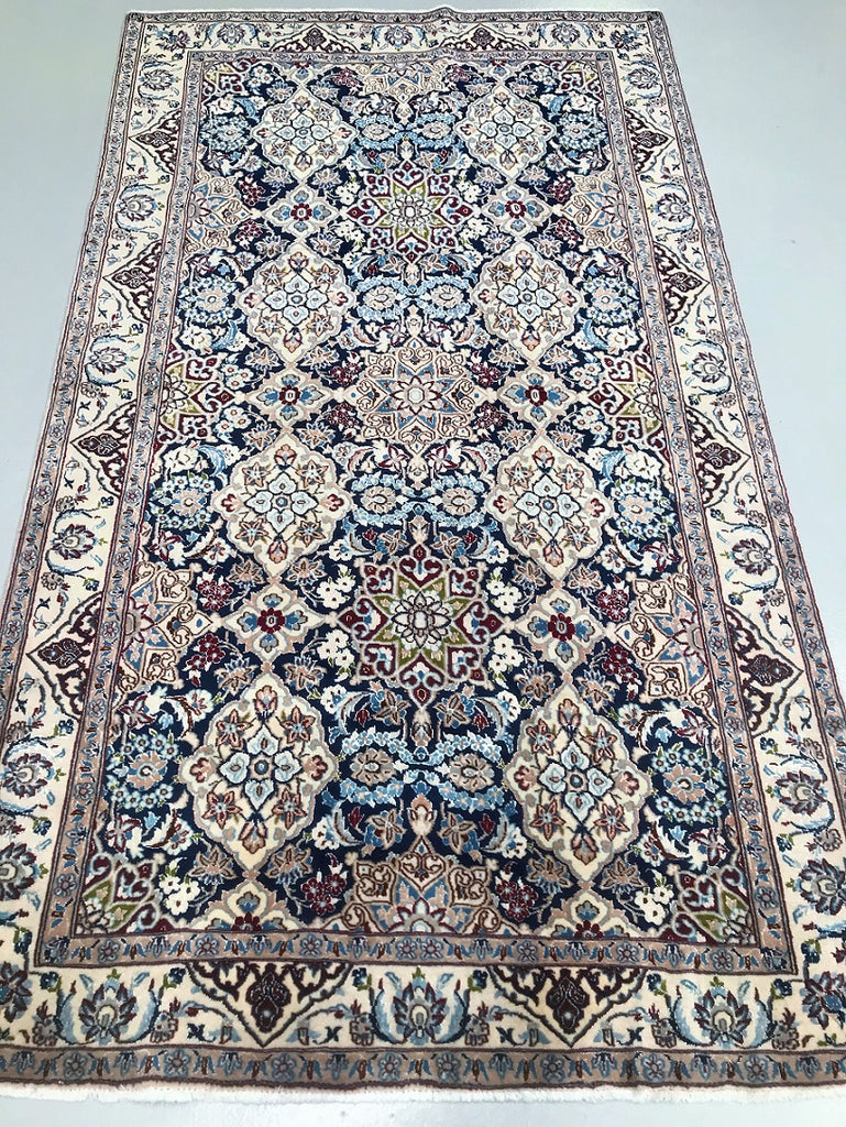 Superfine Coffee Table Size Authentic Handmade Persian Silkinlaid Nain Rug. Above All It Has A Very Unique Design Which Is Hard To Find. Never The Less It Has A Lamb’s Wool Pile And Silk Highlights On Cotton Base. Indigo Blue And Beige Tone Dyed Using Traditional Methods. Superb Quality Piece From City Of Nain.