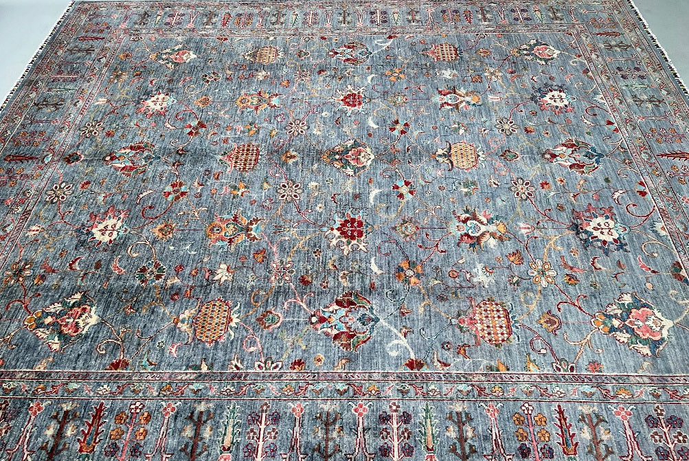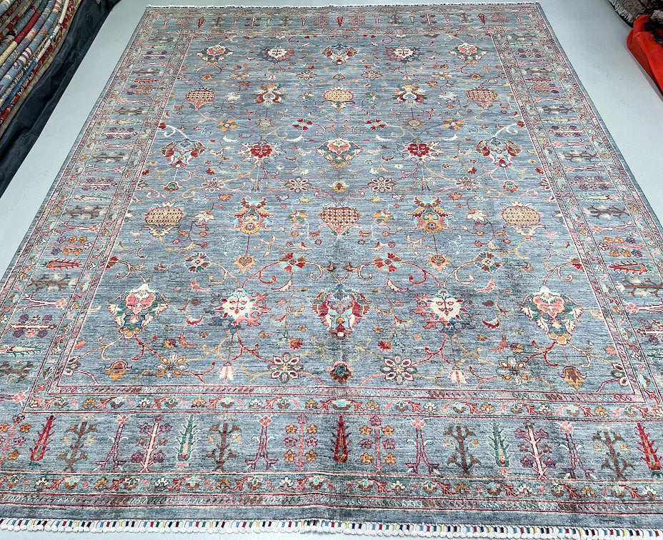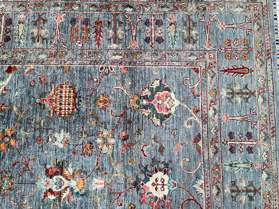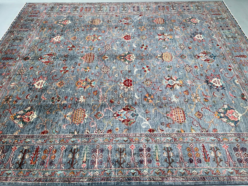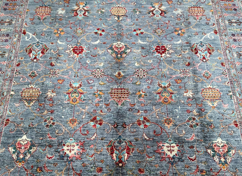 Superb Quality Large Room Size Hand Knotted Sultani Afghan Chobi Rug. Above All It Is Pure Lamb’s Wool Pile On Cotton Base. Grey Blue, Beige, Pink, Maroon, Turquoise And Orange Tone Dyed Using Traditional Methods (Vegetable Dyes). Last of True Woven Nomadic Art.