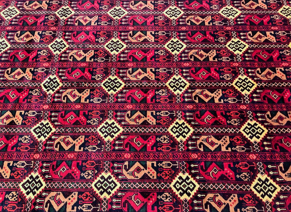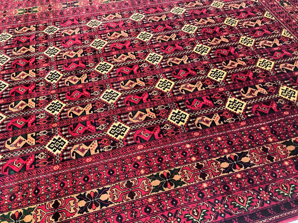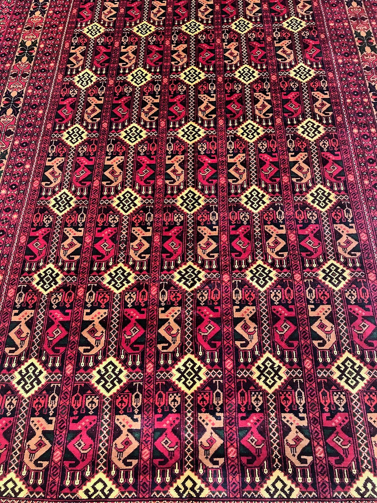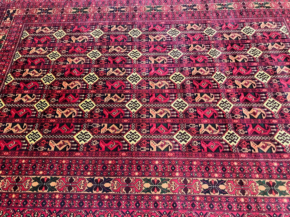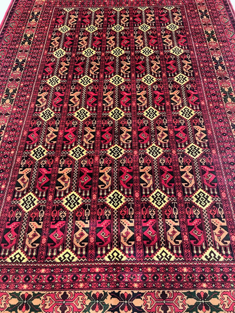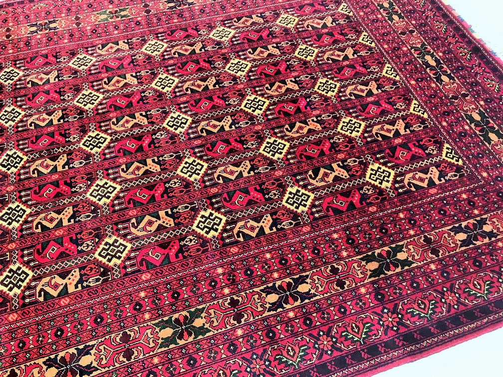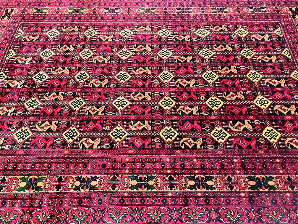 Superb Full Room Size Hand Knotted Beljick Afghan Rug. Above All Beljick Is The Finest Quality Of Afghan Rugs In The Market. It Has A Pure Hand Spun Wool Merino Wool Pile On Cotton Base. It Also Has A Rich Burnt Terracotta/Burgundy and Indigo Blue Tone Dyed Using Traditional Methods.