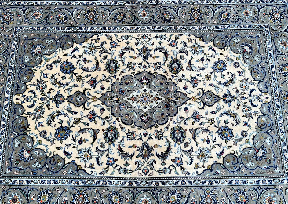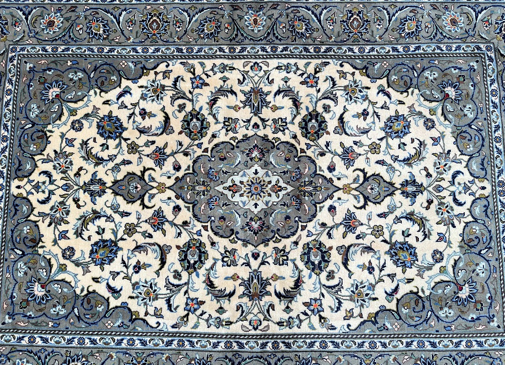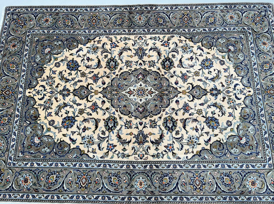 Superb quality authentic handmade Persian Kashan rug. It has a pure lamb’s wool pile (Kork) on cotton base. Stunning Beige, Blue, brown And Pistachio Green tones dyed using traditional methods. Dense weave from city of Kashan.