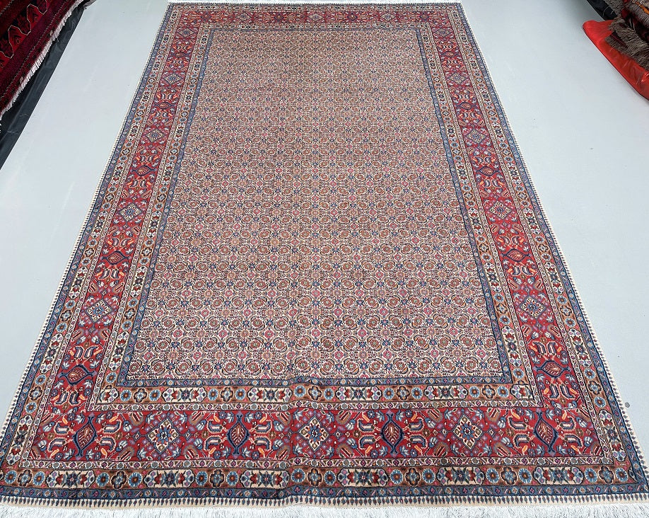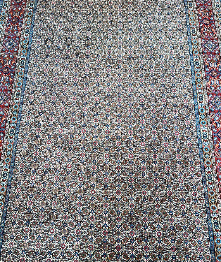 Superfine Full Room Size Authentic Hand Knotted Birjand Rug. Above All It Has A Lamb’s Wool And Silk Inlaid Pile On Fine Cotton Base. Beige, Red, Orange, Blue, Pink And Green Tones Dyed Using Traditional Methods.