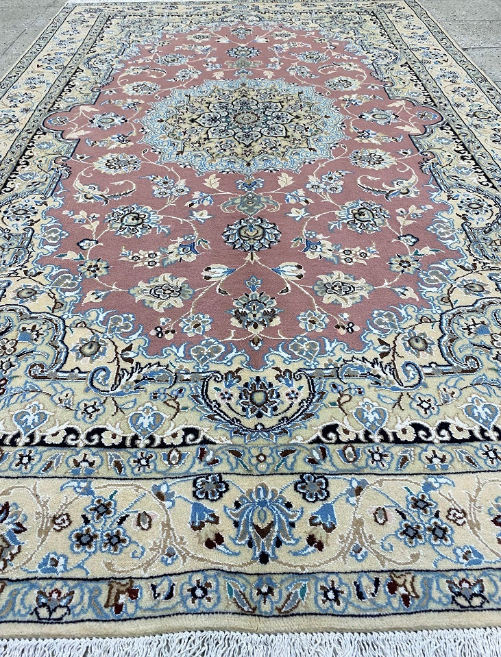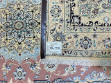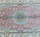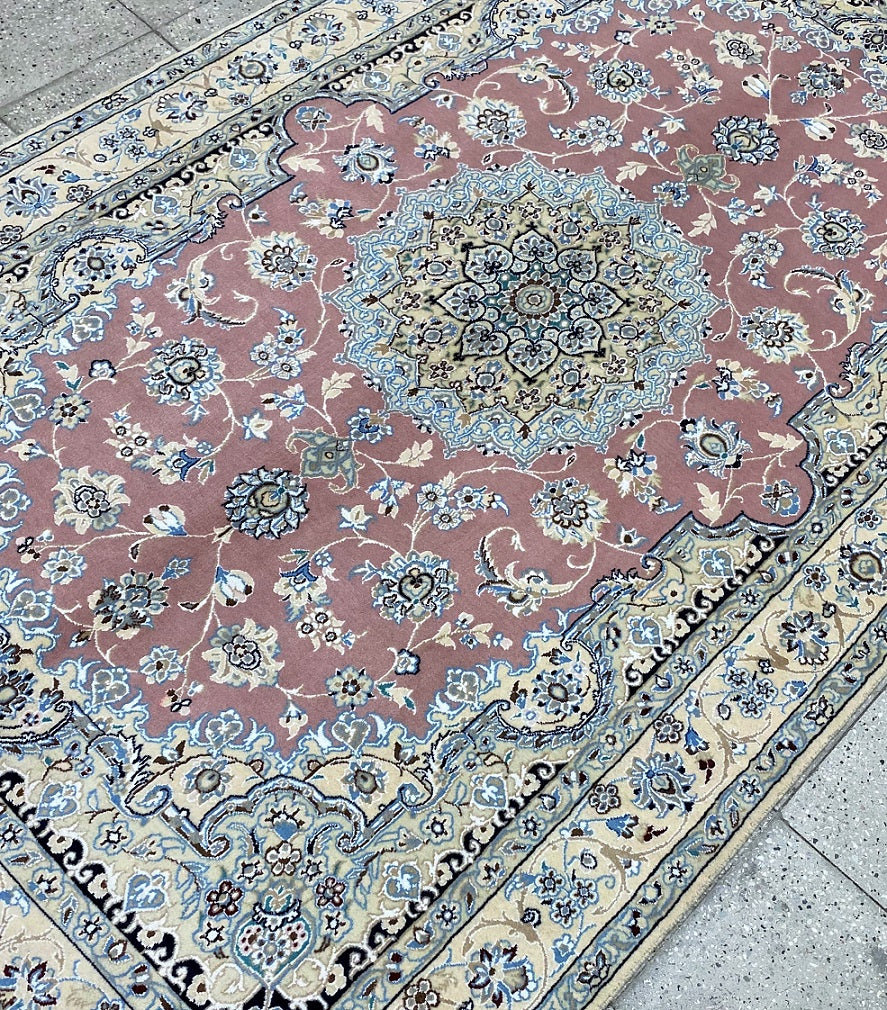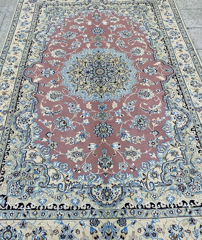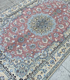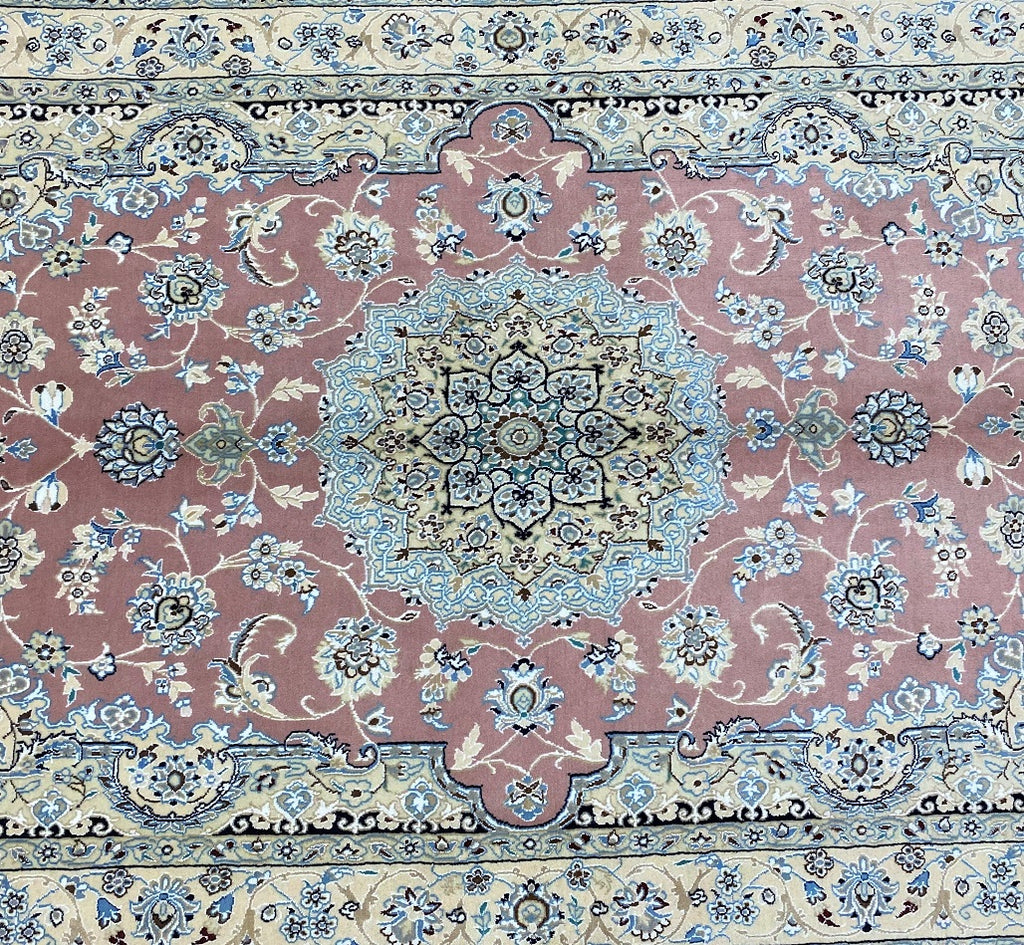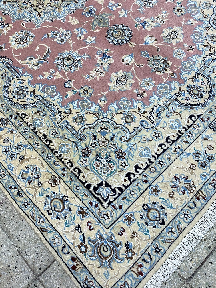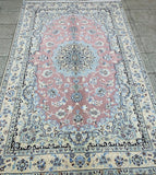 Superfine Room Size Authentic Hand Knotted Persian Nain Rug. Above All It Is Hard To Get This Quality Original Handmade Rugs In Such Unique Colours. Never The Less Its Pure Lamb’s Wool Pile on Cotton Base. Pastel Pink Background Dyed Using Traditional Methods.